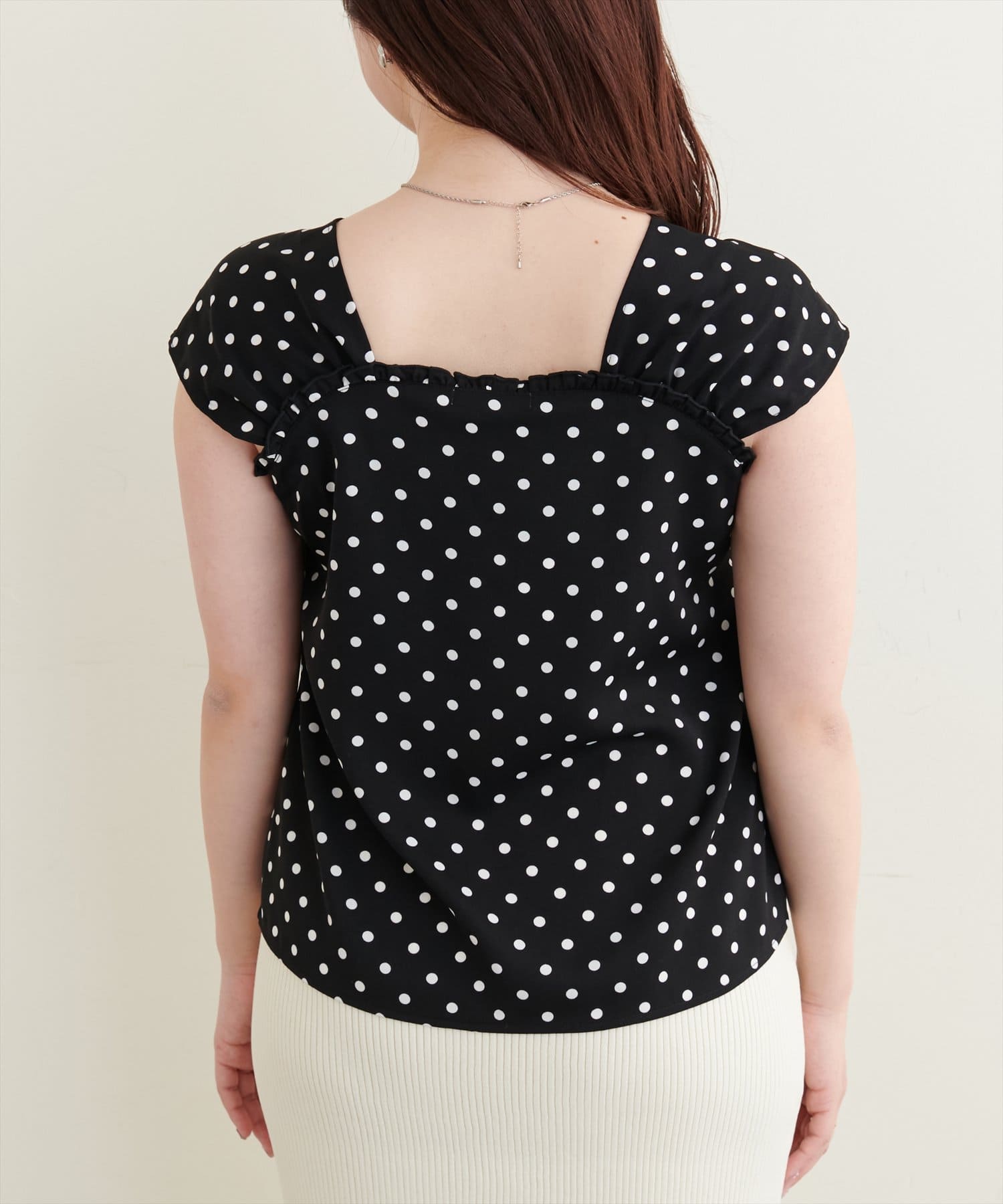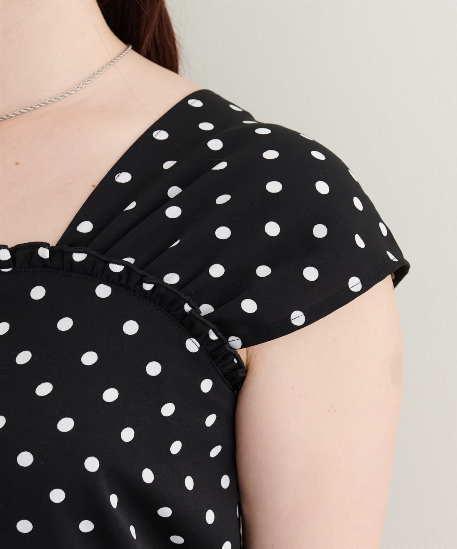 また、胸元のフリルは甘すぎないメロー始末で大人の女性にピッタリの1枚。