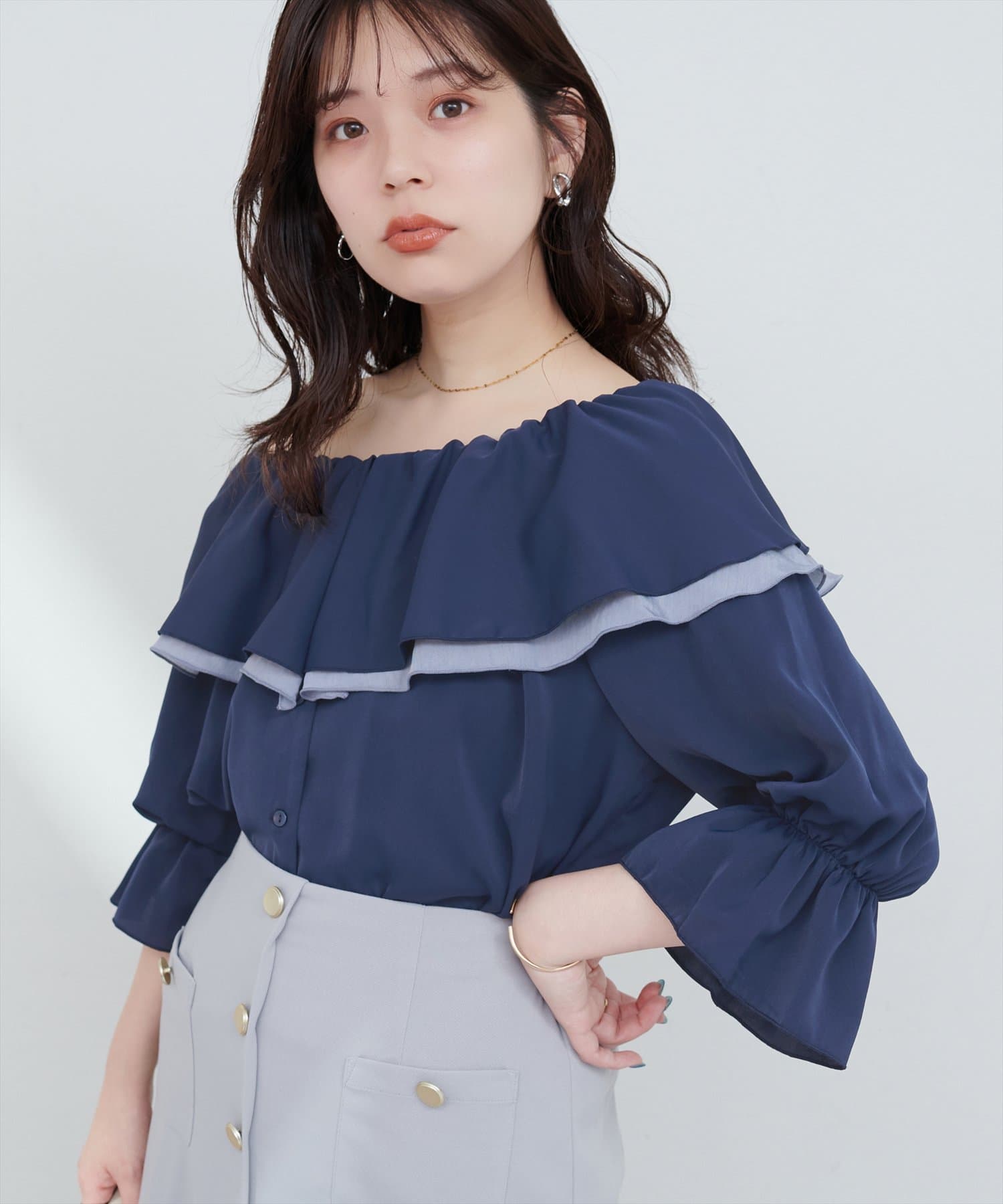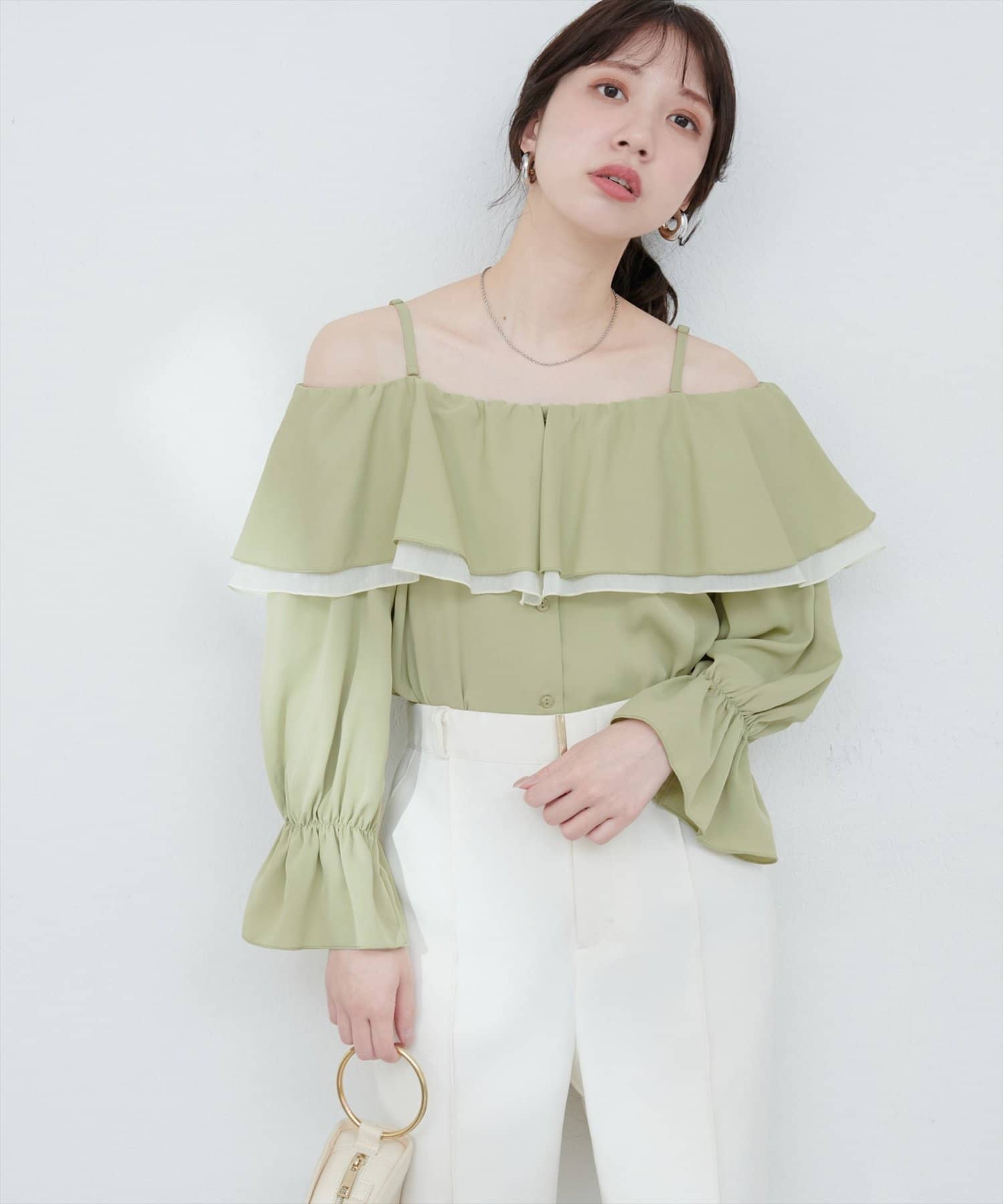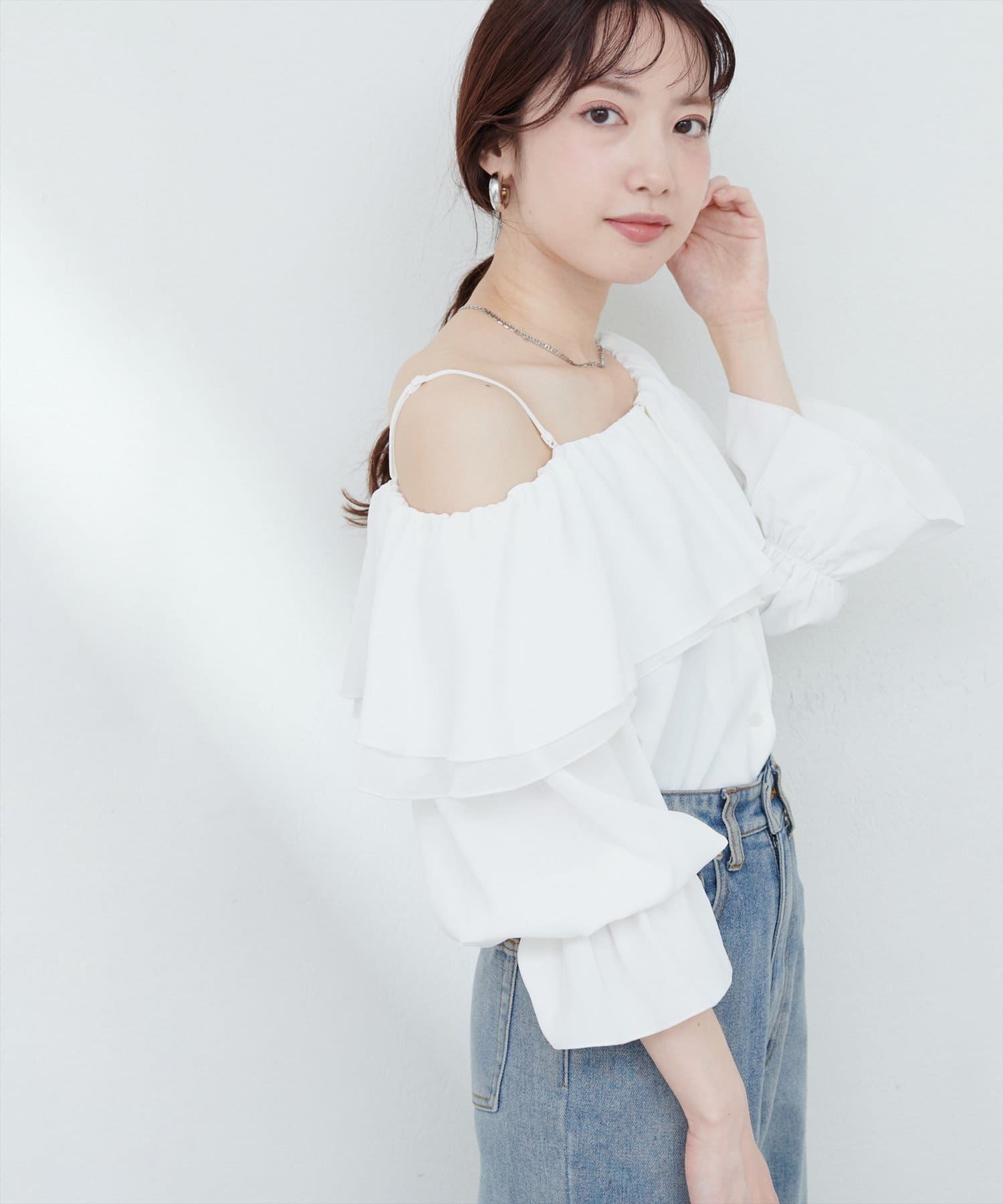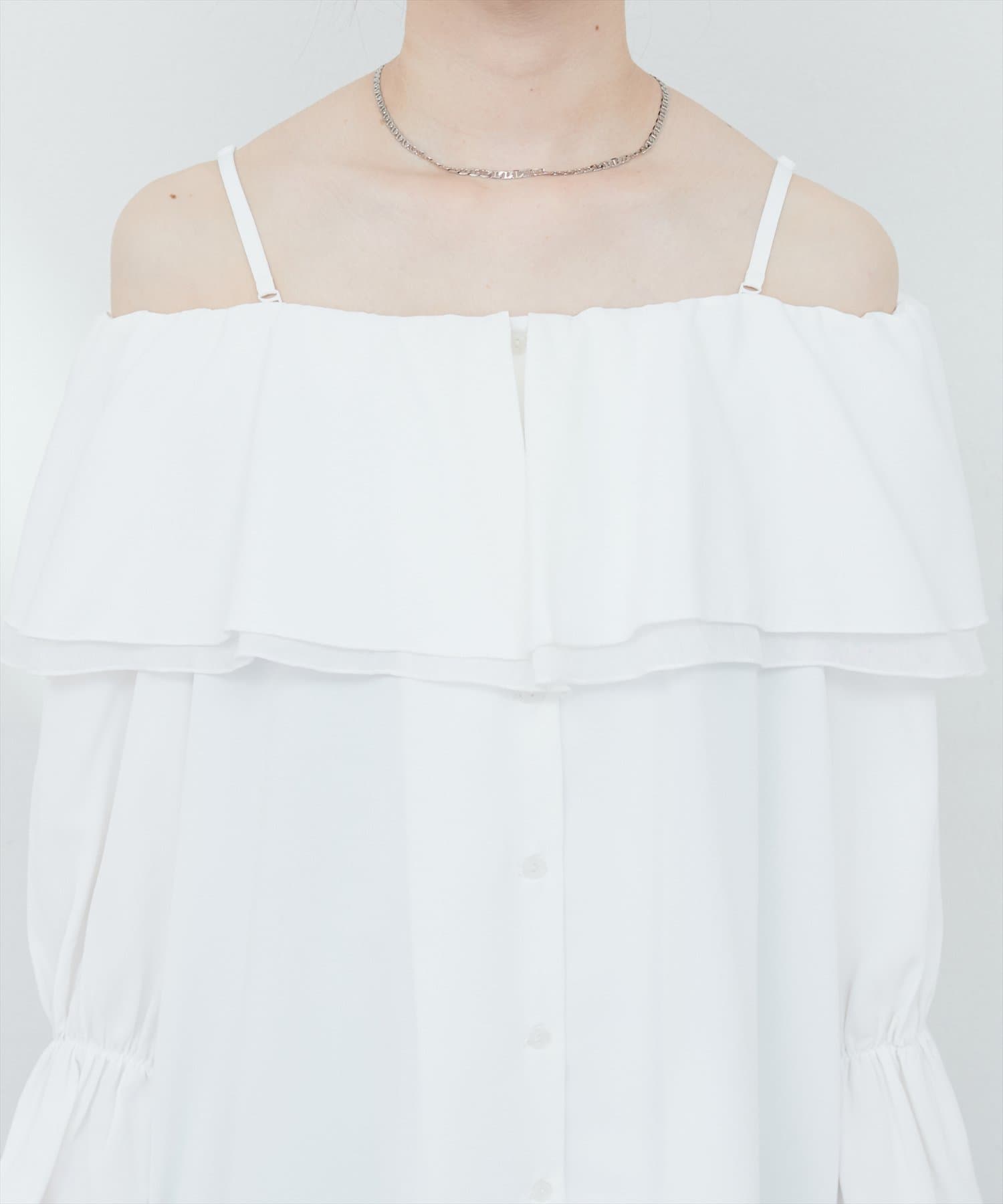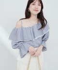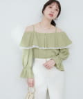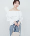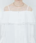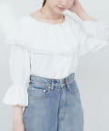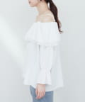 ふんわりと肩を飾るフリルが、女性らしさを引き立てるマルチWAYブラウス。