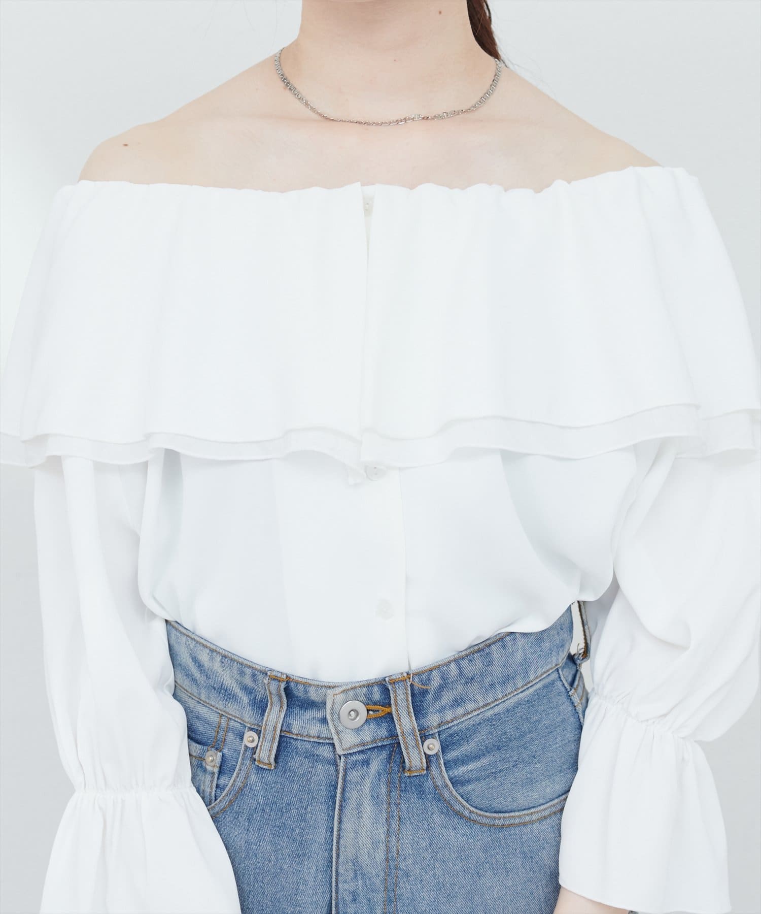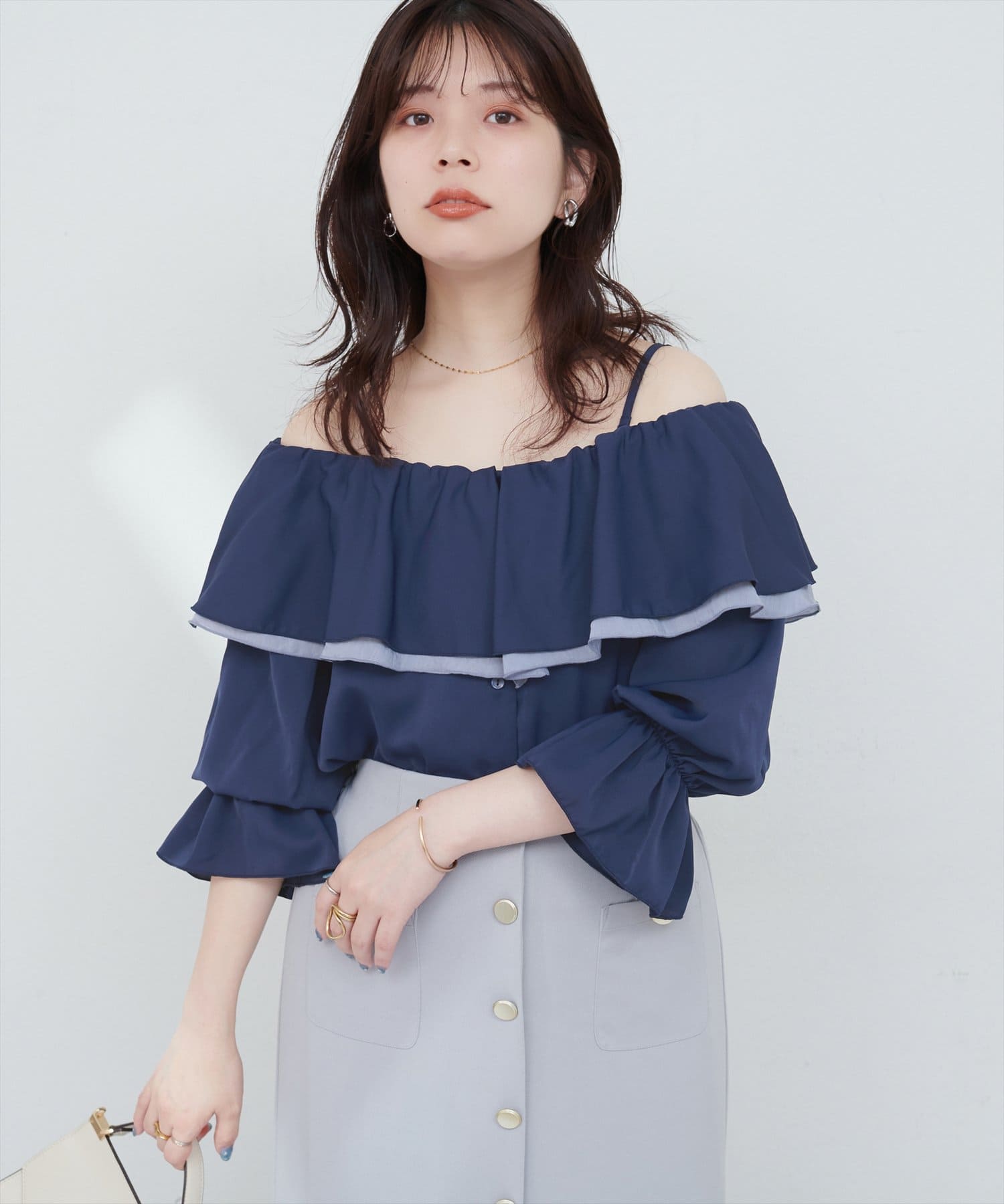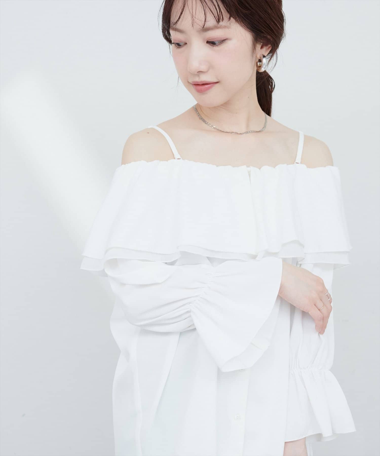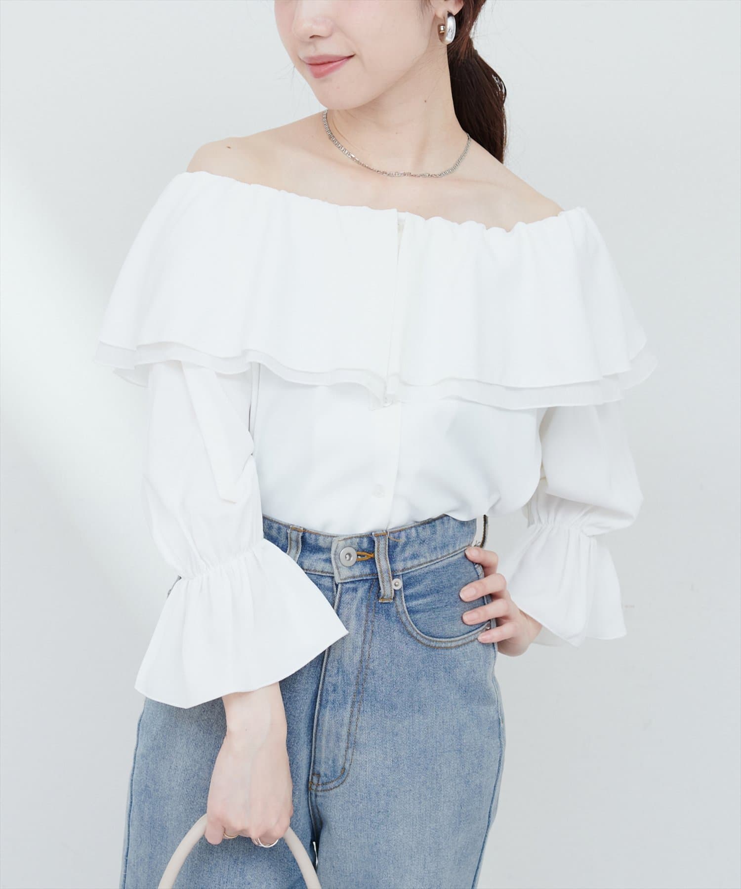 ふんわりと肩を飾るフリルが、女性らしさを引き立てるマルチWAYブラウス。