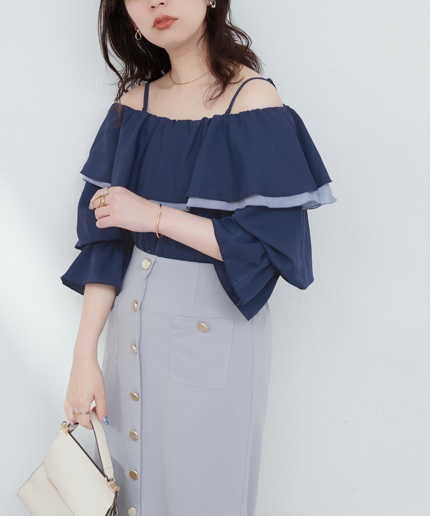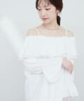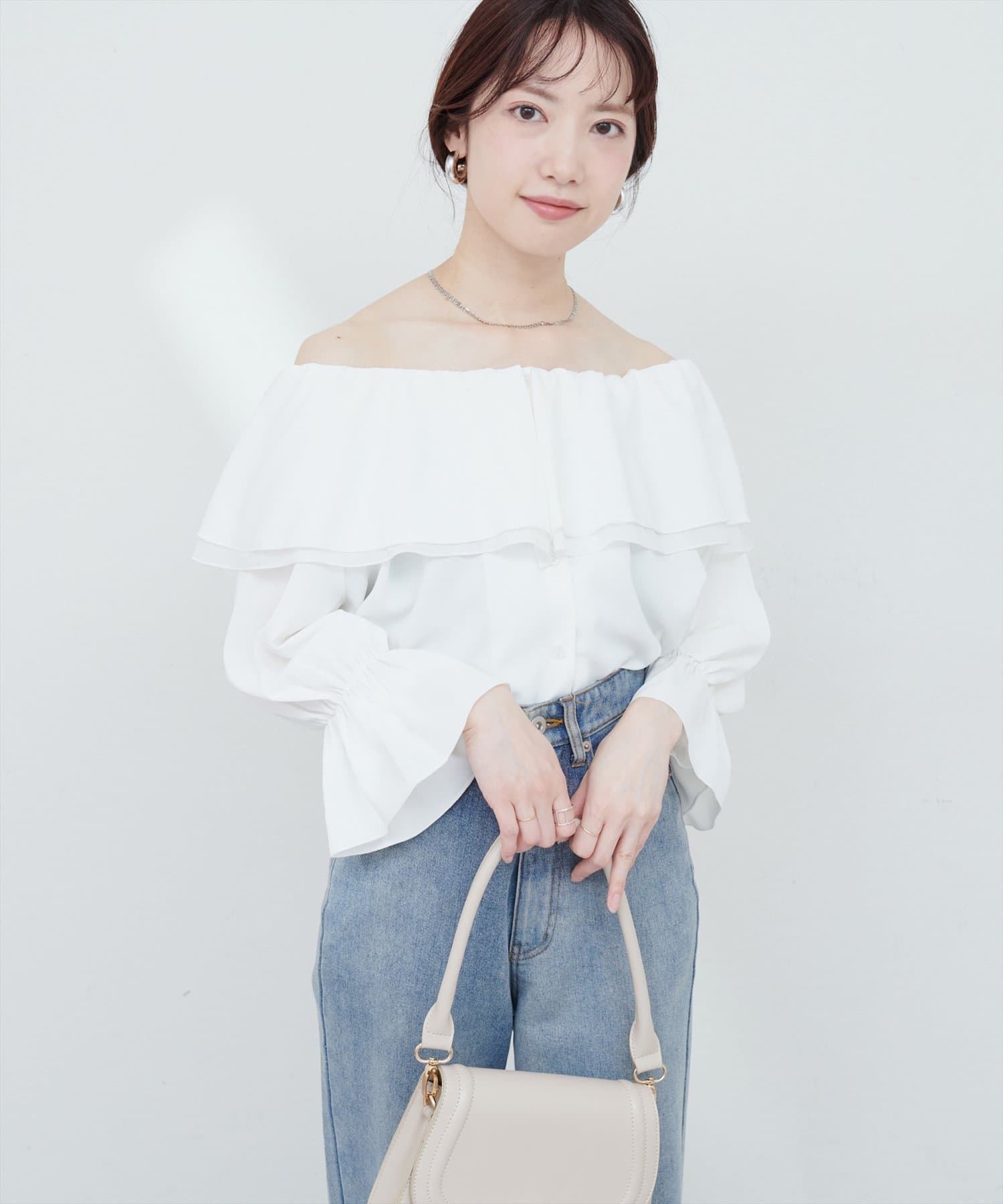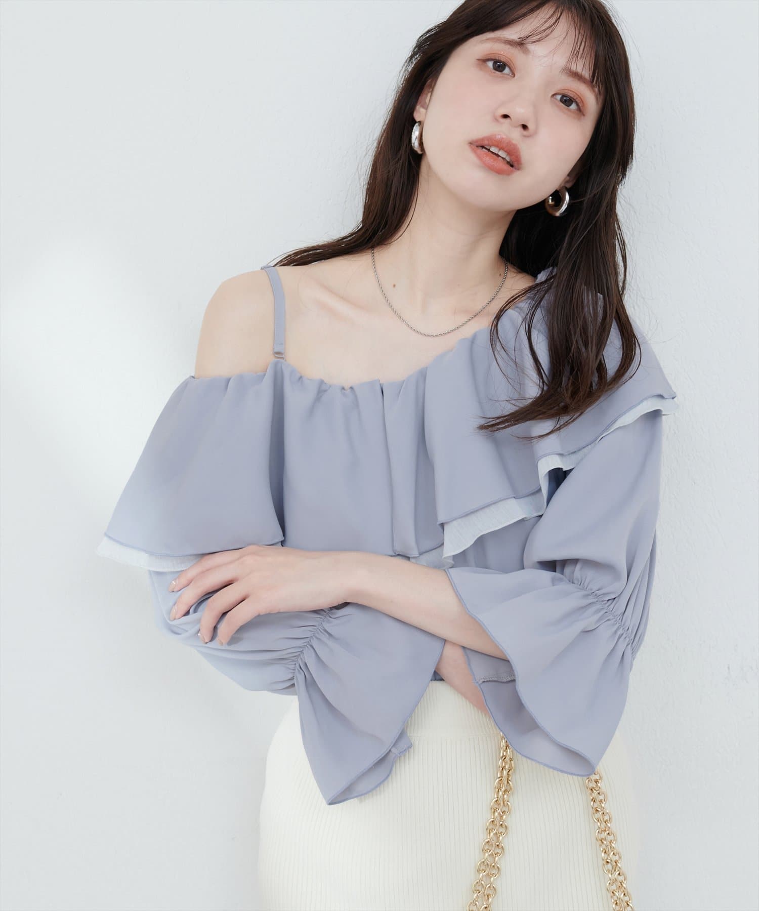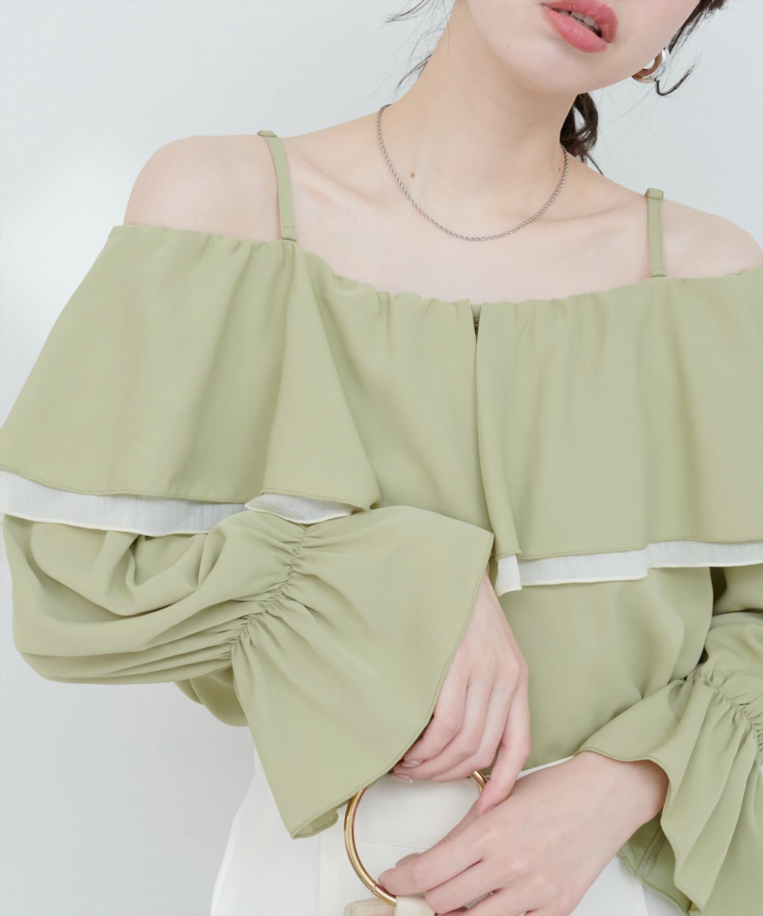 ふんわりと肩を飾るフリルが、女性らしさを引き立てるマルチWAYブラウス。