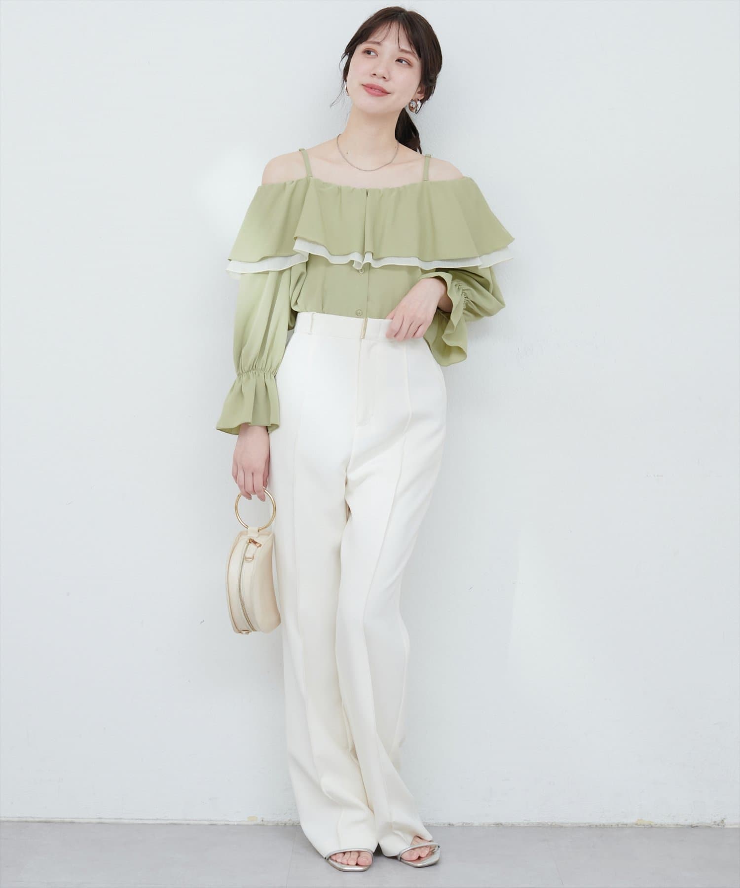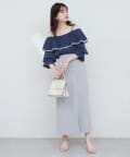 フェミニンな印象のフリルが、一枚でコーディネートを華やかにします。