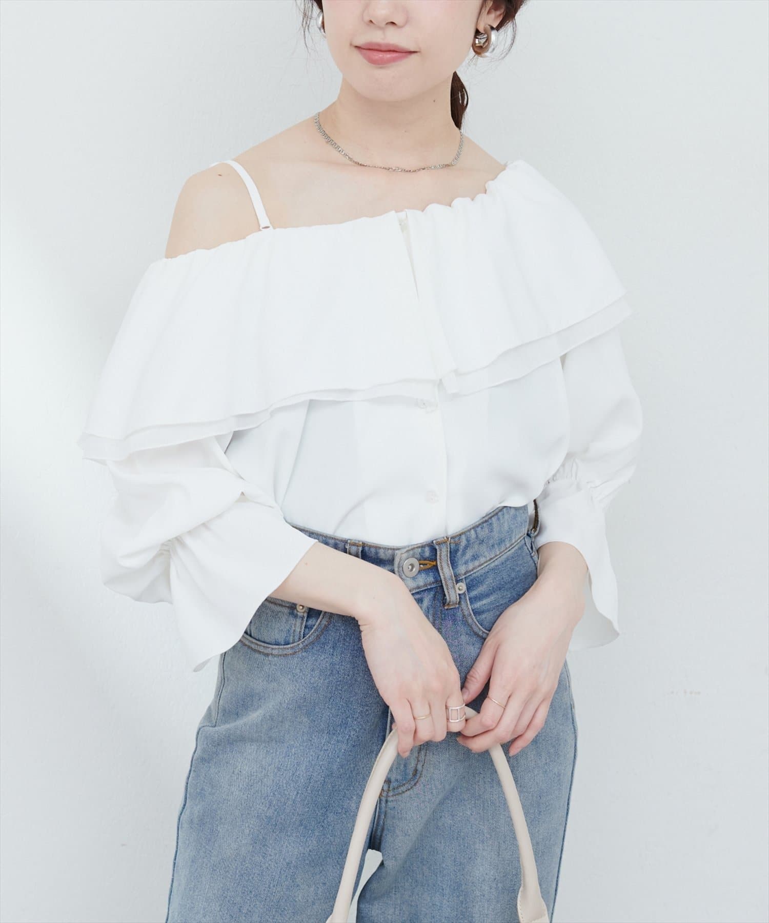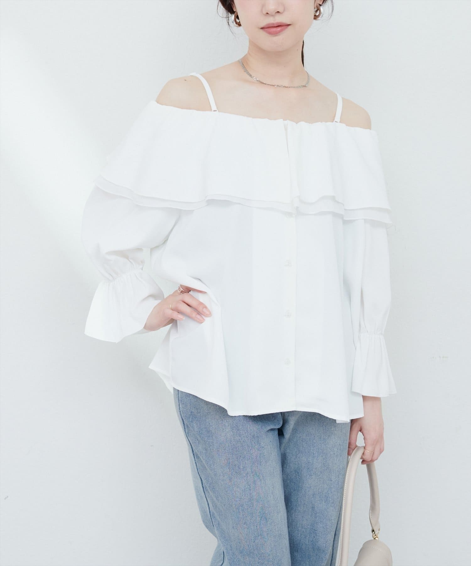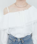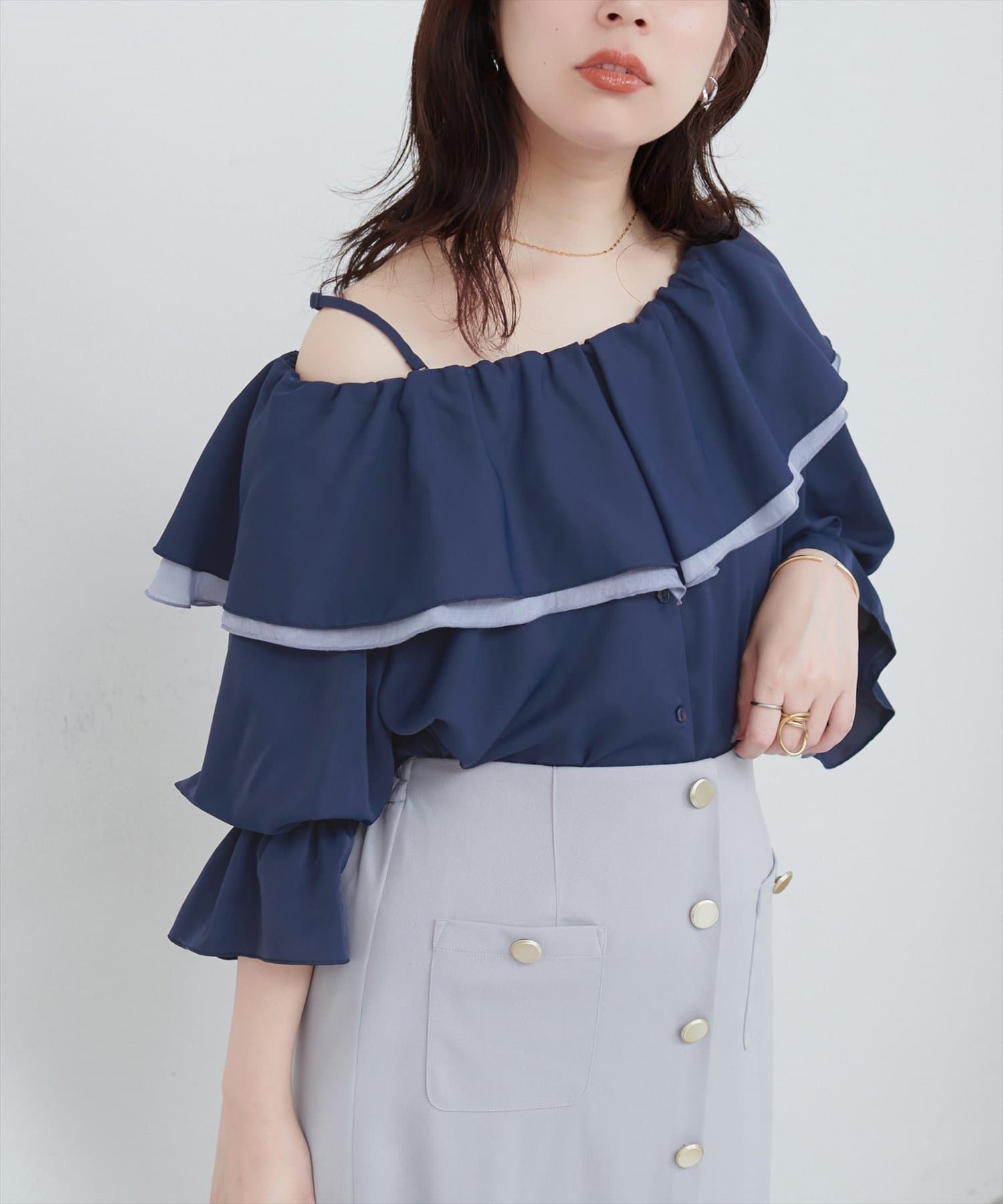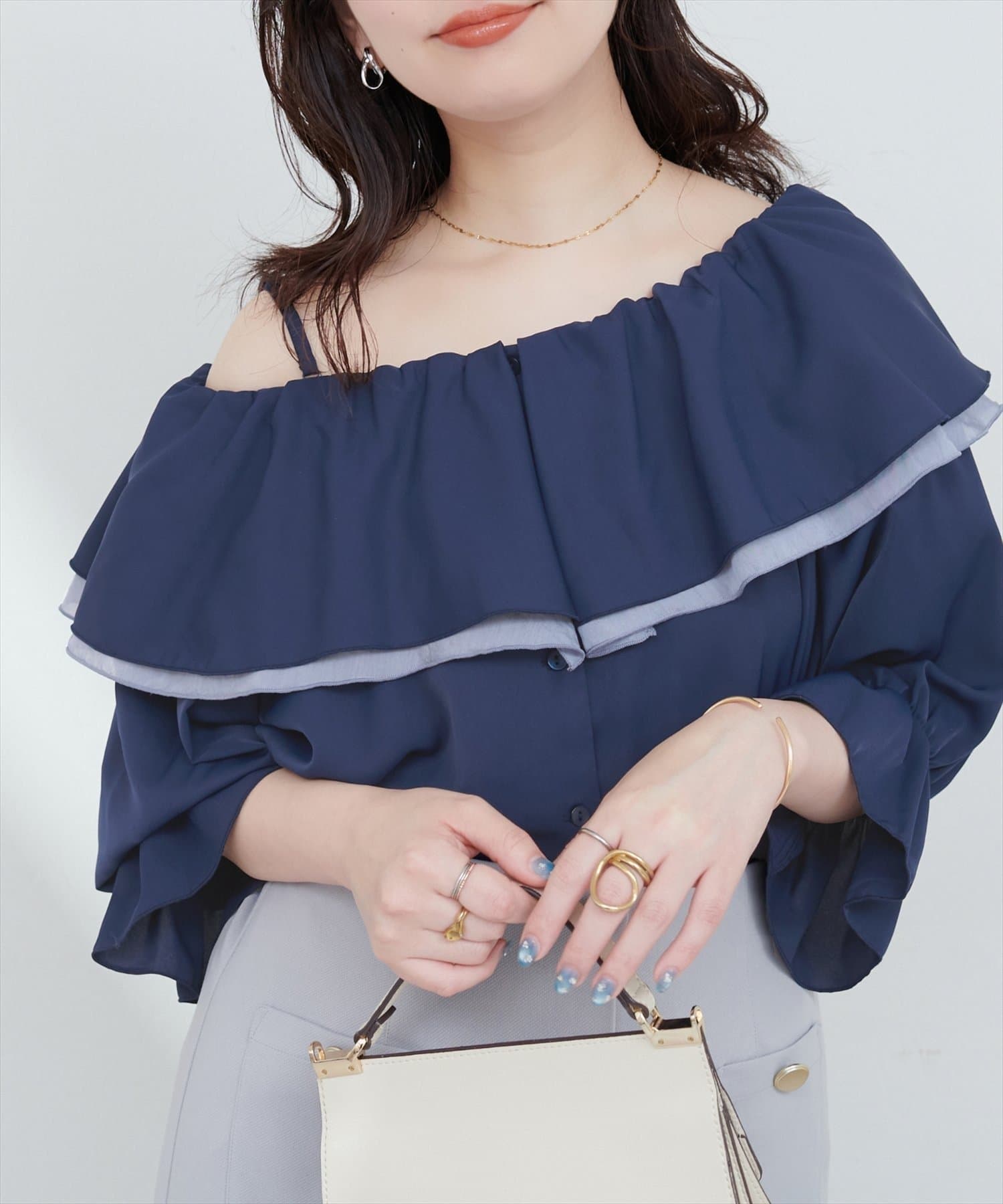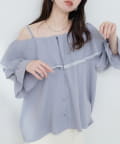 ふんわりと肩を飾るフリルが、女性らしさを引き立てるマルチWAYブラウス。