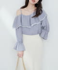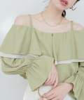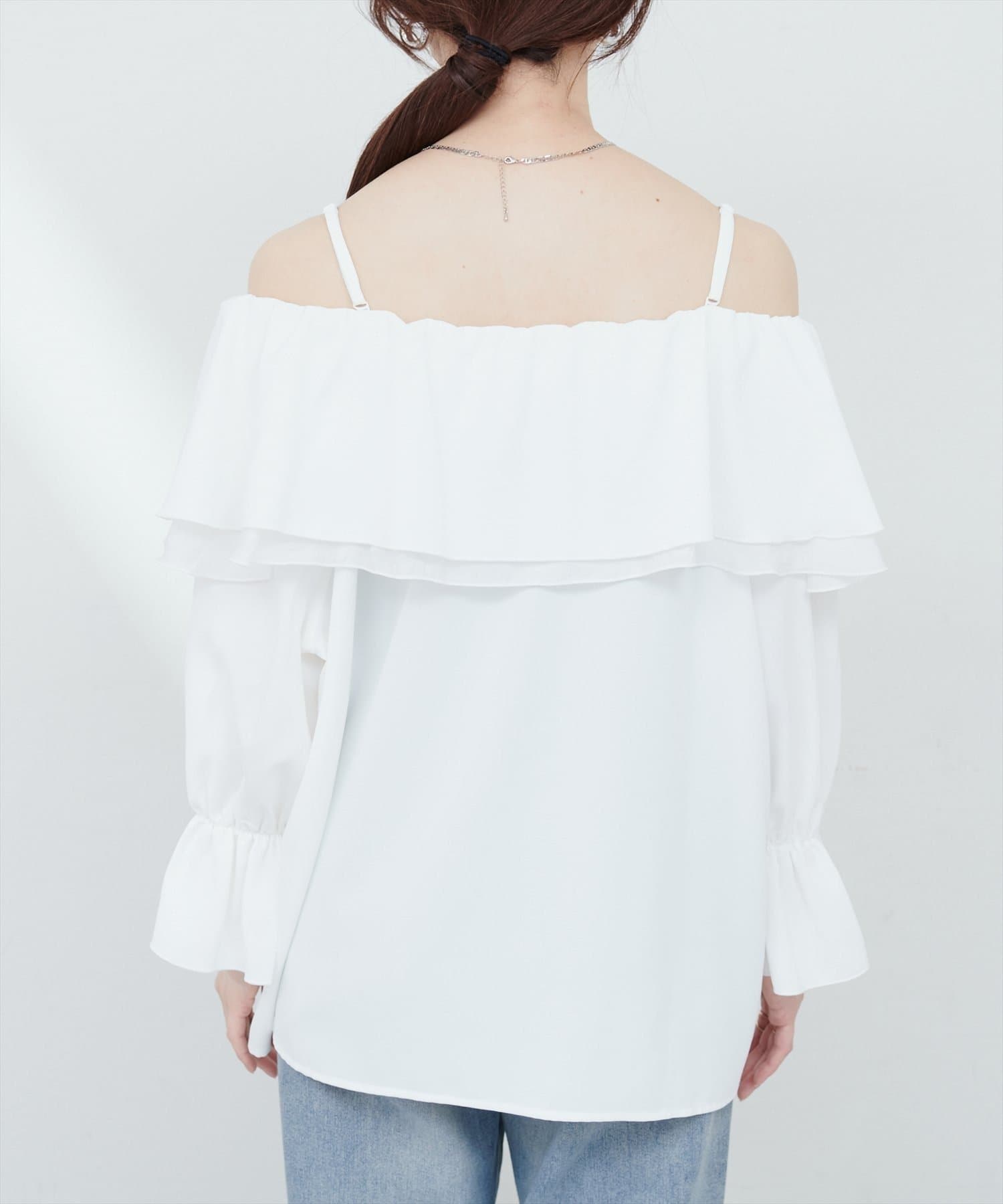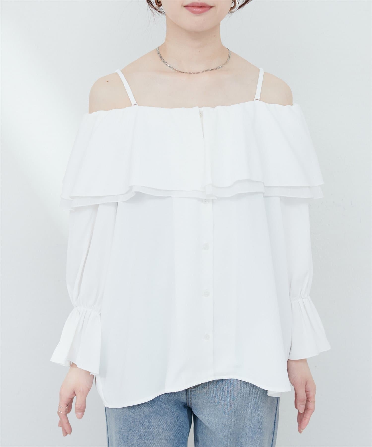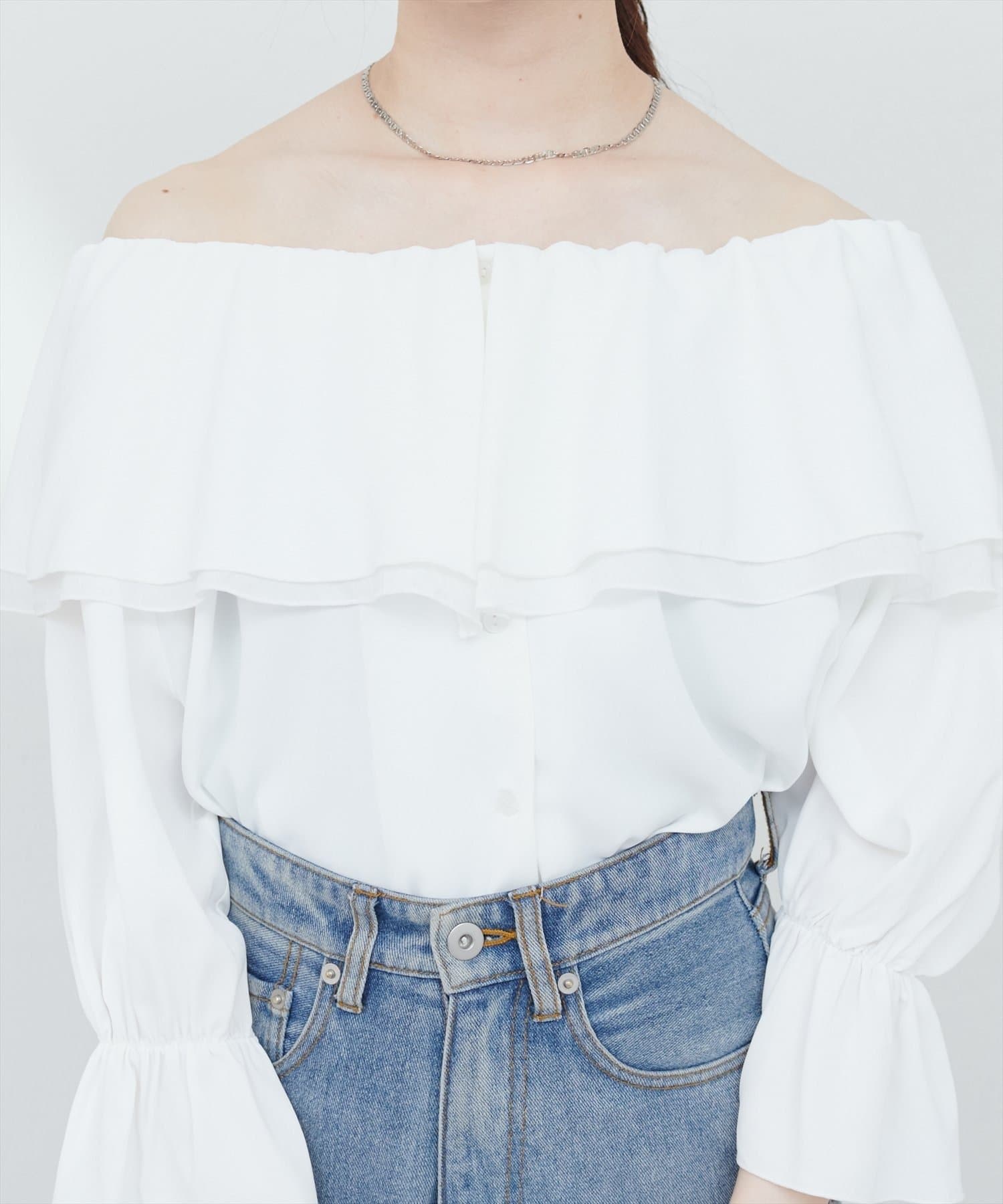 ふんわりと肩を飾るフリルが、女性らしさを引き立てるマルチWAYブラウス。