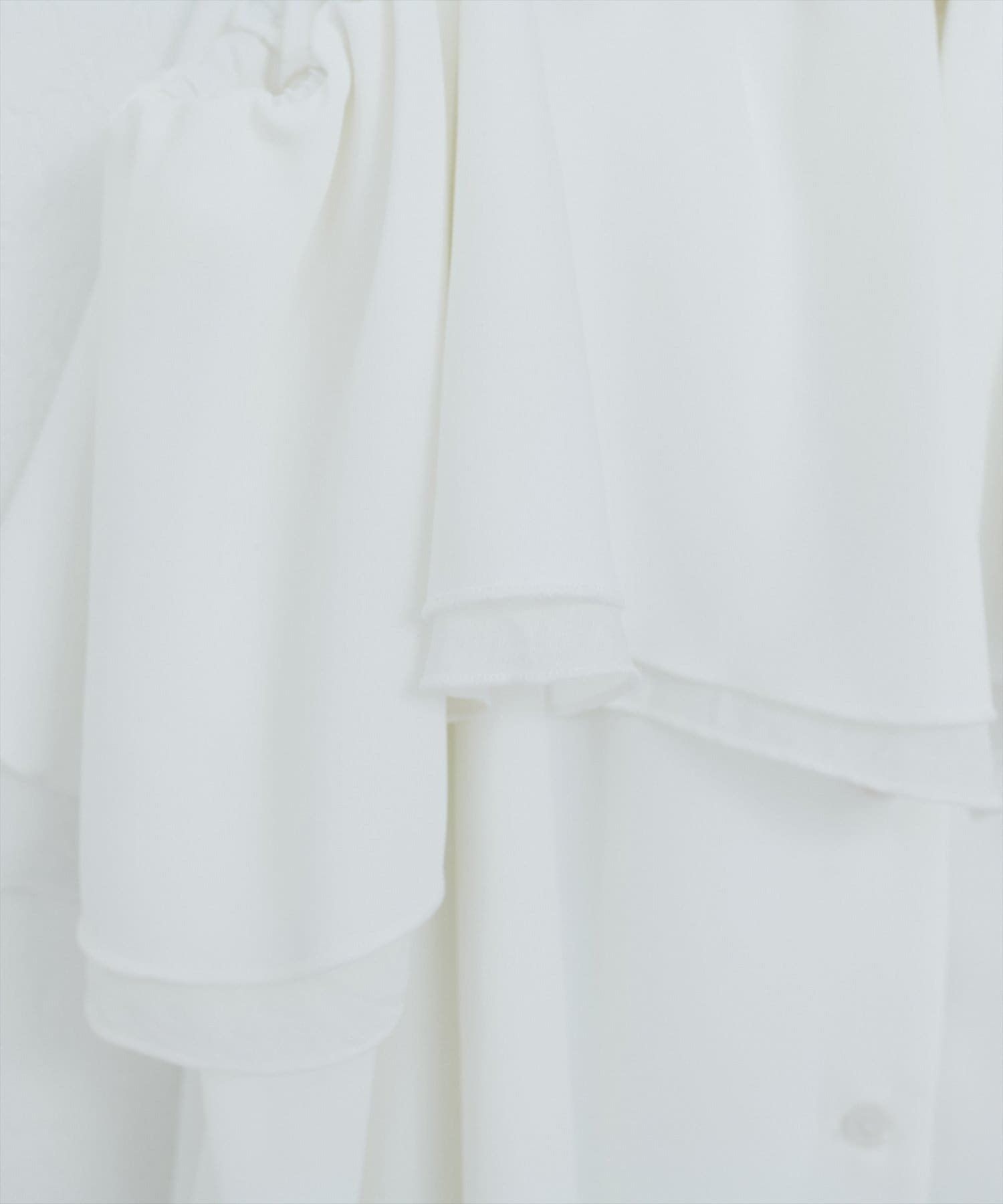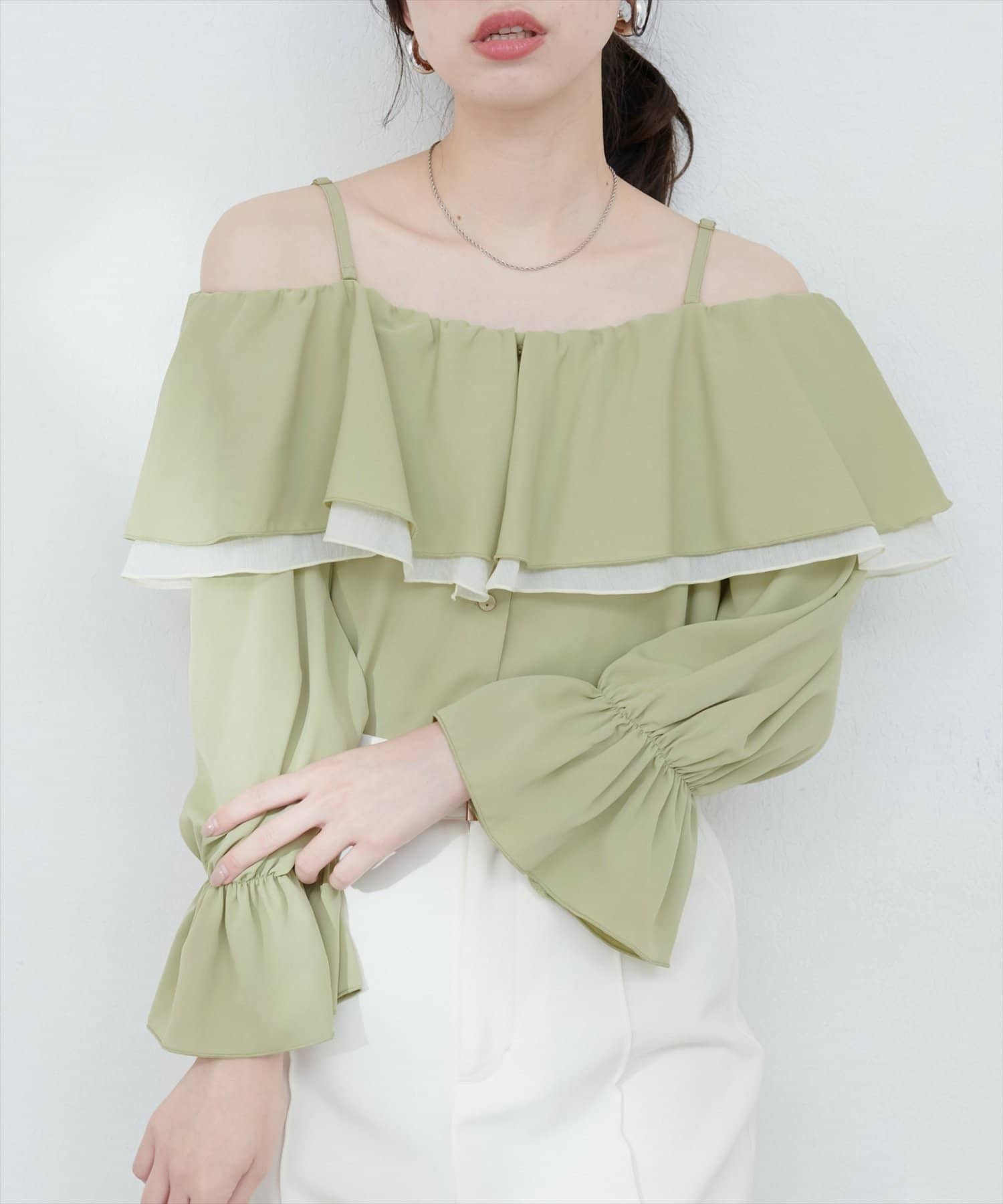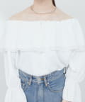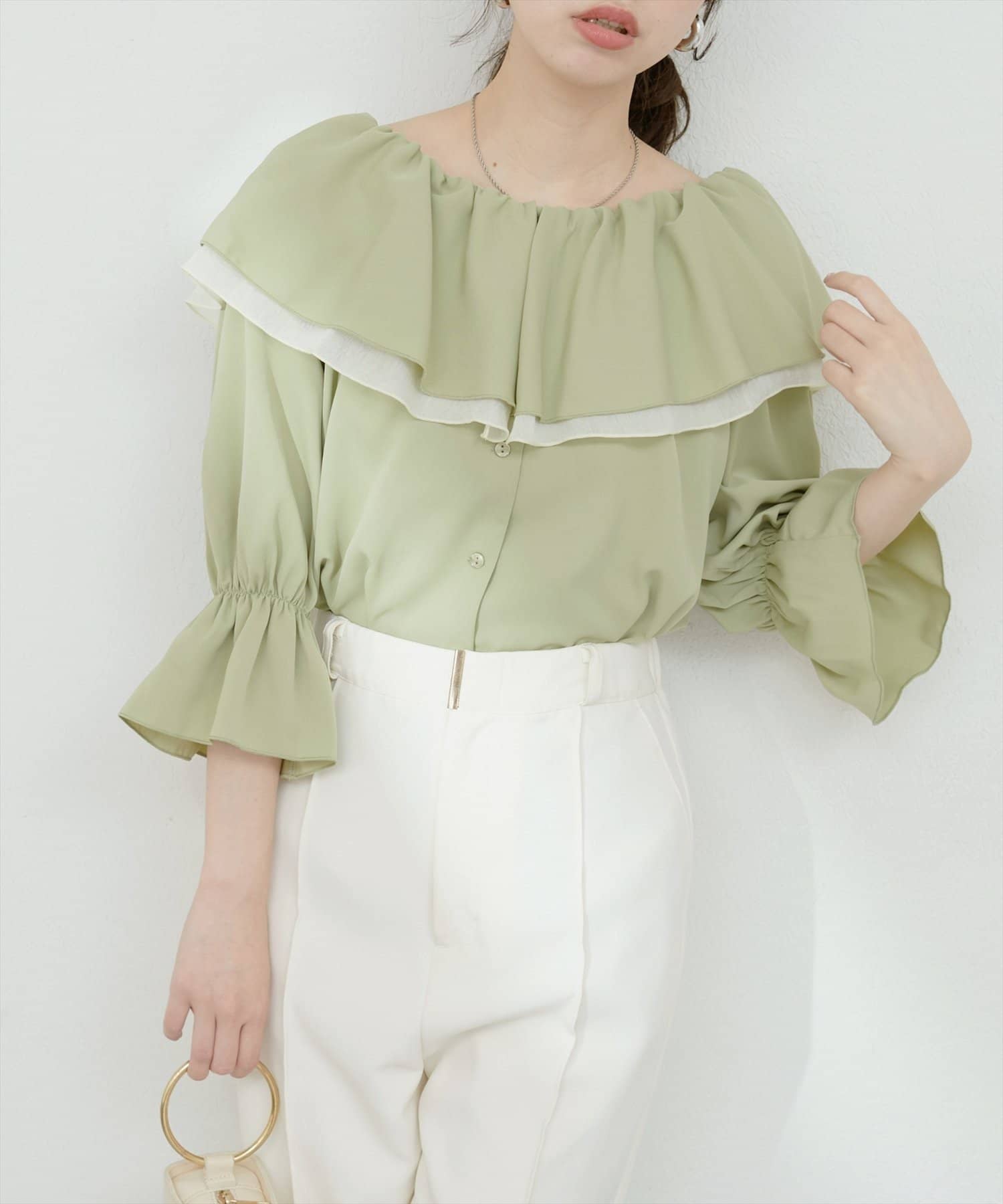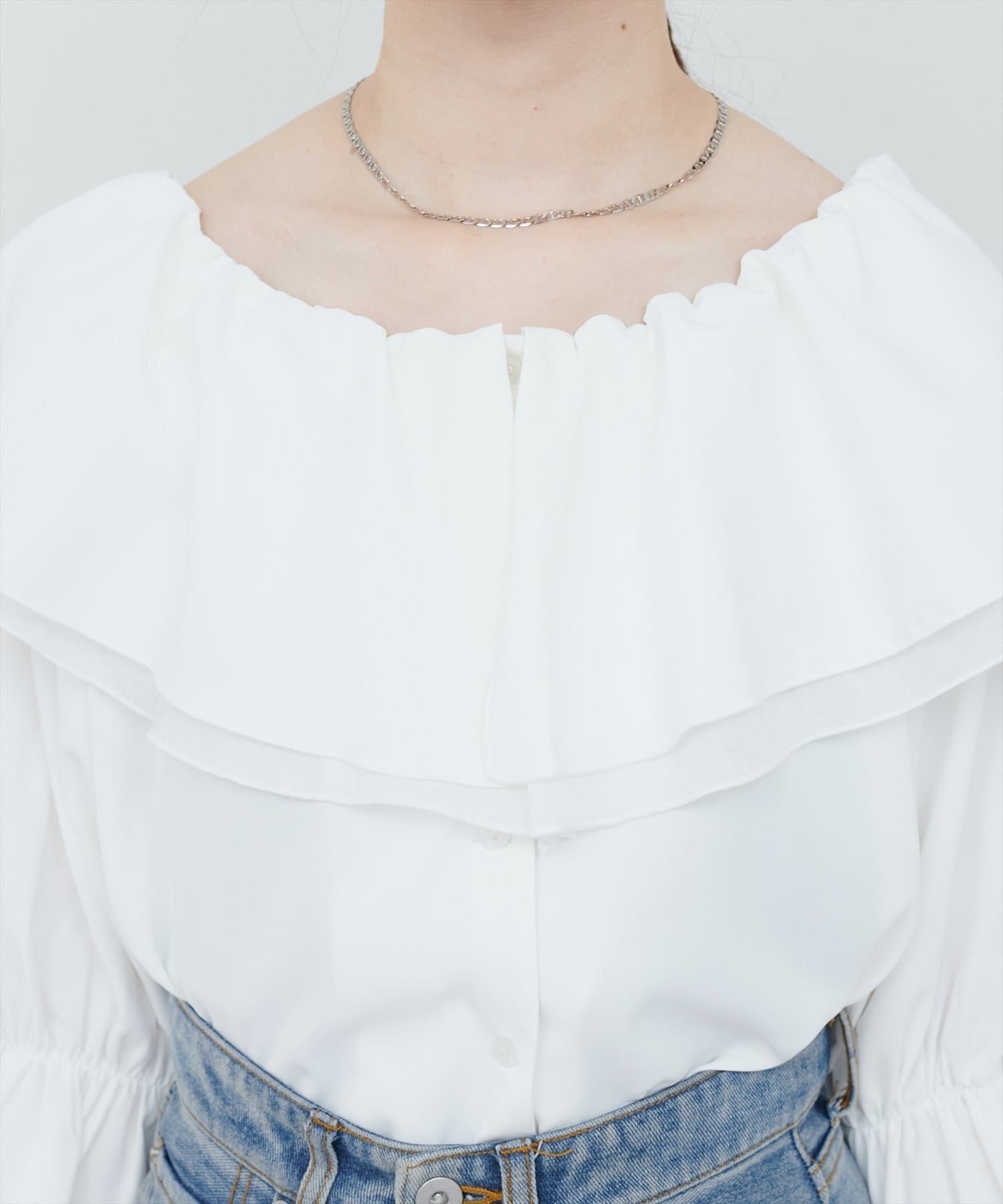 ふんわりと肩を飾るフリルが、女性らしさを引き立てるマルチWAYブラウス。