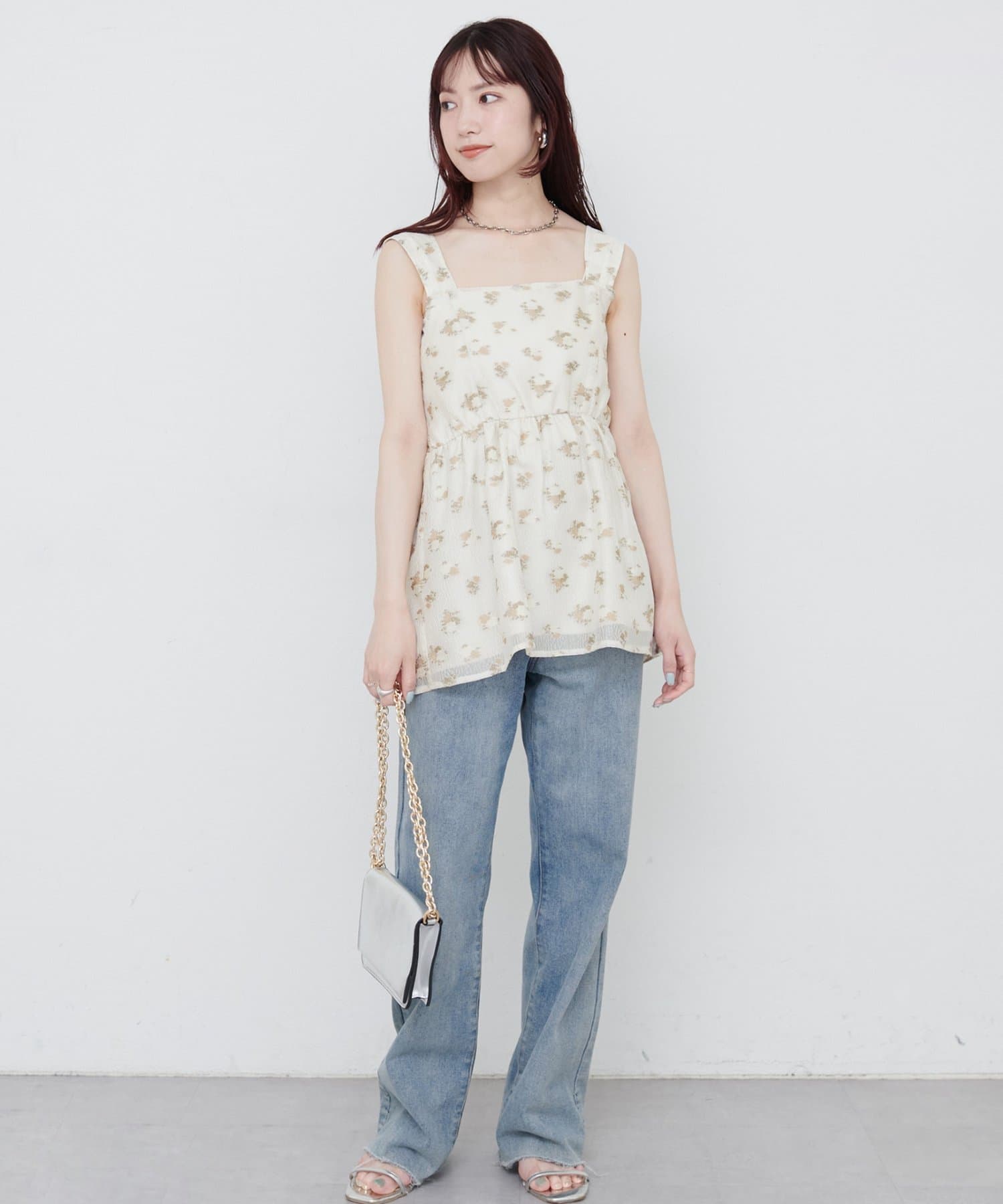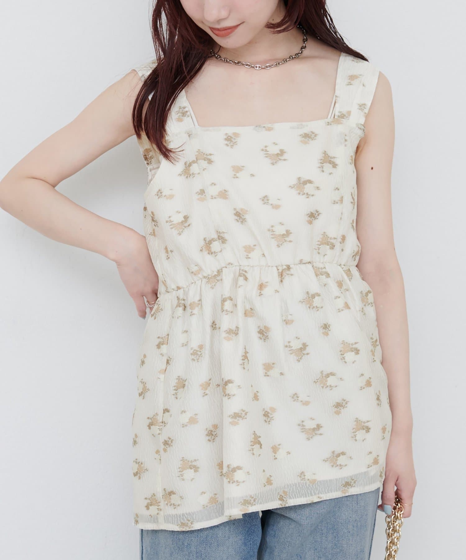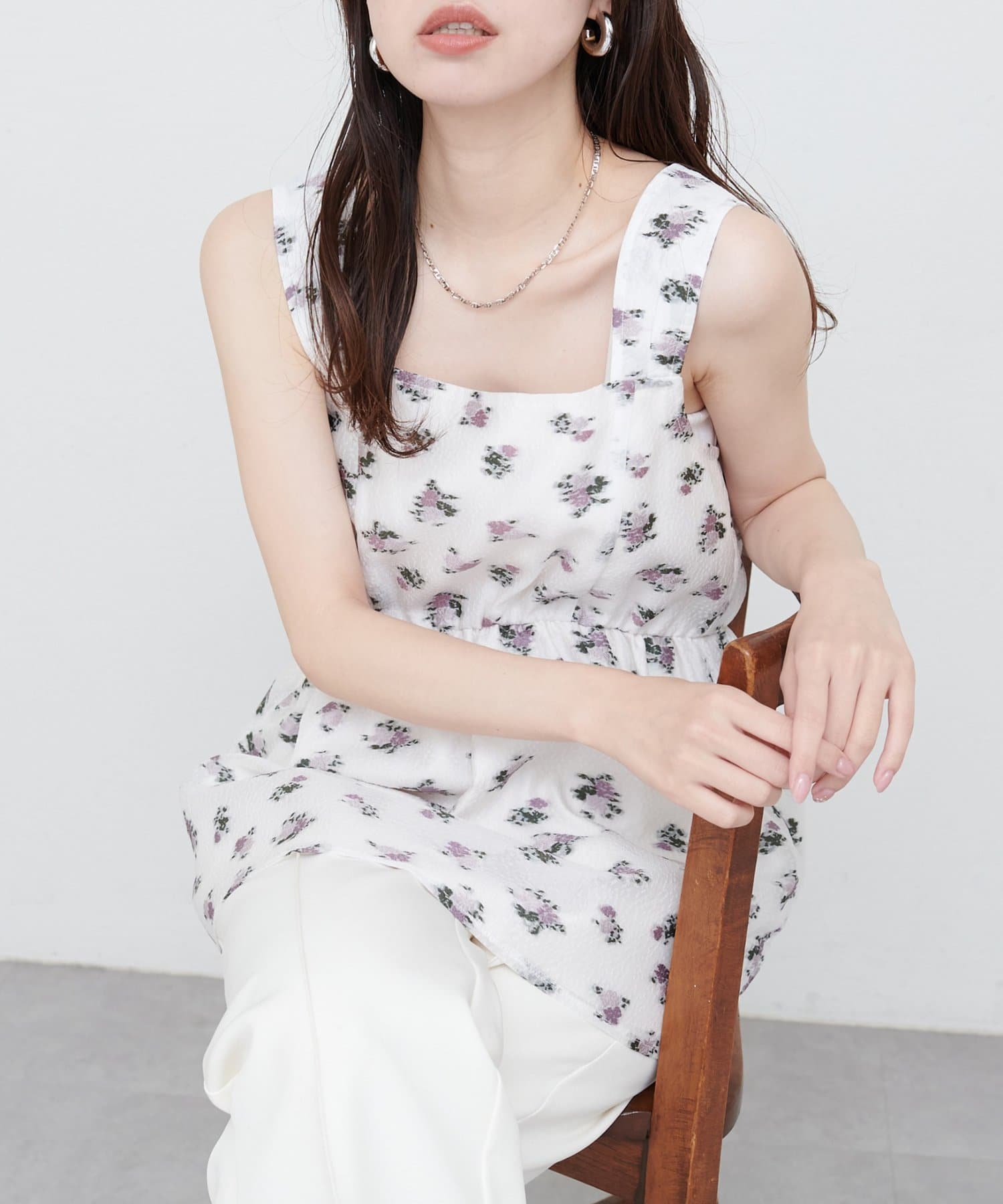エアリーで軽やかな素材感とスクエアネックがデコルテを美しく見せ、さりげない抜け感をプラス。