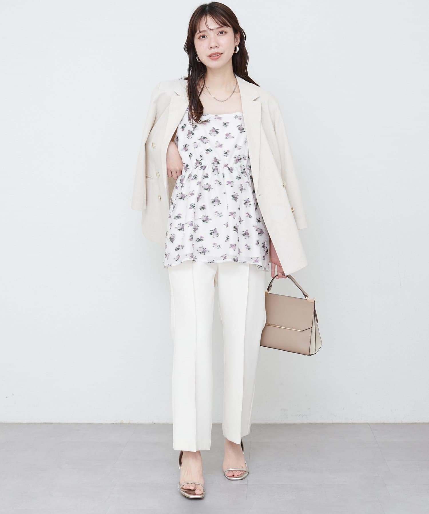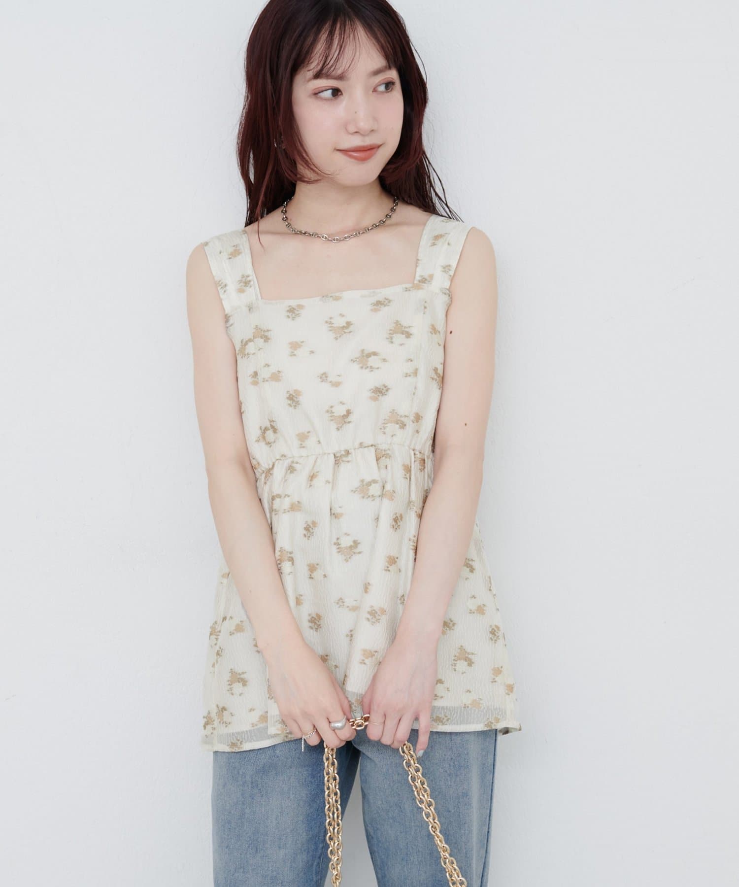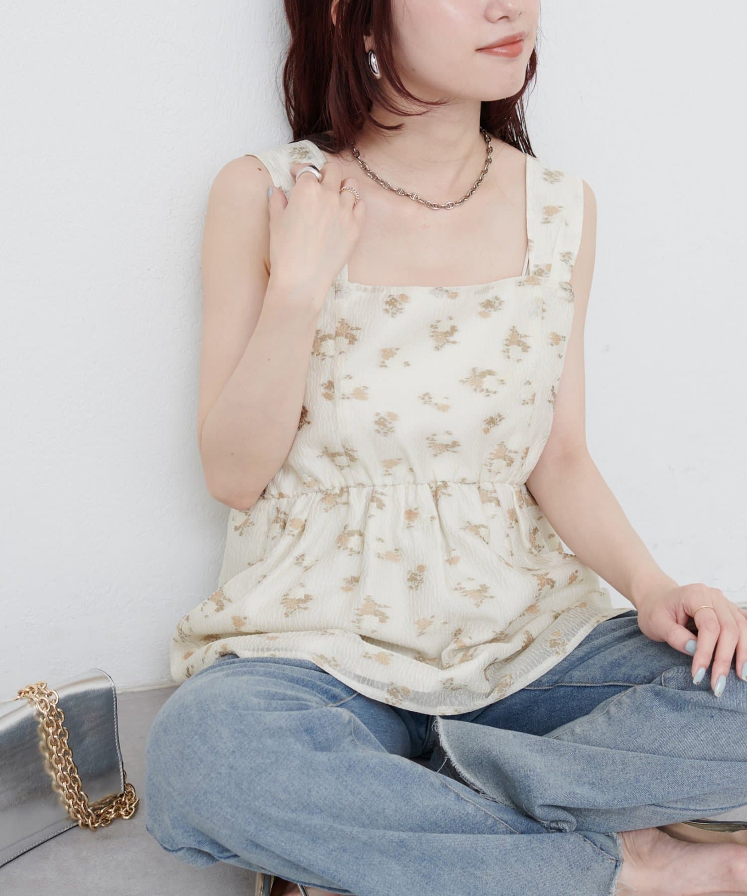 エアリーで軽やかな素材感とスクエアネックがデコルテを美しく見せ、さりげない抜け感をプラス。