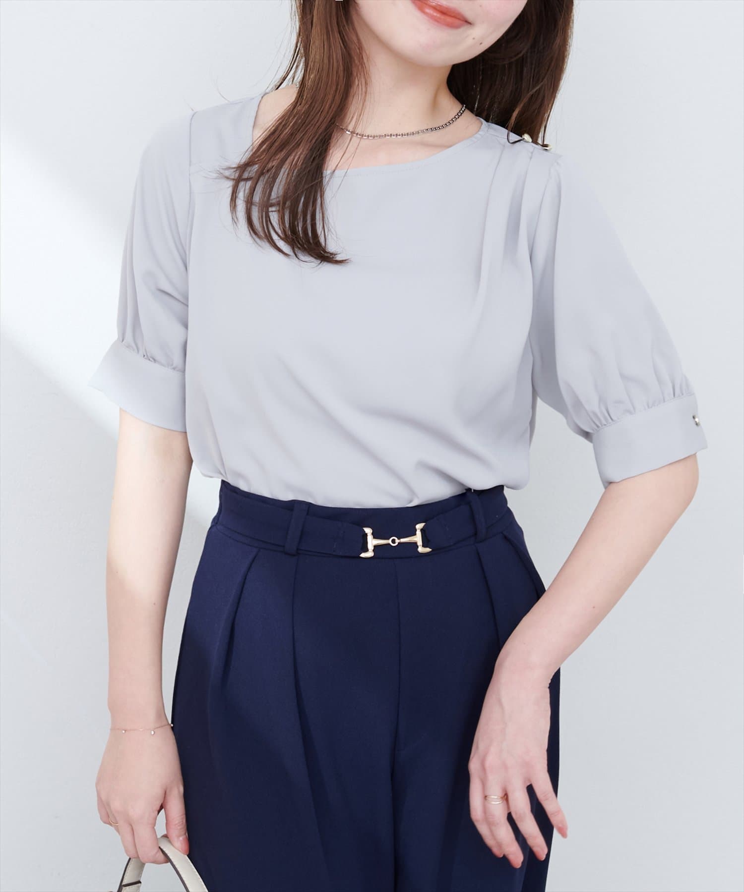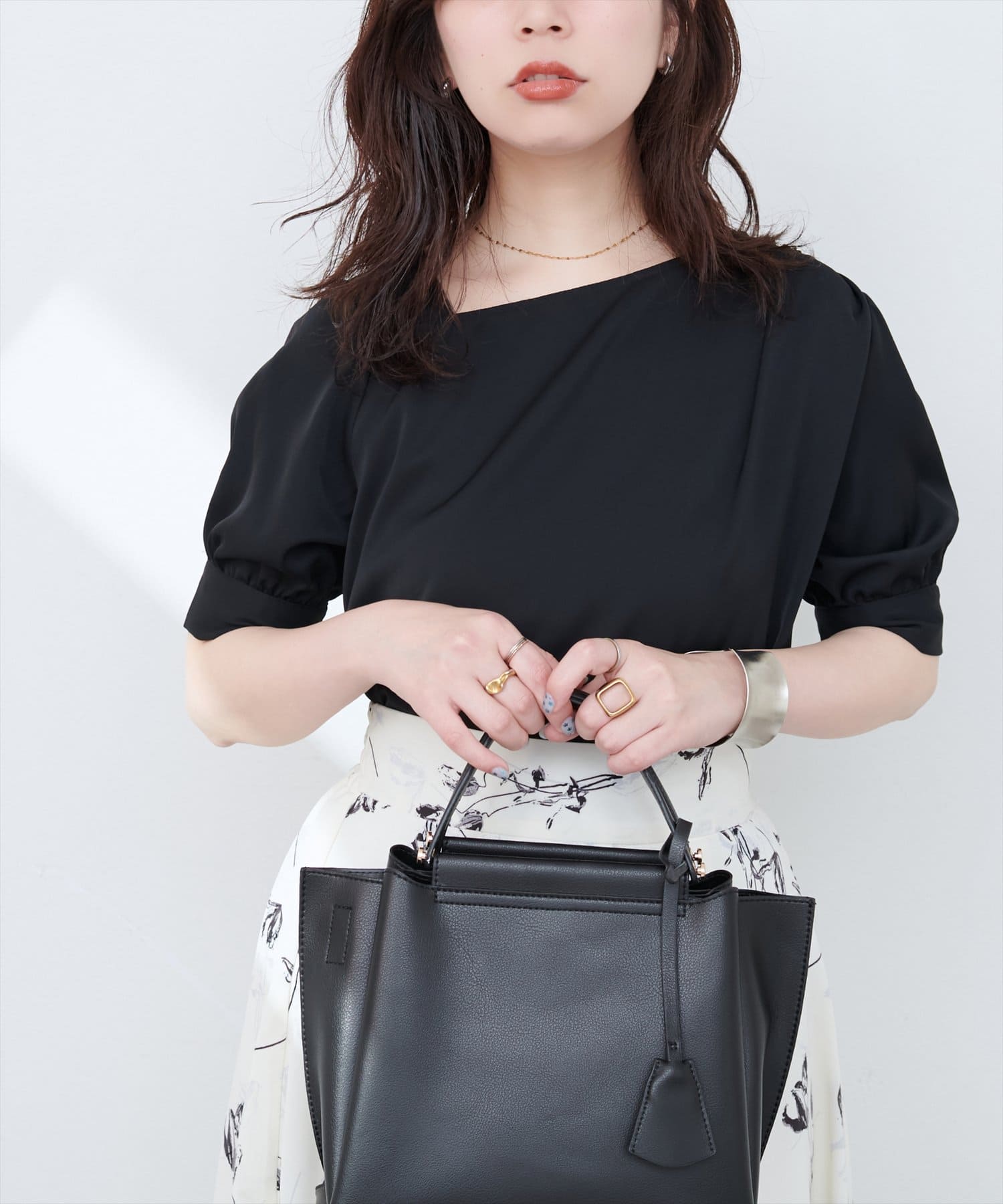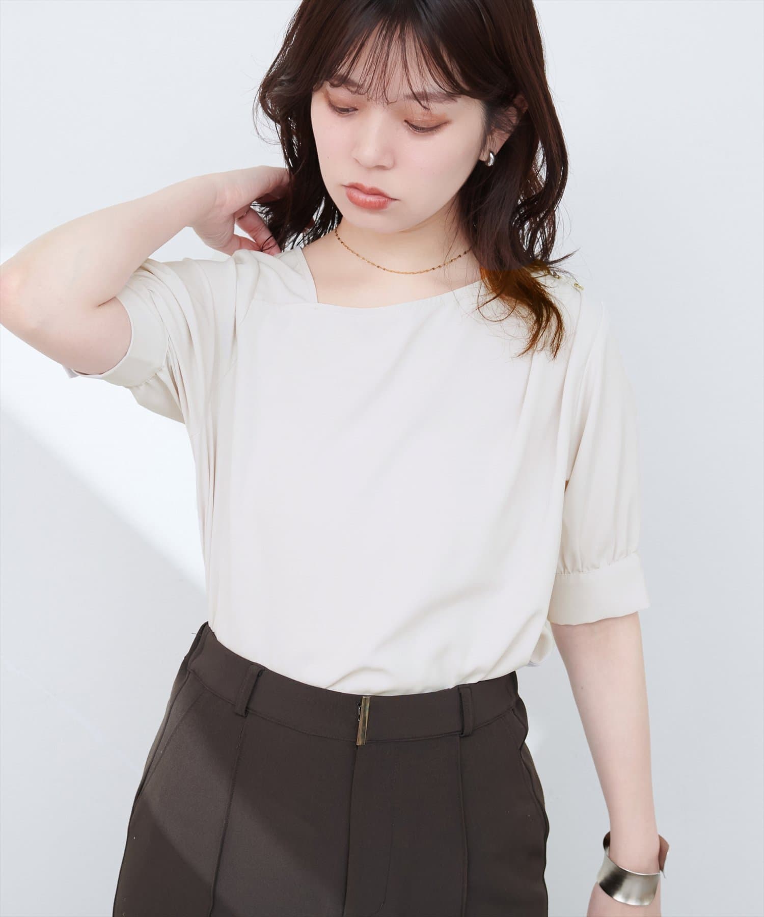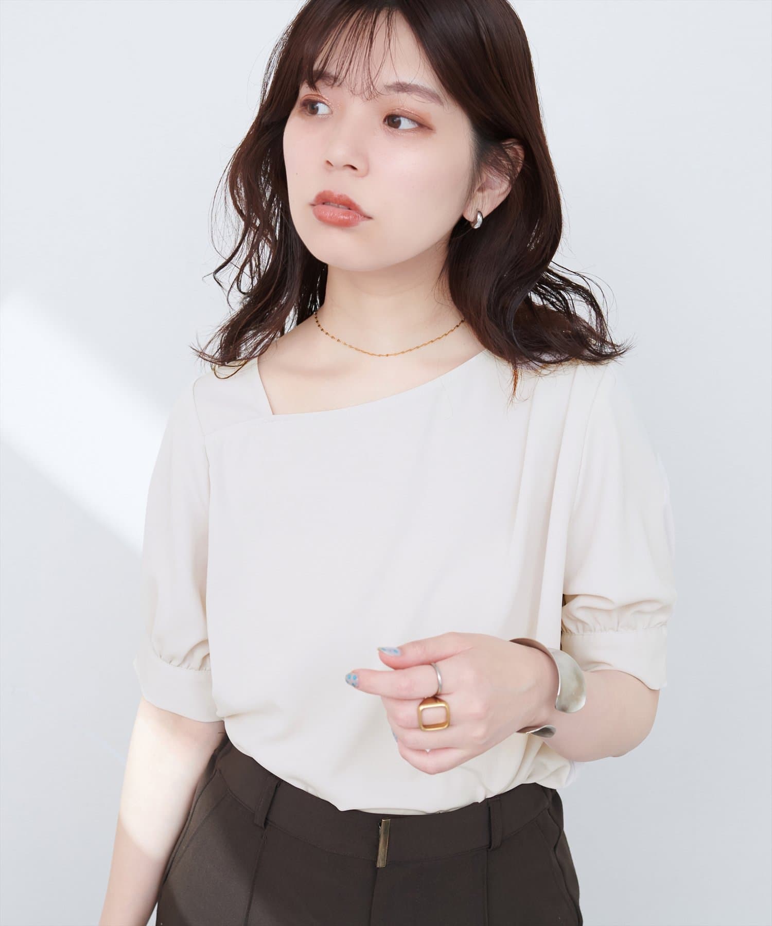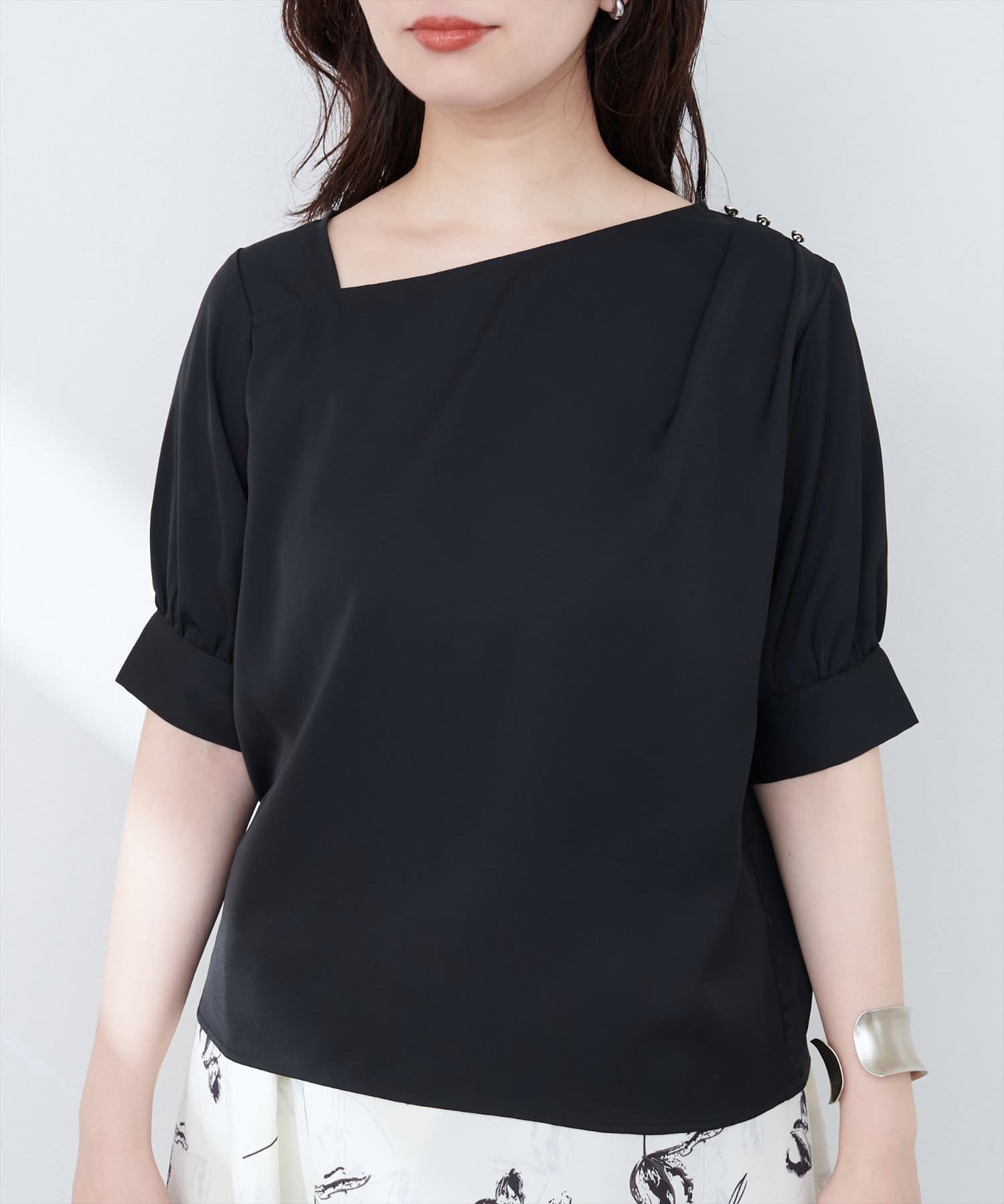 アシメネックデザインで、大人の女性にぴったりの上品でエレガントなブラウス。