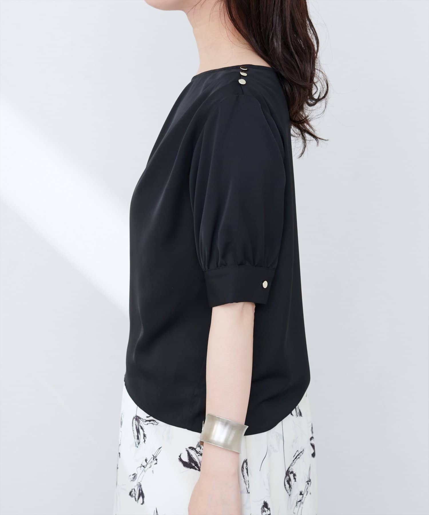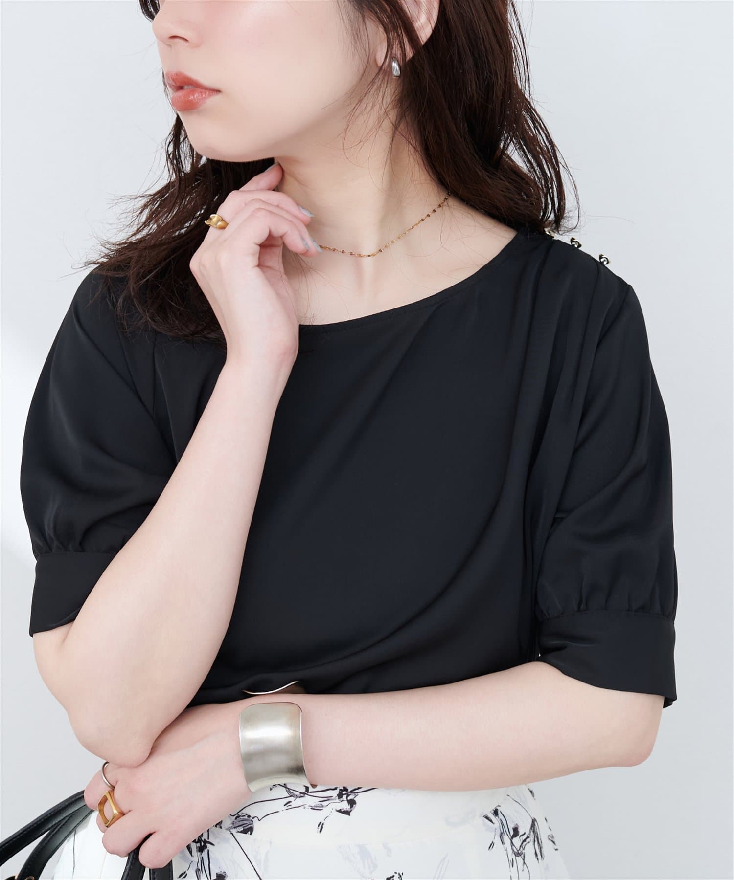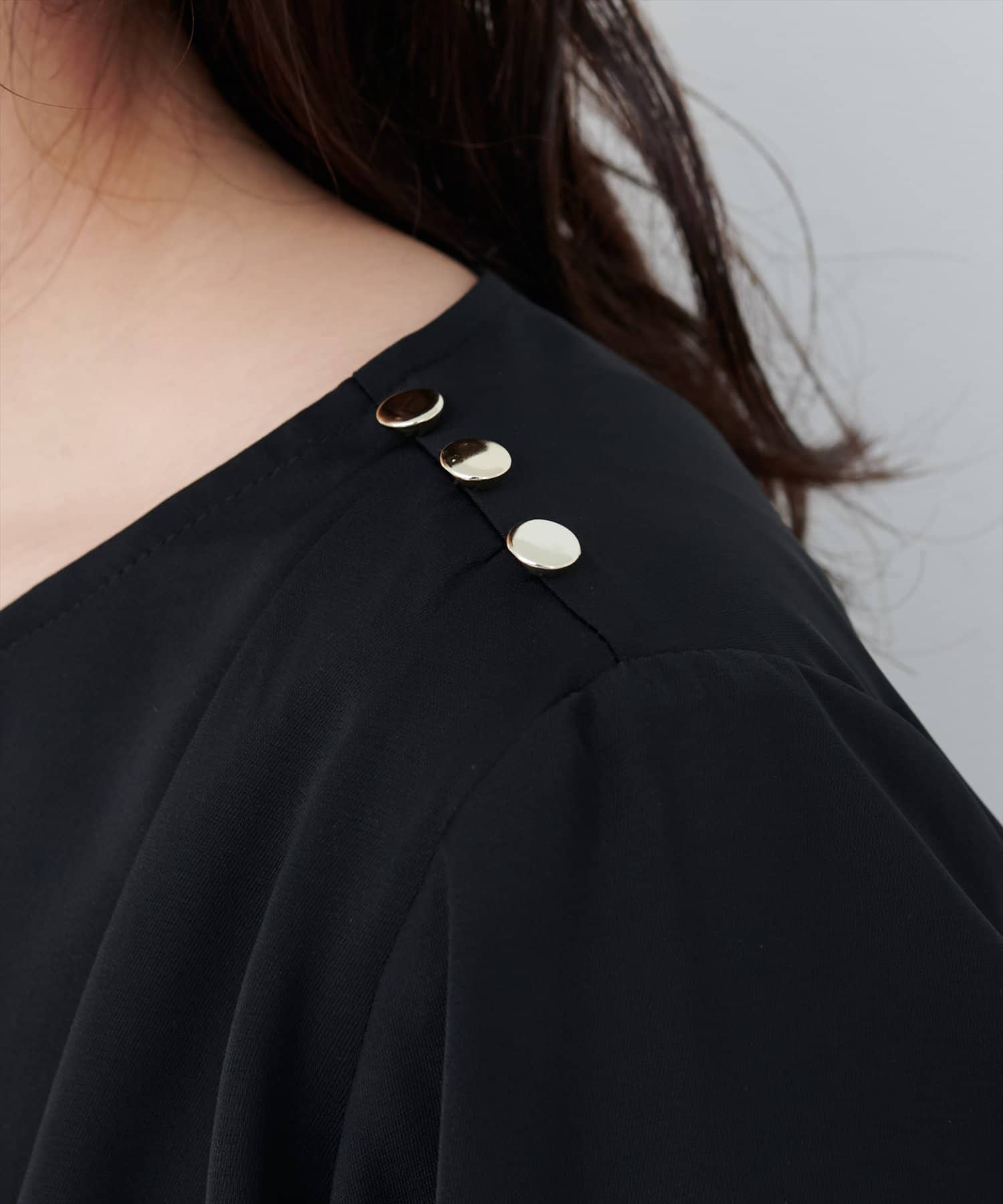 上品な光沢感と、肩のゴールドボタンがアクセントに。