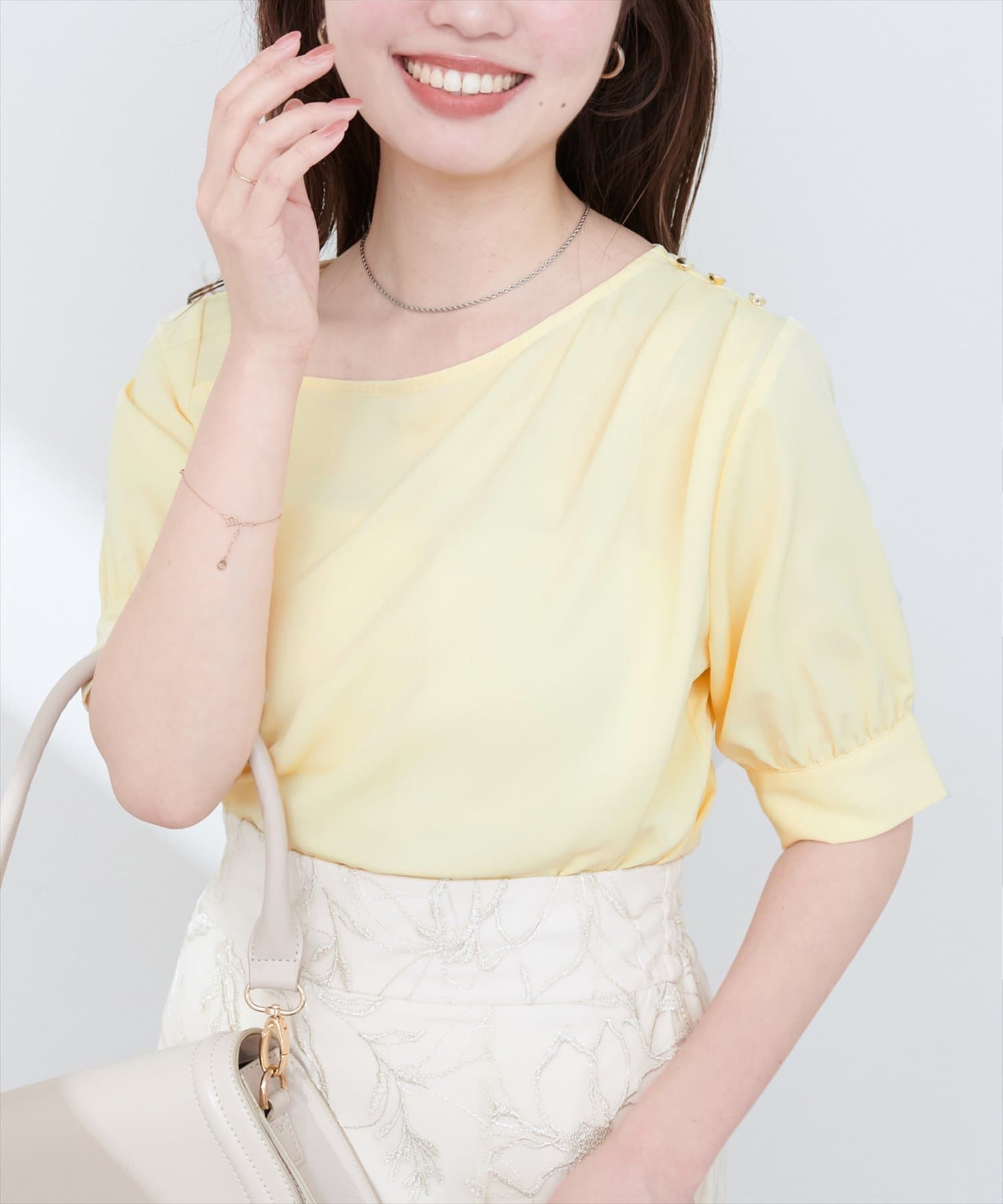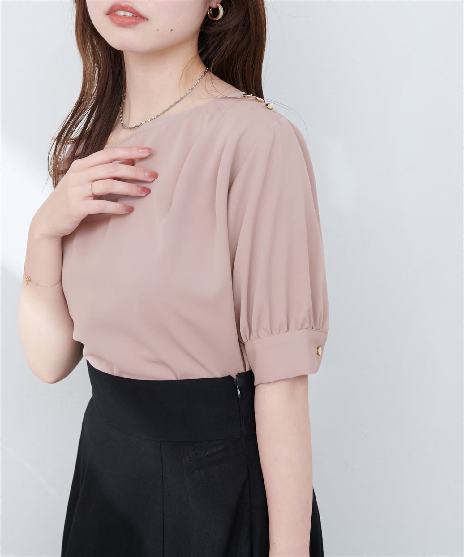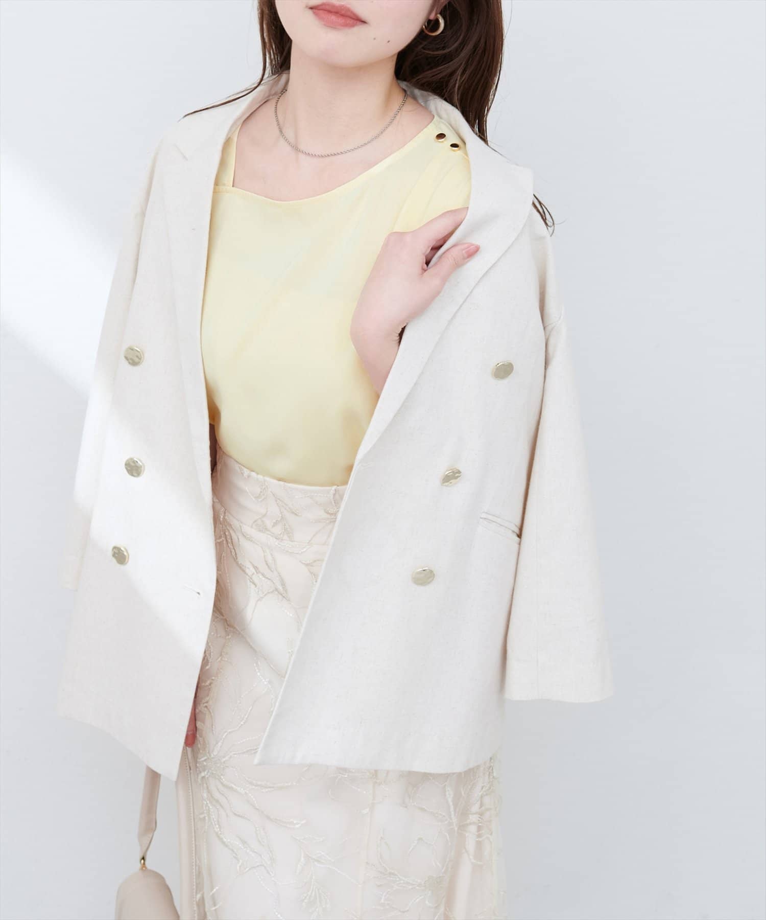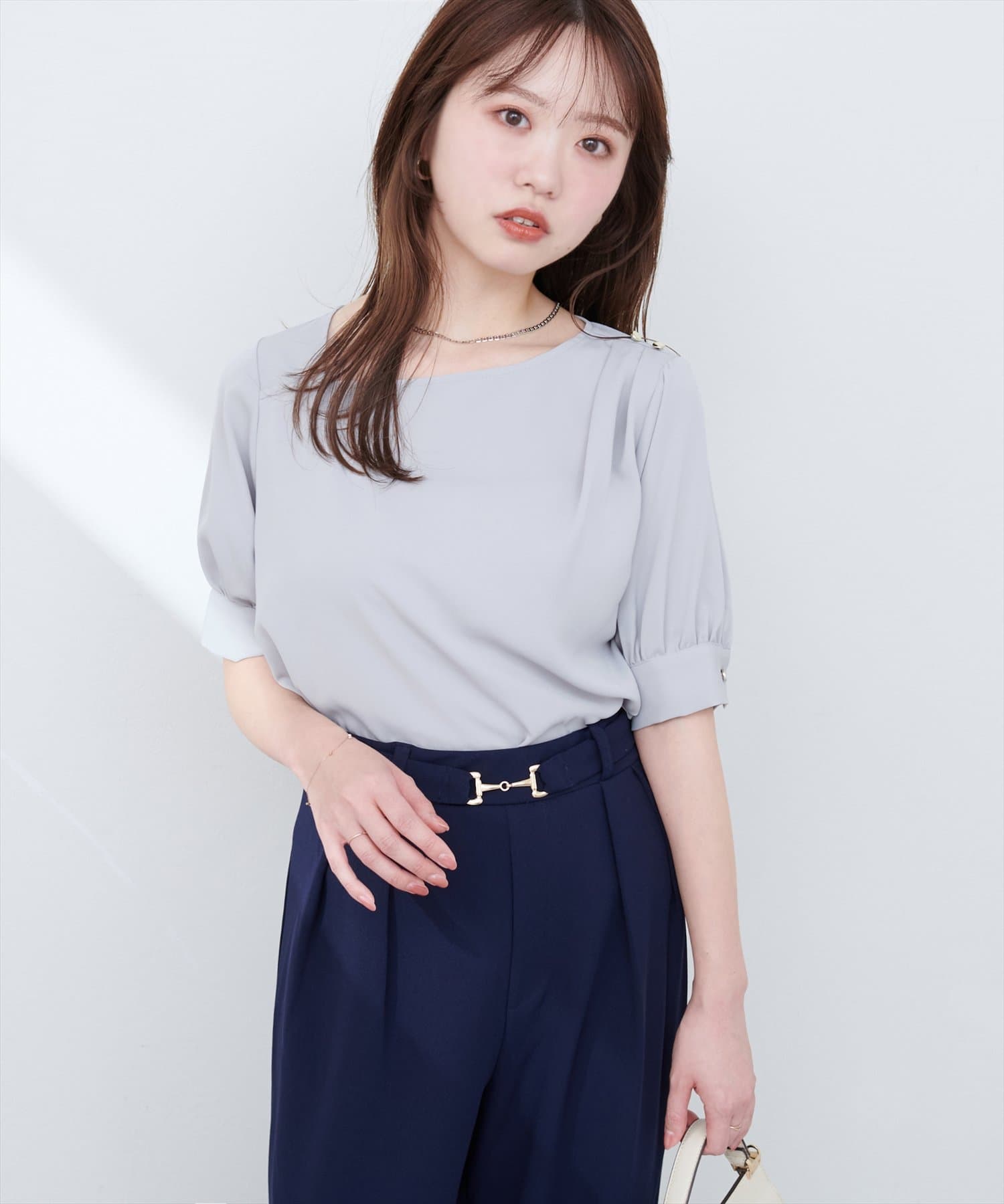 上品な光沢感と、肩のゴールドボタンがアクセントに。
