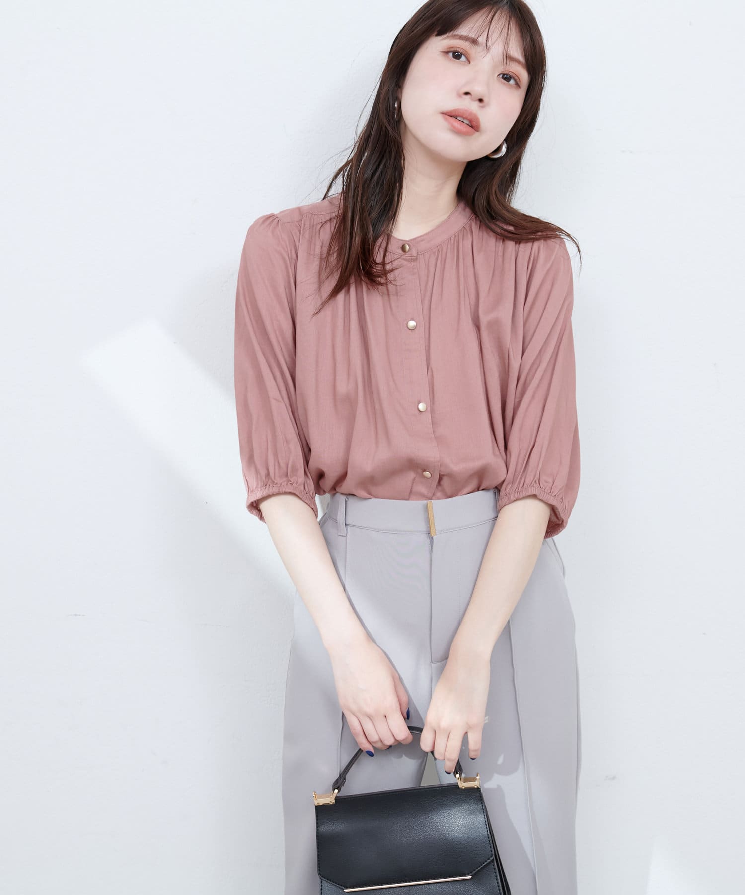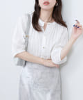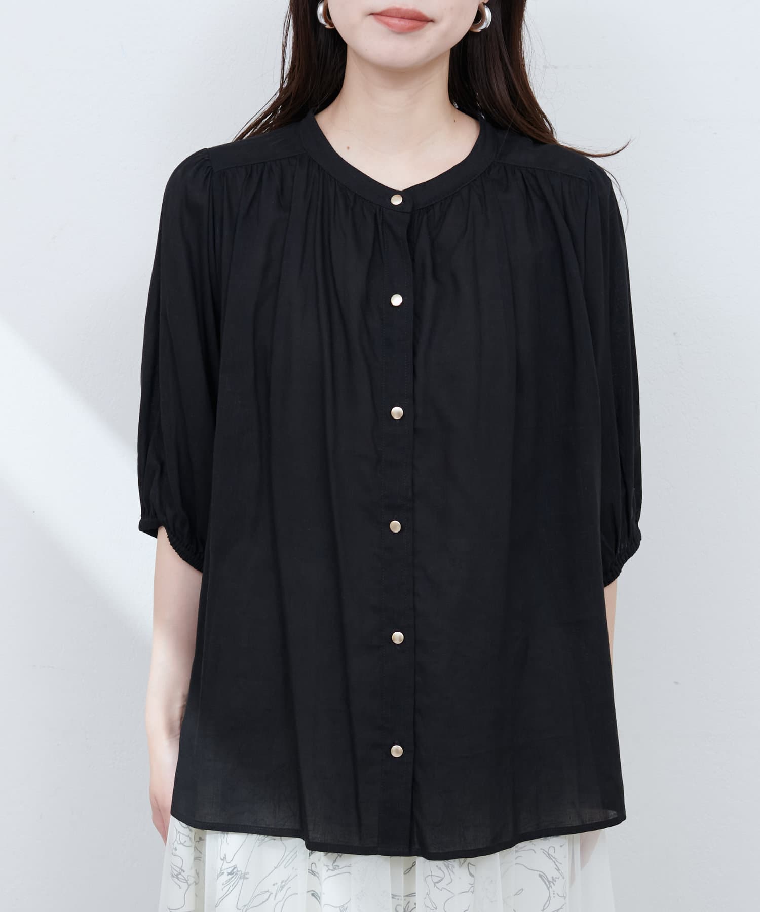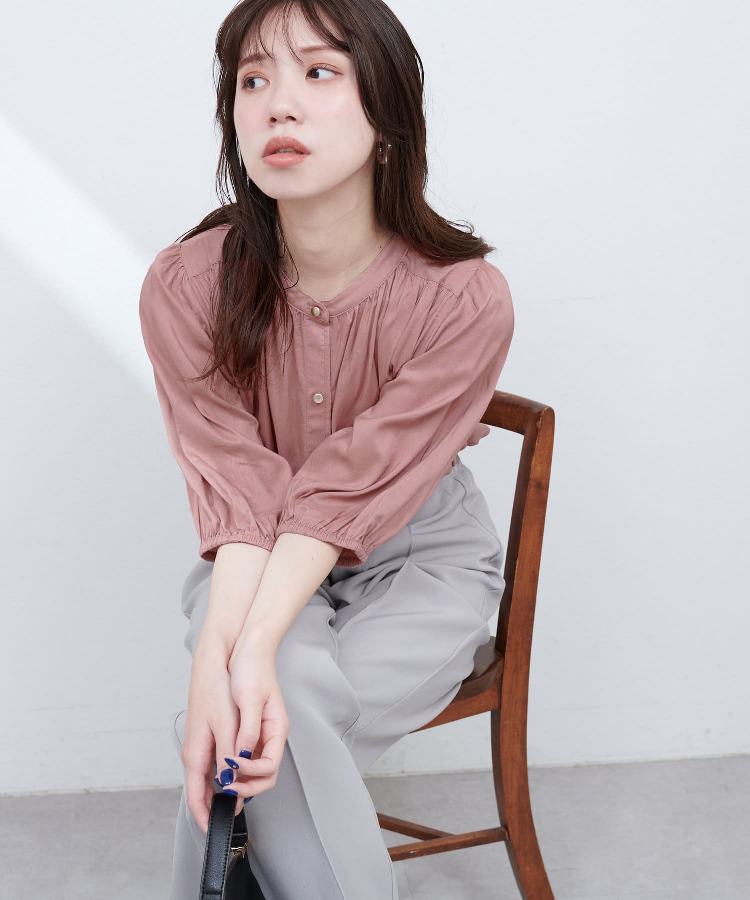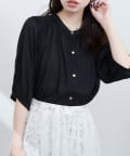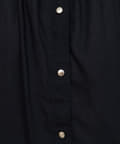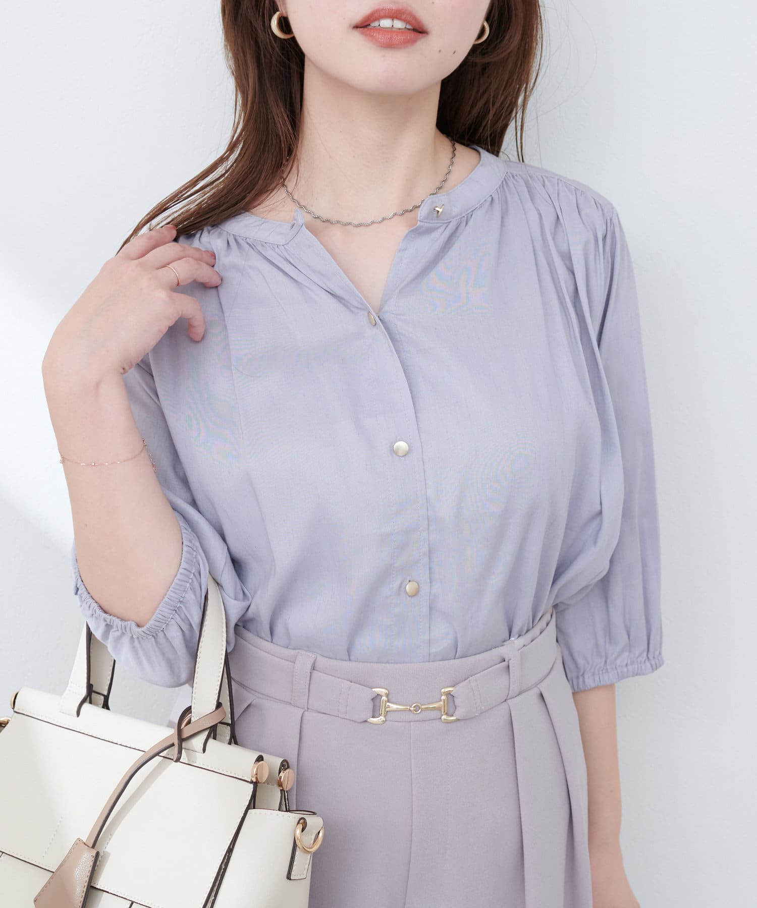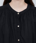首元のギャザーと薄金ボタンが、さりげない華やかさをプラス。