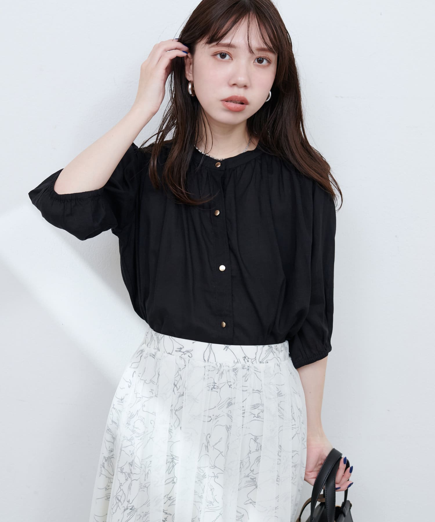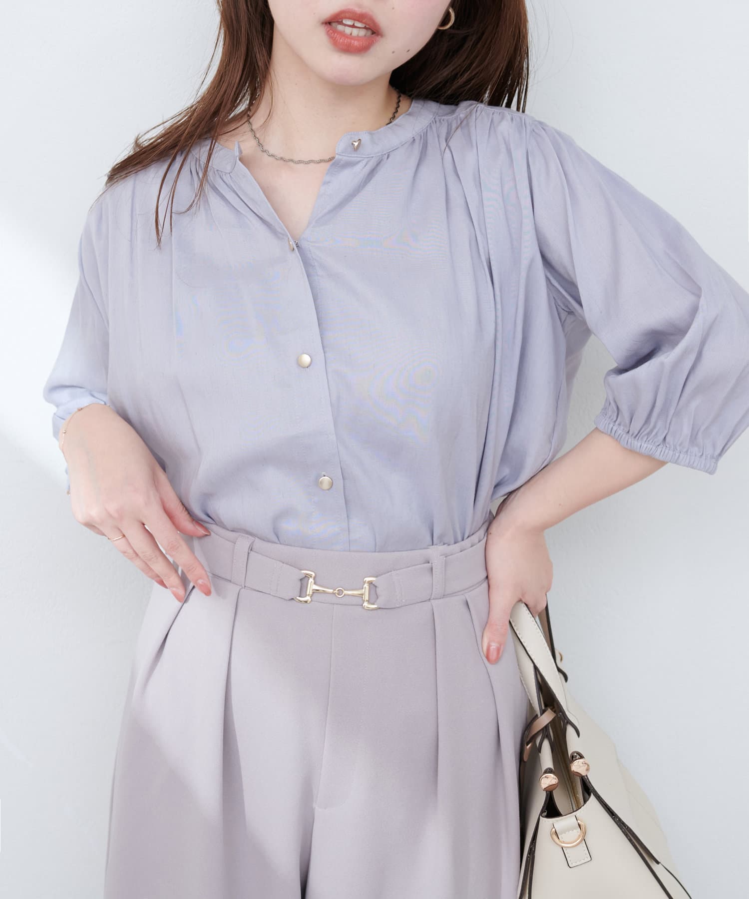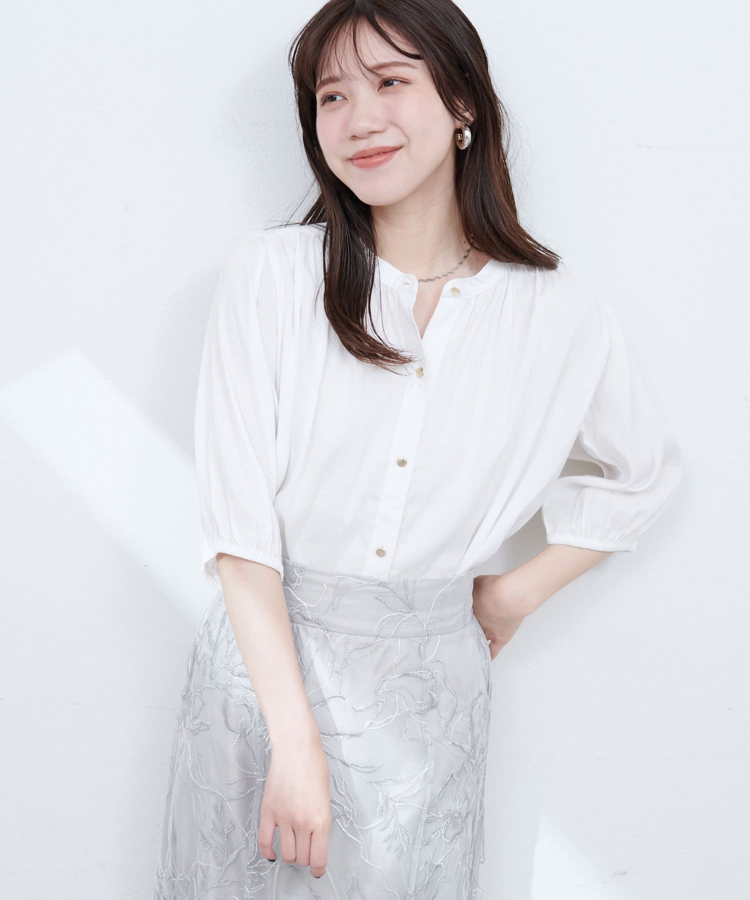 首元のギャザーと薄金ボタンが、さりげない華やかさをプラス。