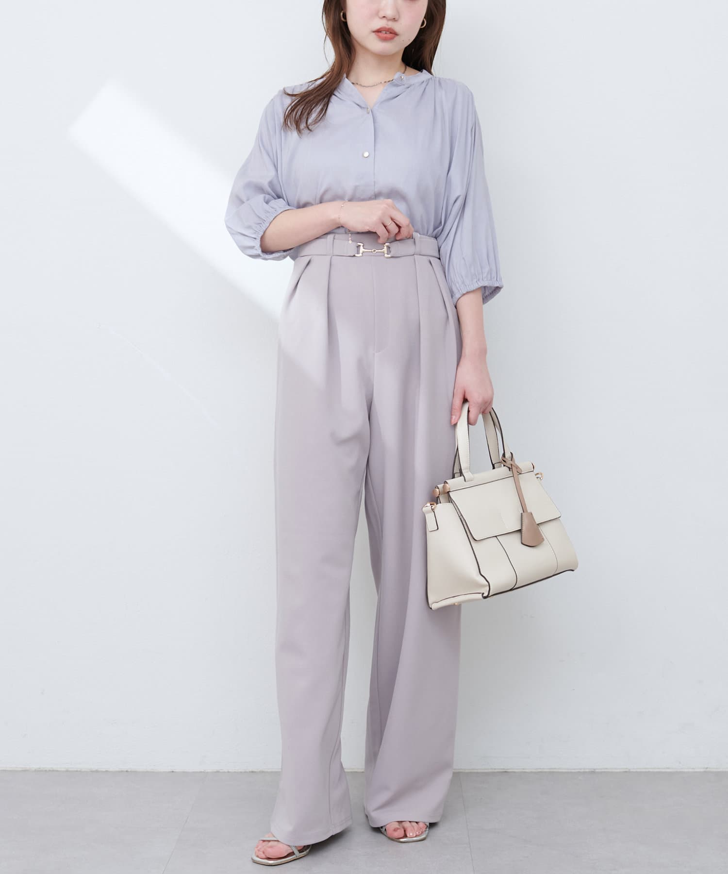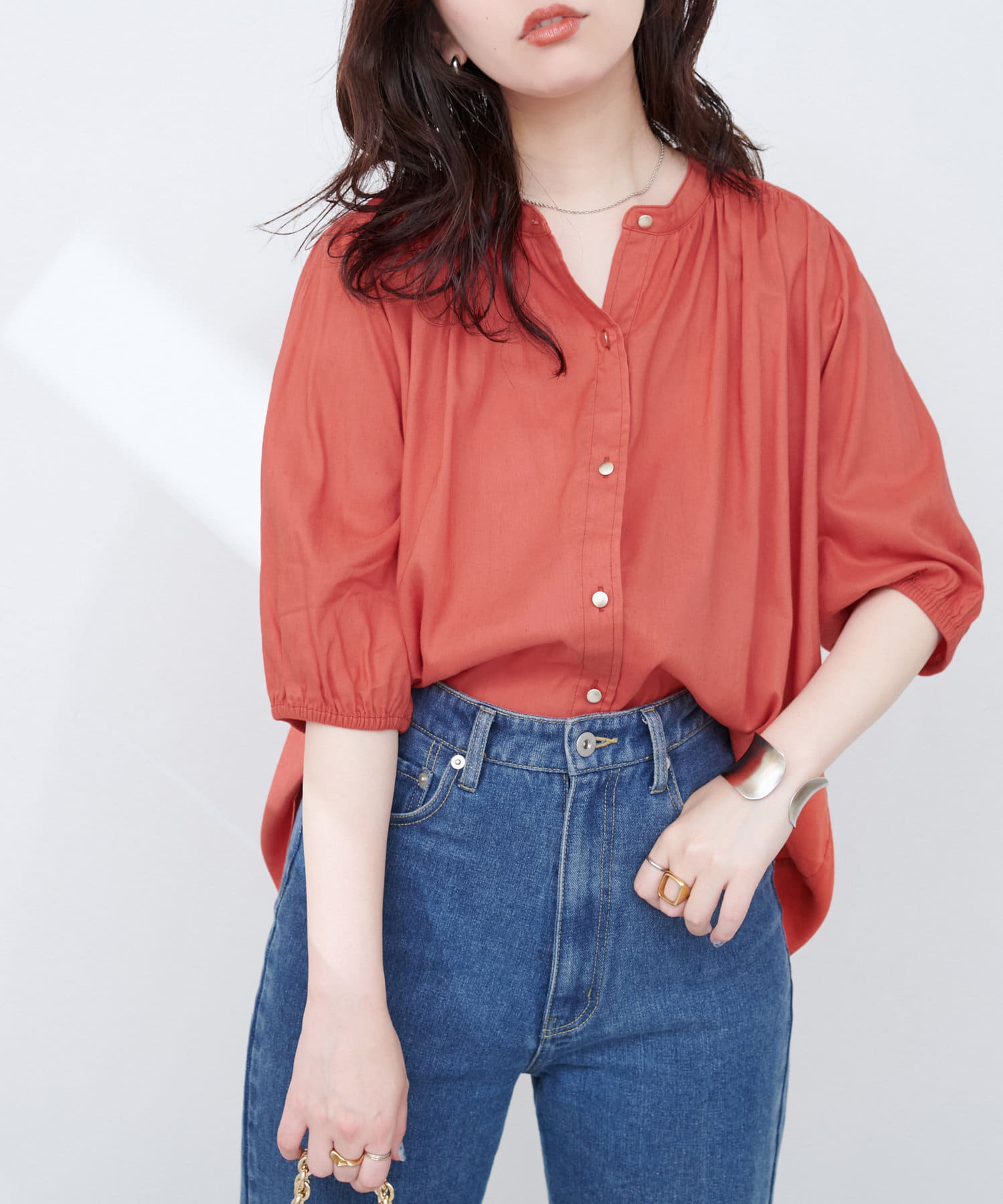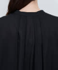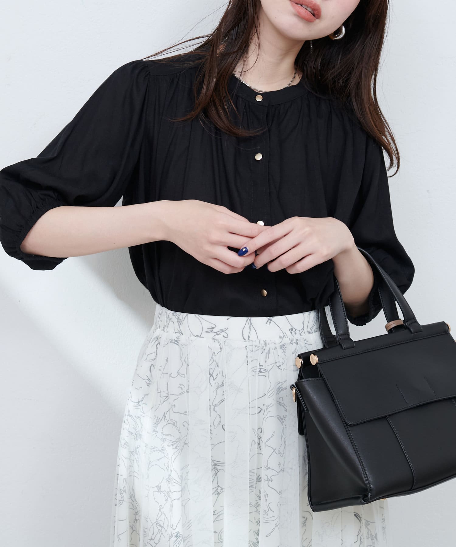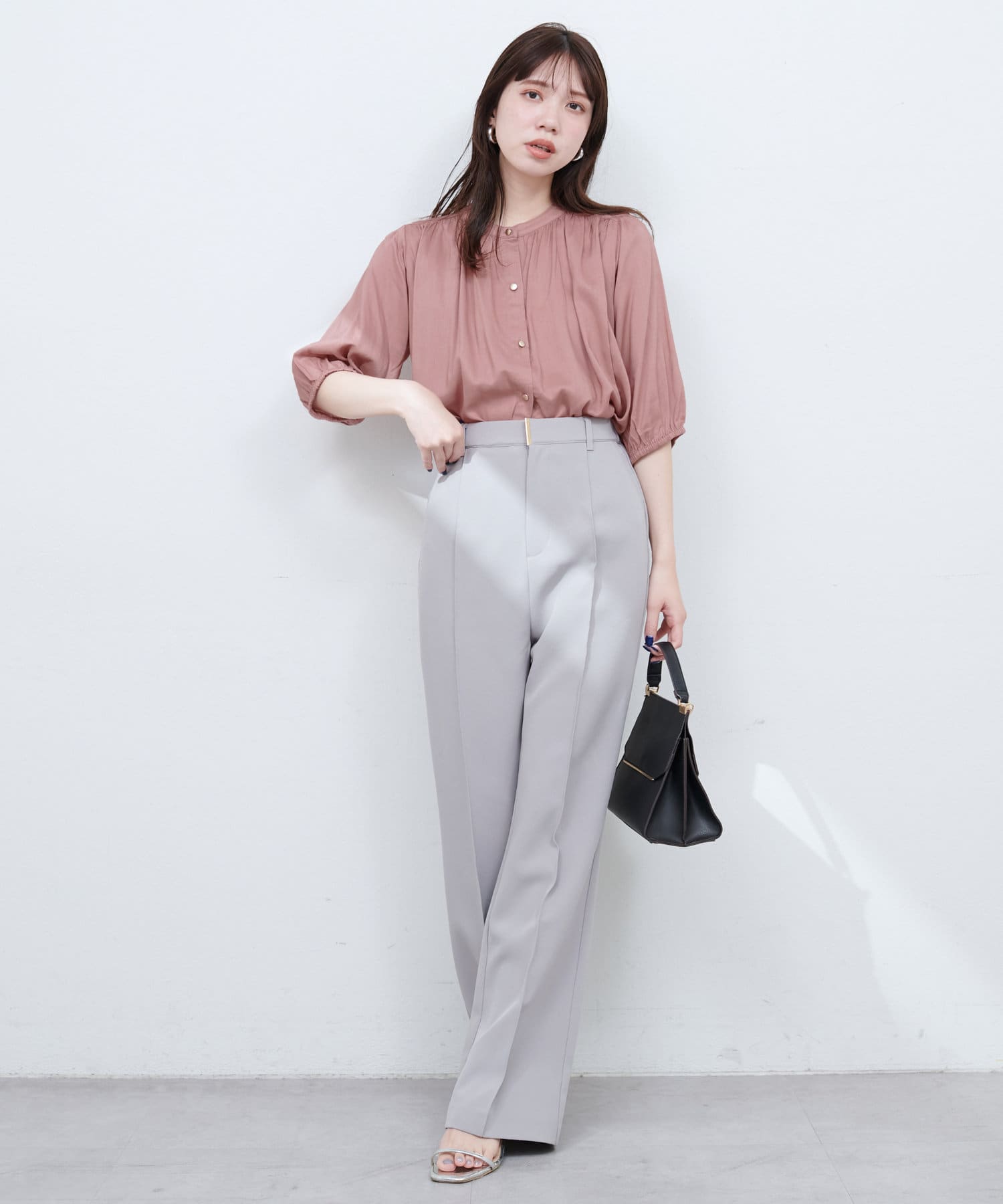 首元のギャザーと薄金ボタンが、さりげない華やかさをプラス。