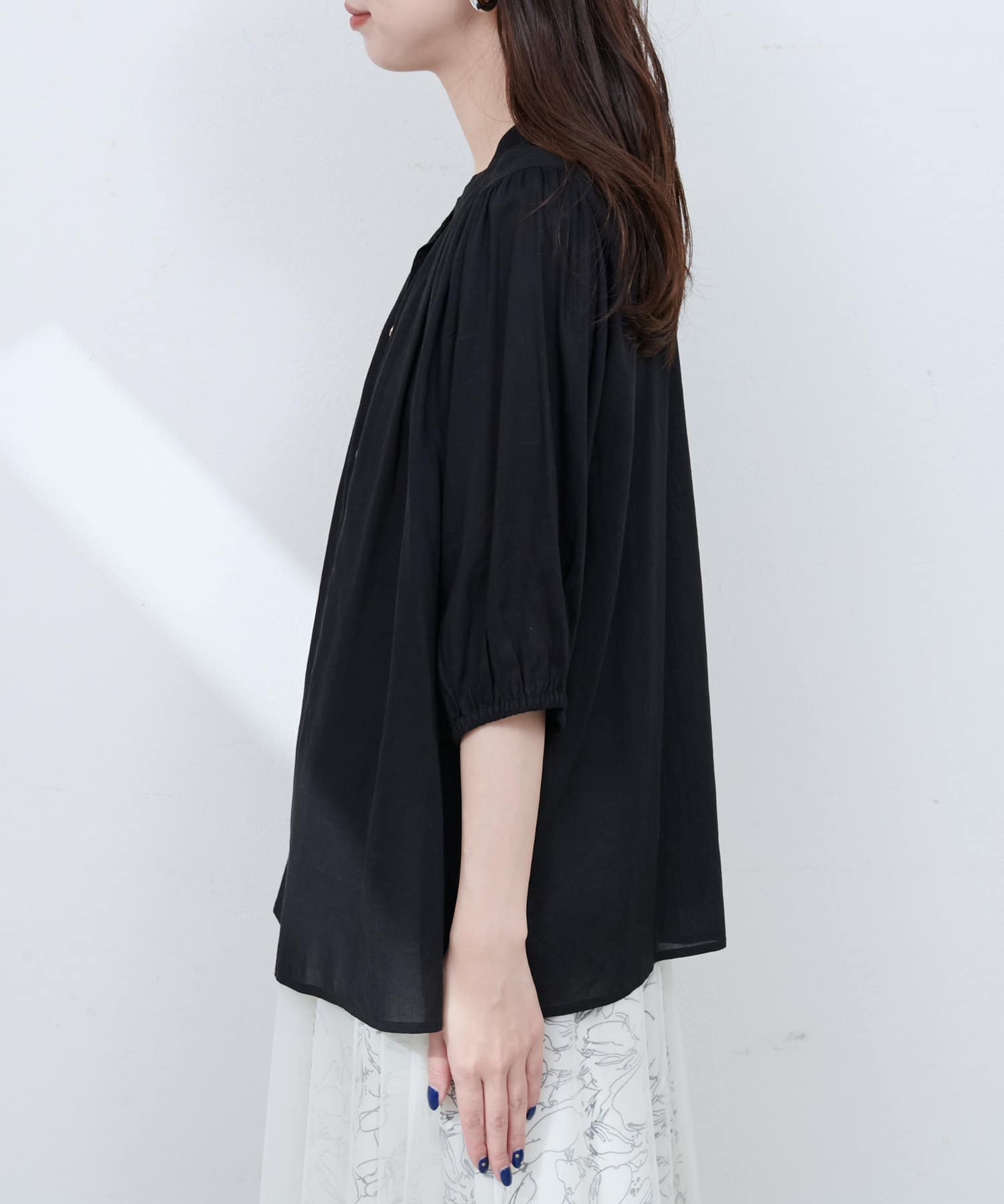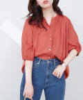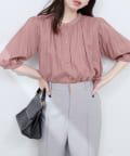 ふんわりとしたシルエットと、麻混素材ならではのナチュラルな風合いが魅力のギャザーブラウス。