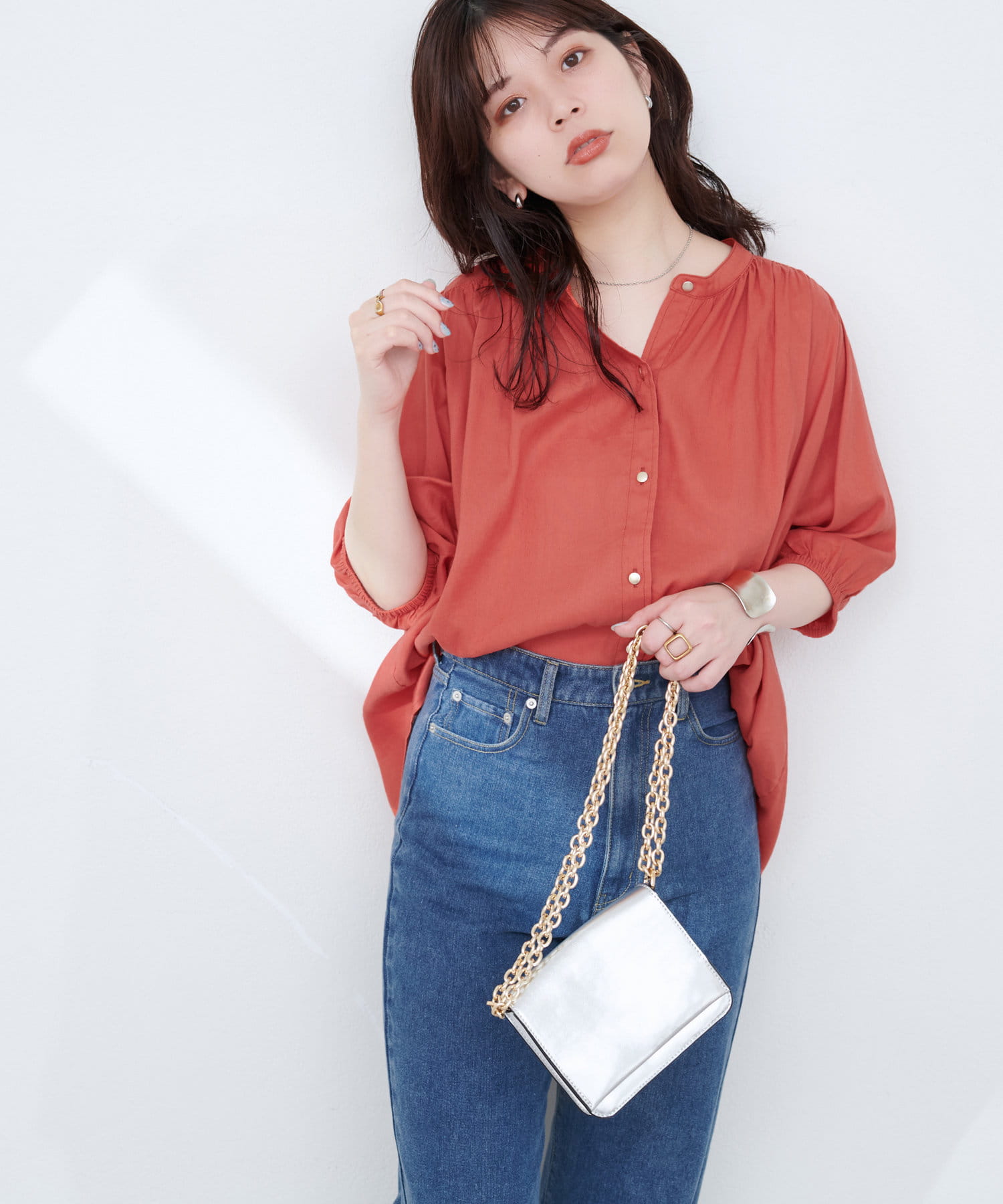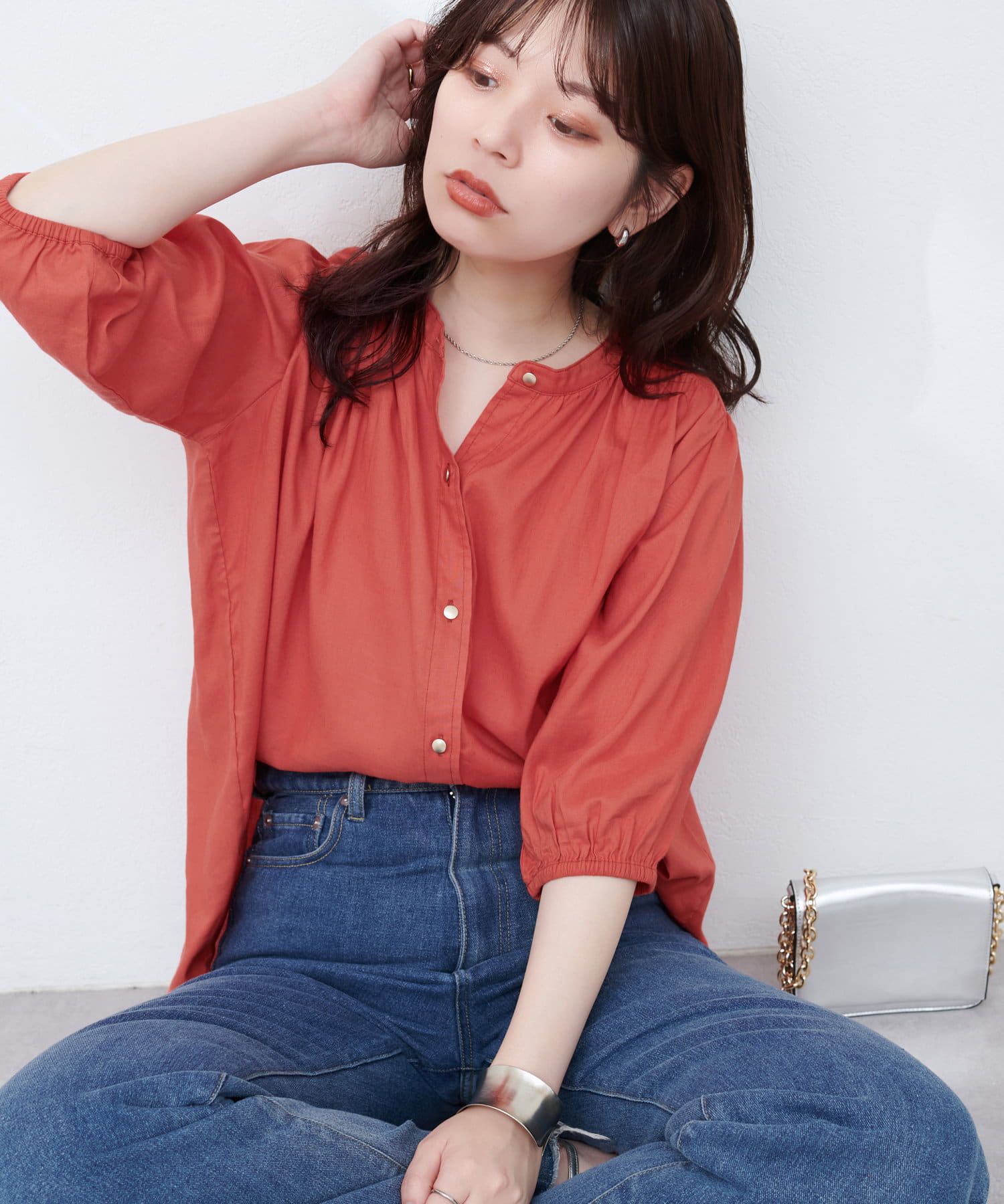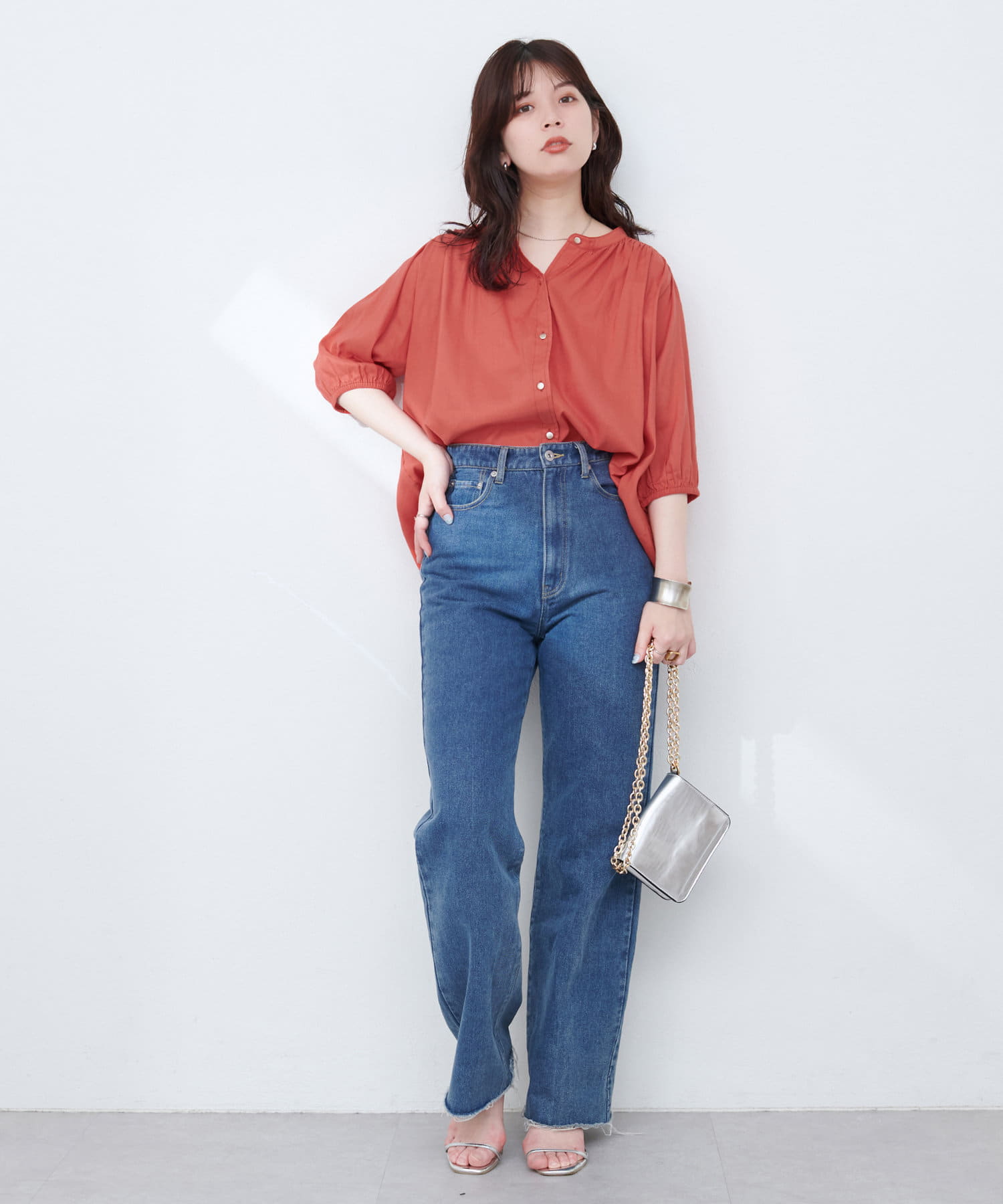 大人レディな印象のスタイリングに仕上げるのはもちろん、デニムにさらっとウエストアウトで合わせて、足元にパンプスを持ってきてもきまります。