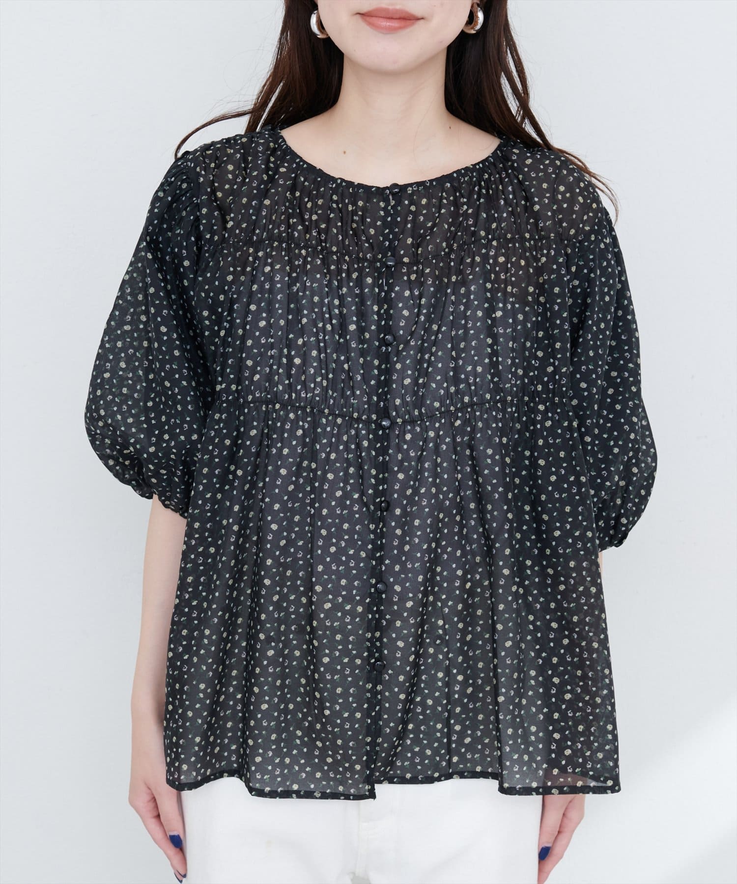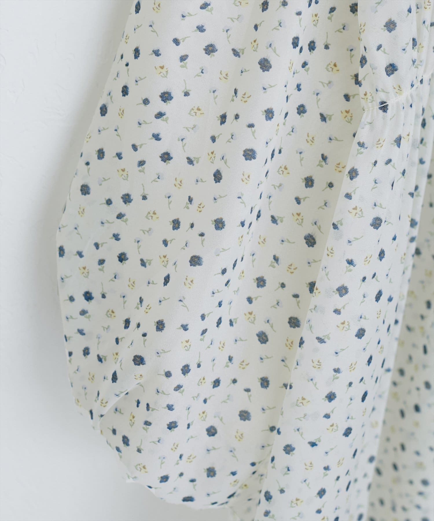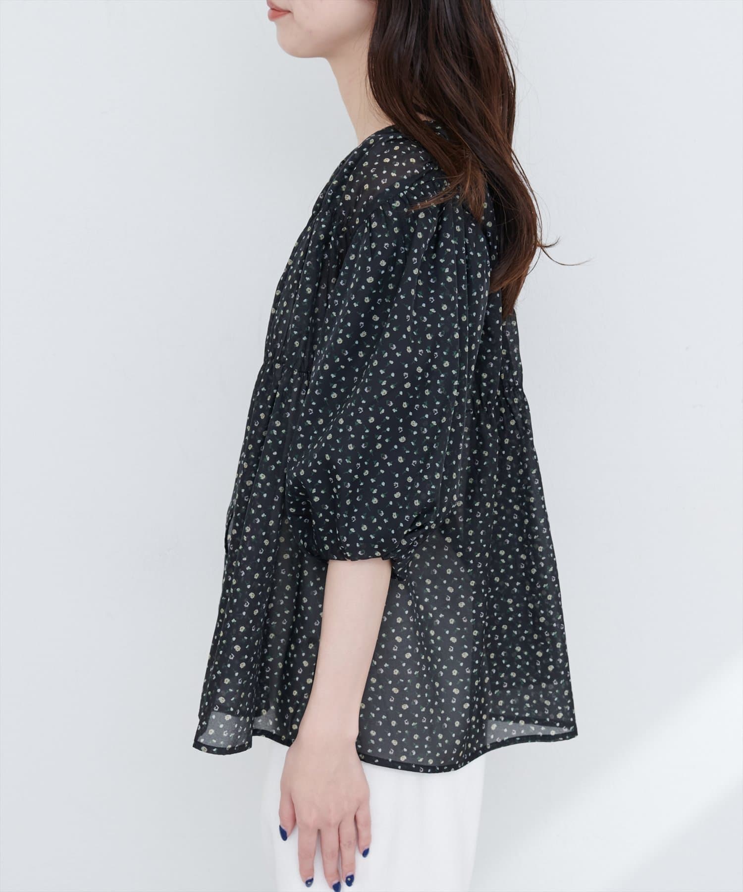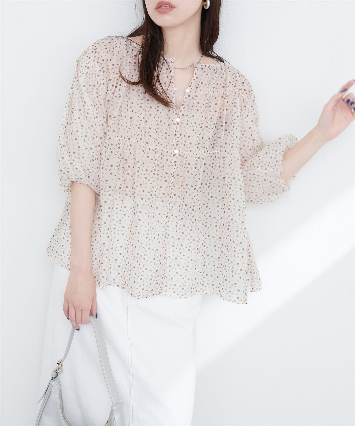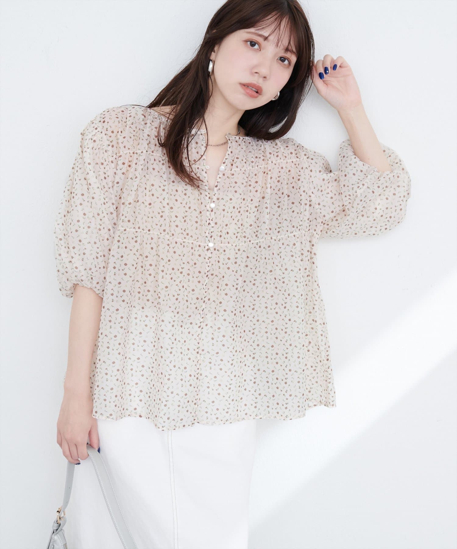 繊細なフラワープリントが、フェミニンな雰囲気を演出するブラウス。