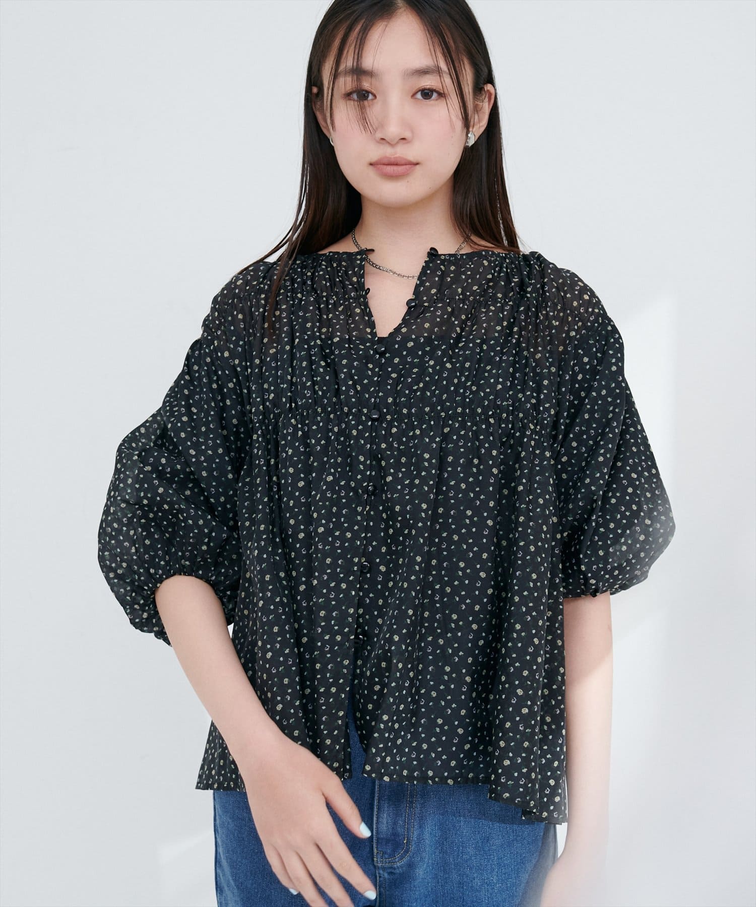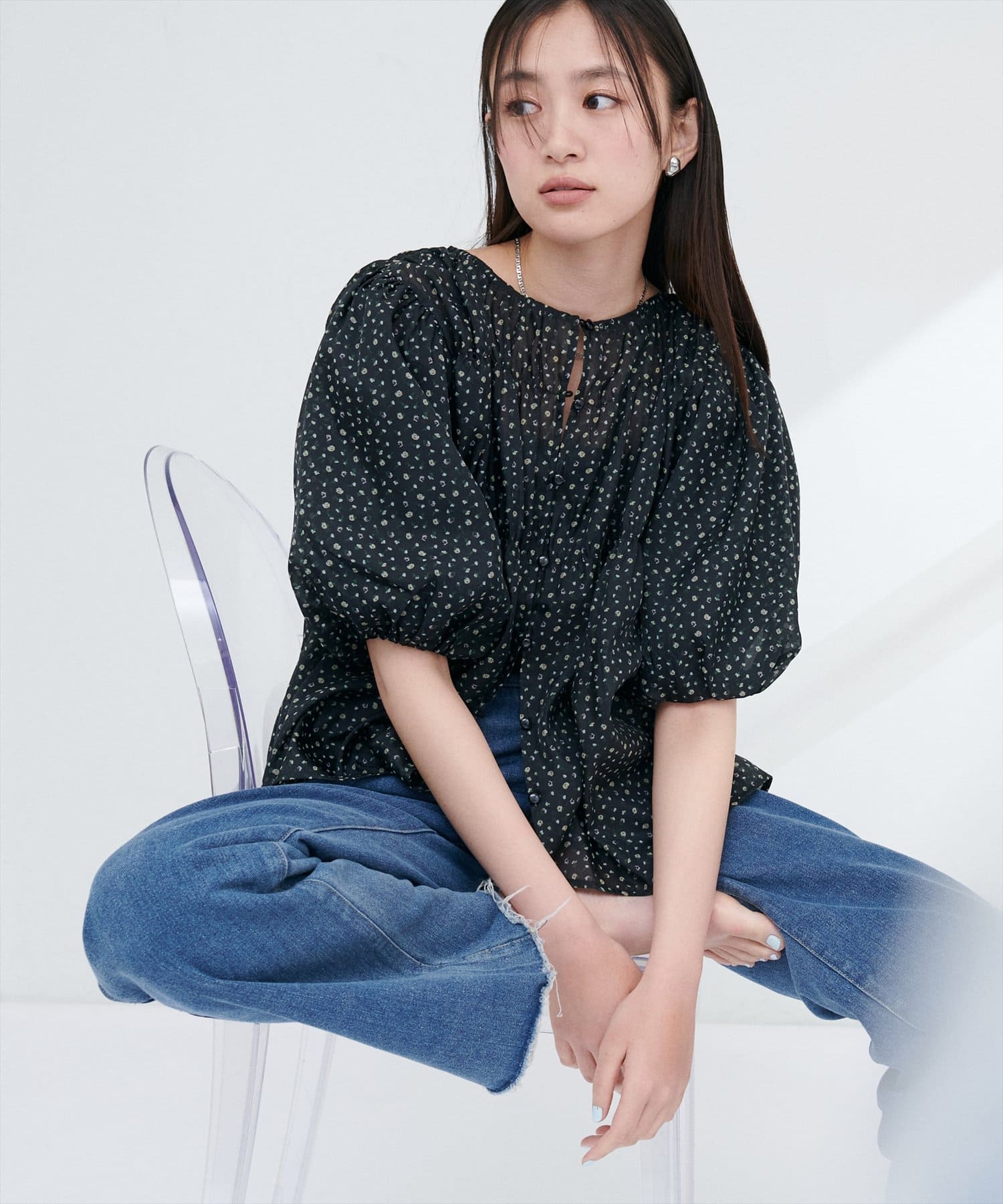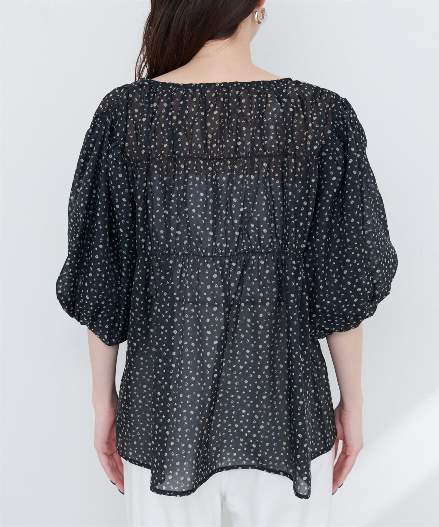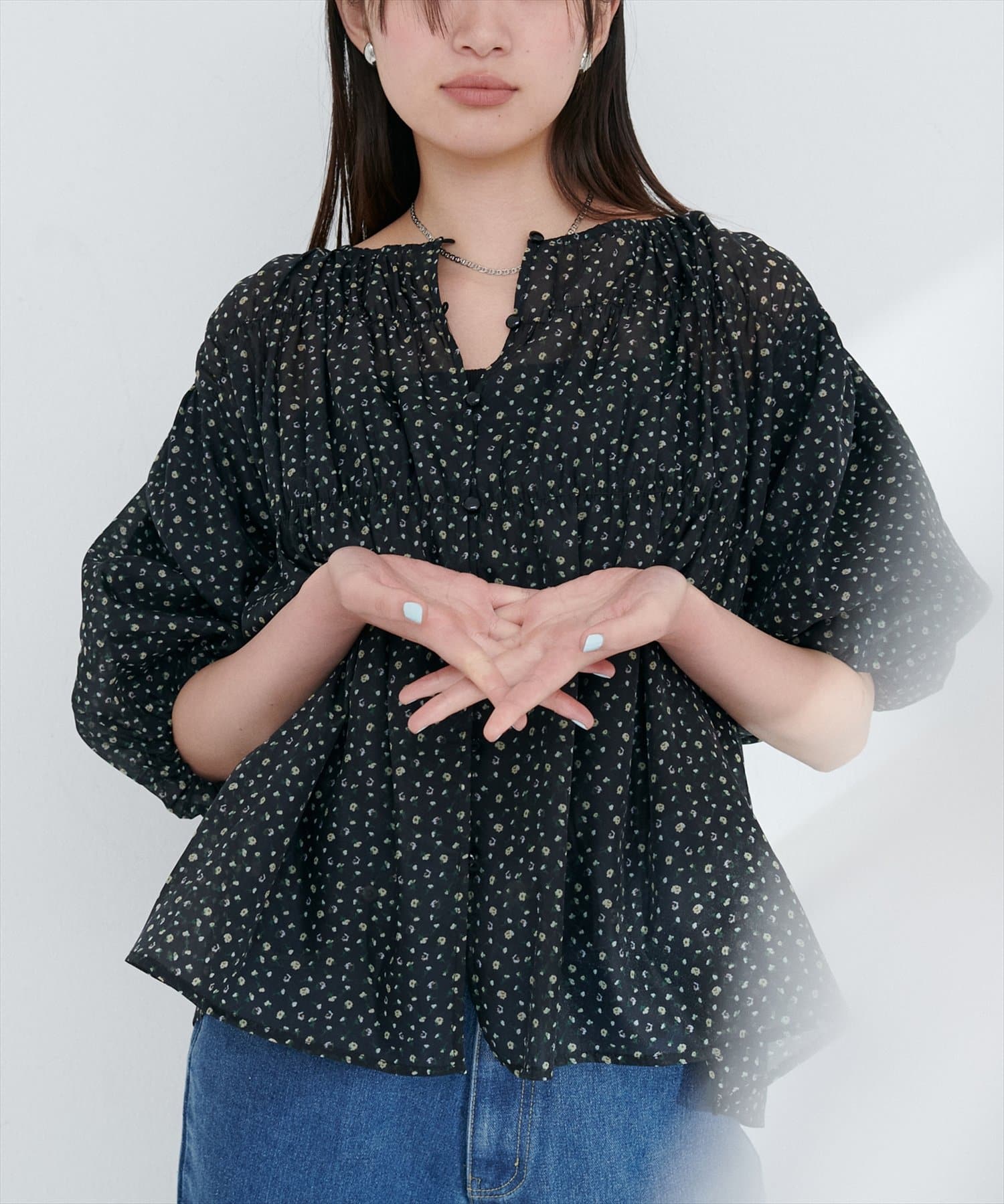 繊細なフラワープリントが、フェミニンな雰囲気を演出するブラウス。