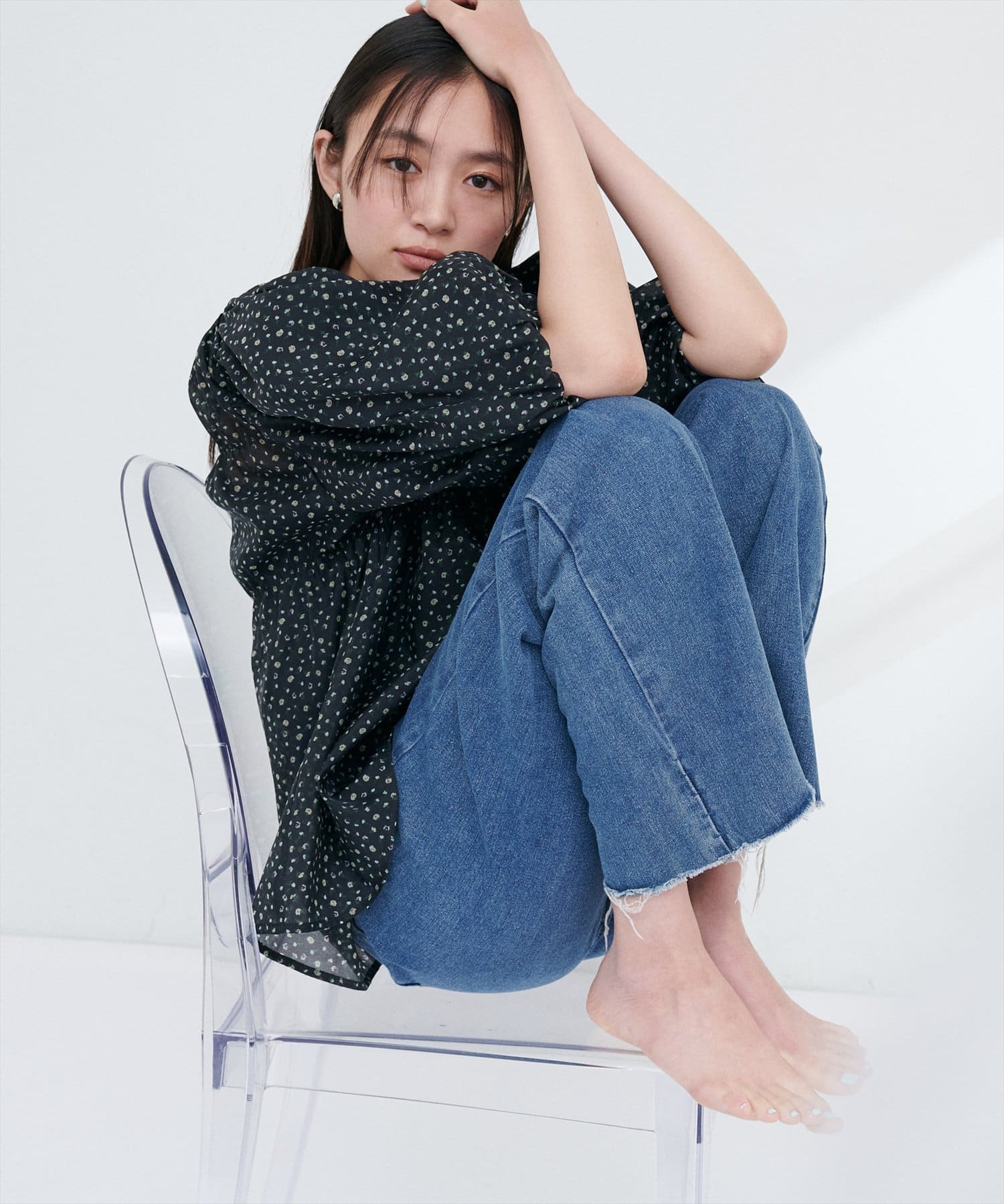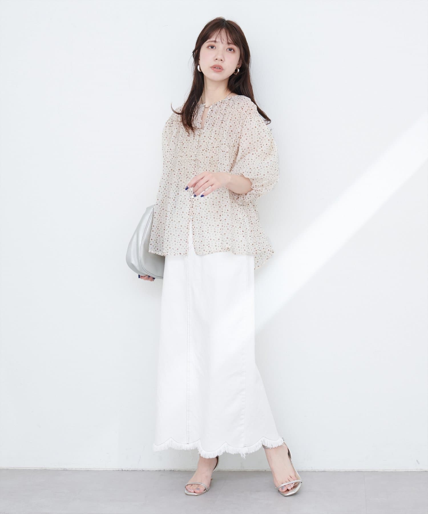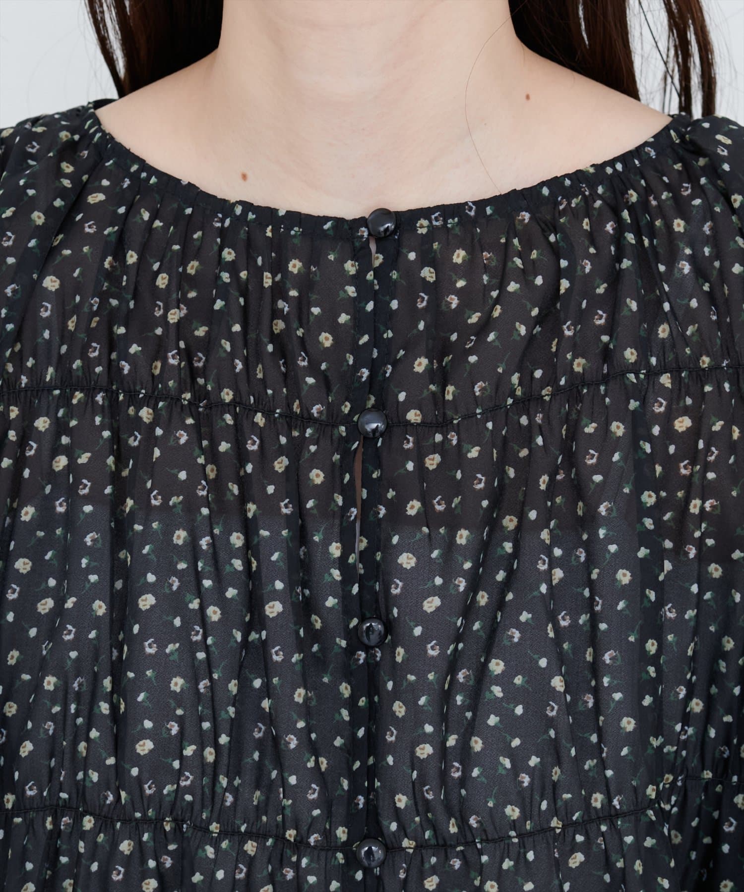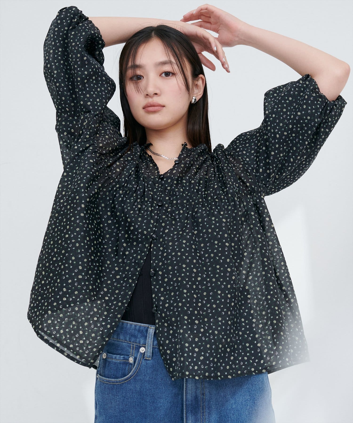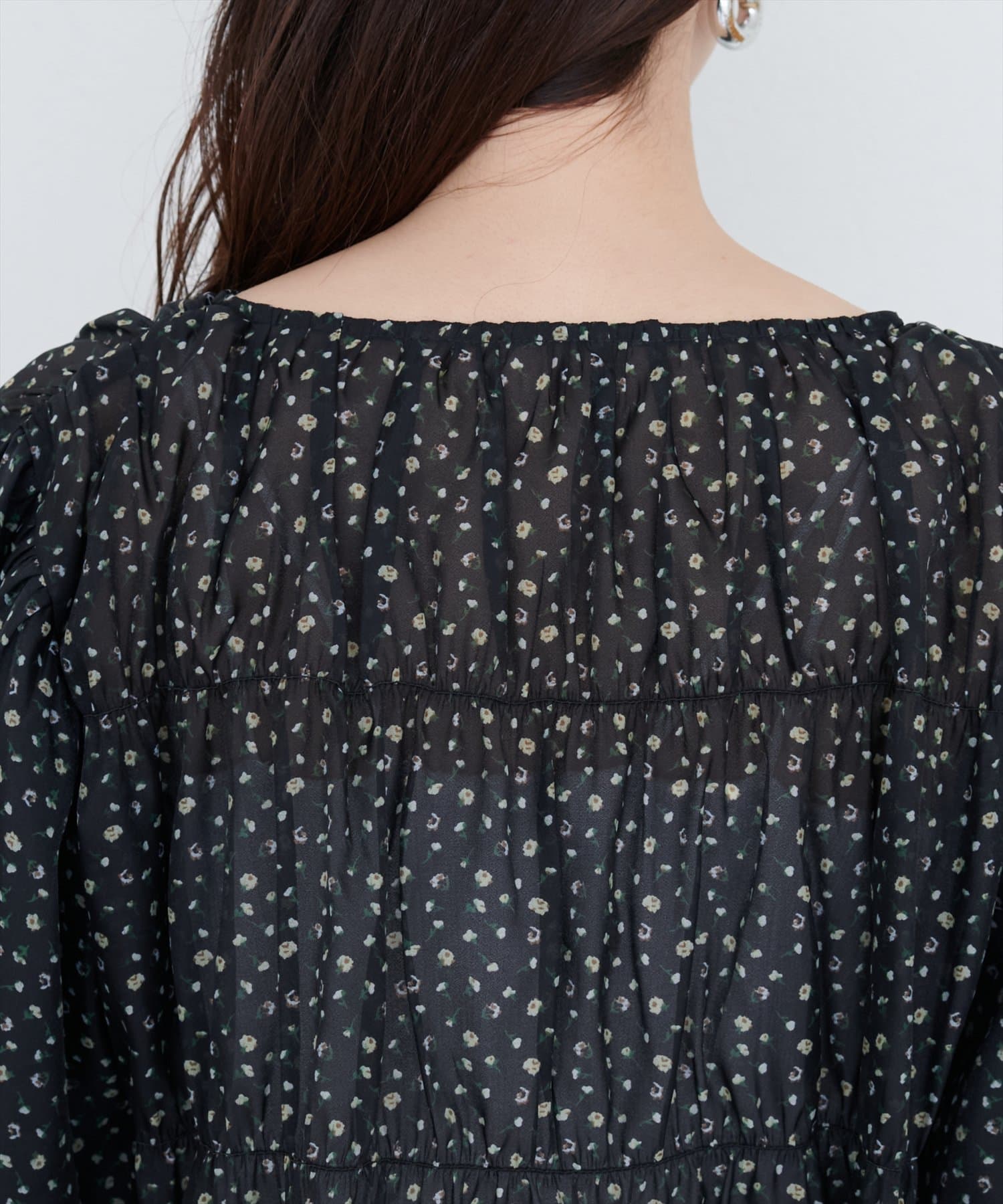繊細なフラワープリントが、フェミニンな雰囲気を演出するブラウス。