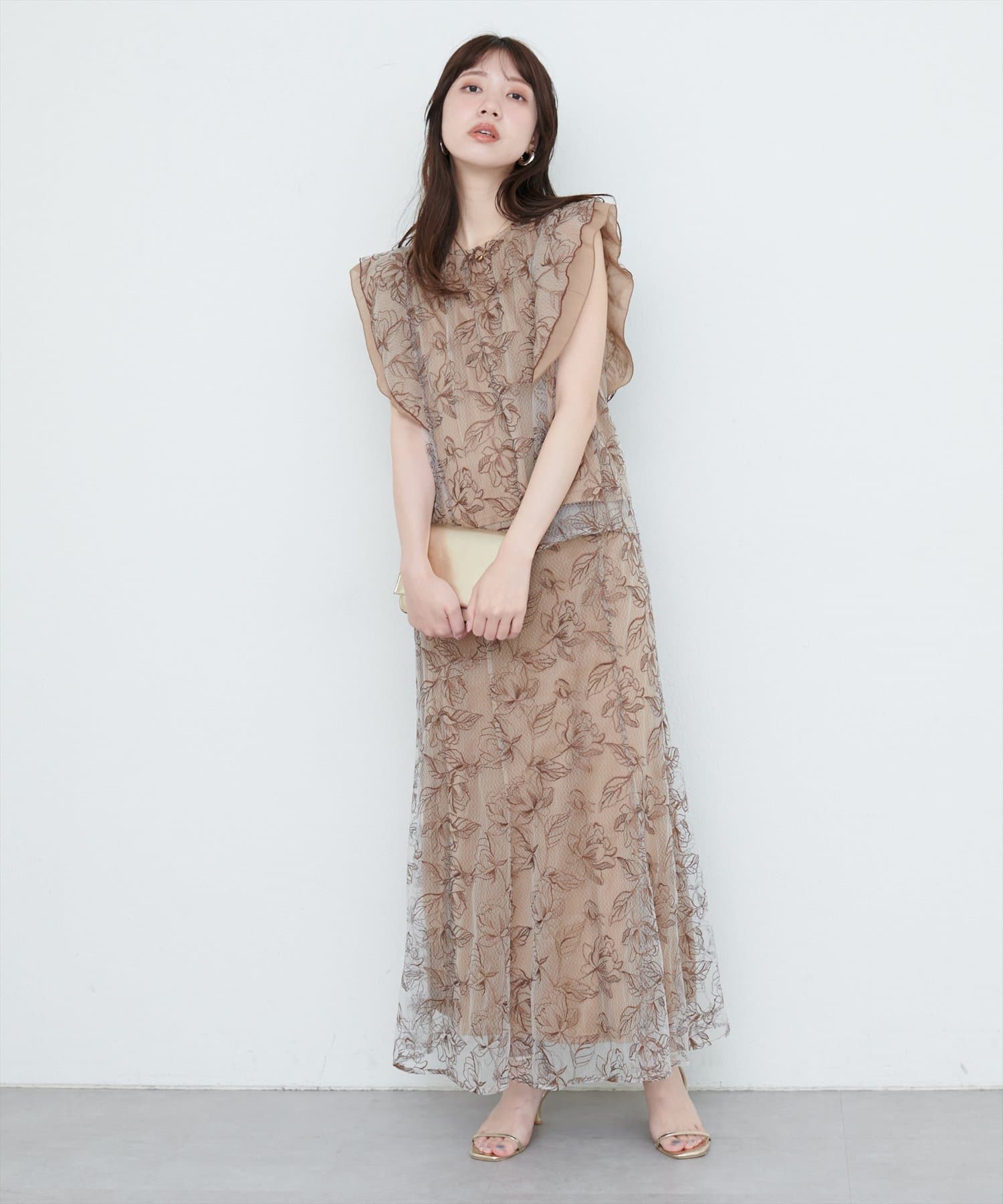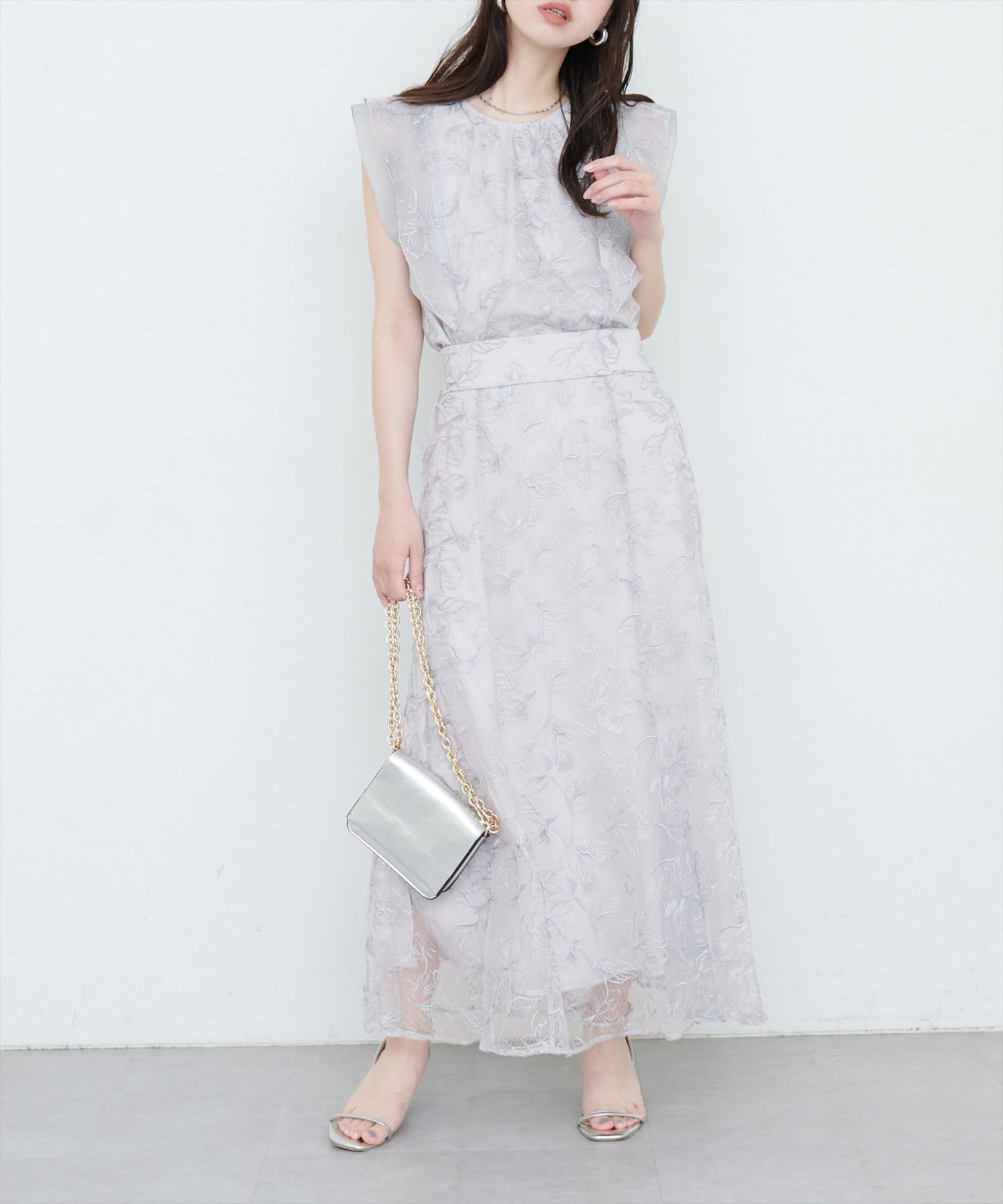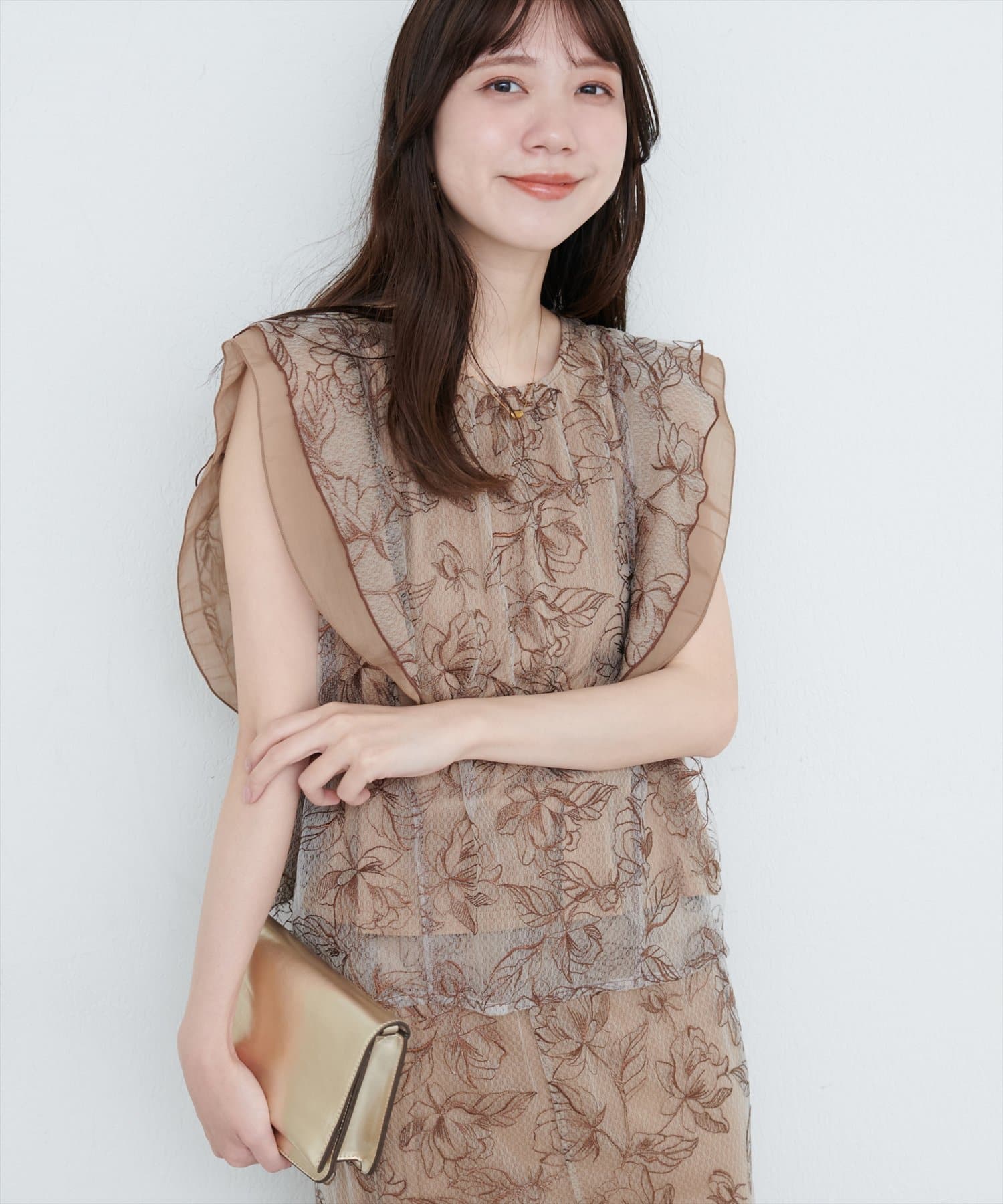シアーな素材を重ねることで、奥行きのある表情になり、細部にまでこだわった刺繍が、華やかさをプラス。