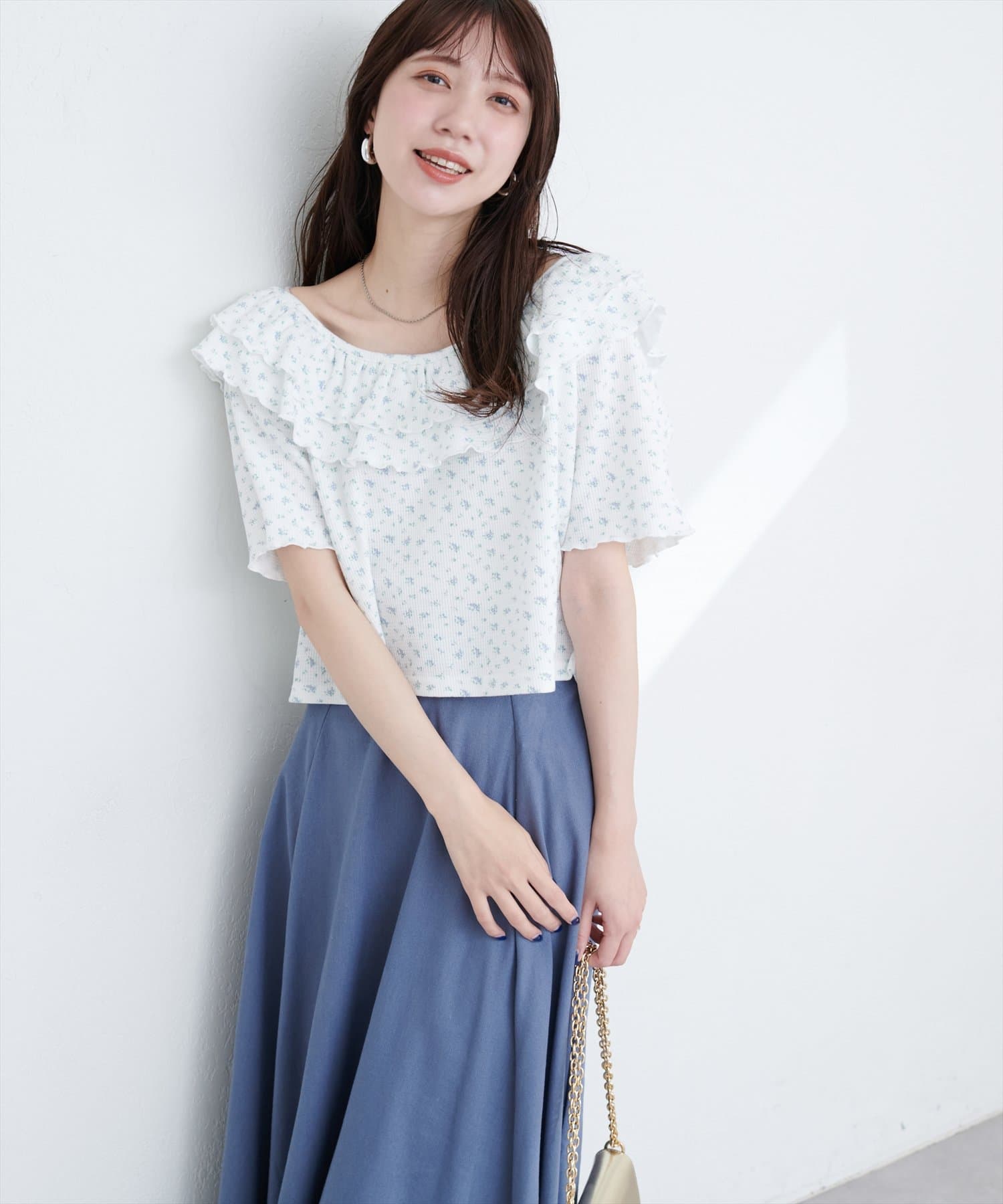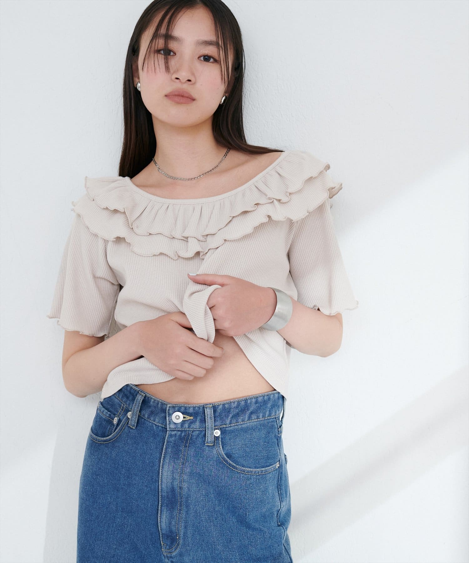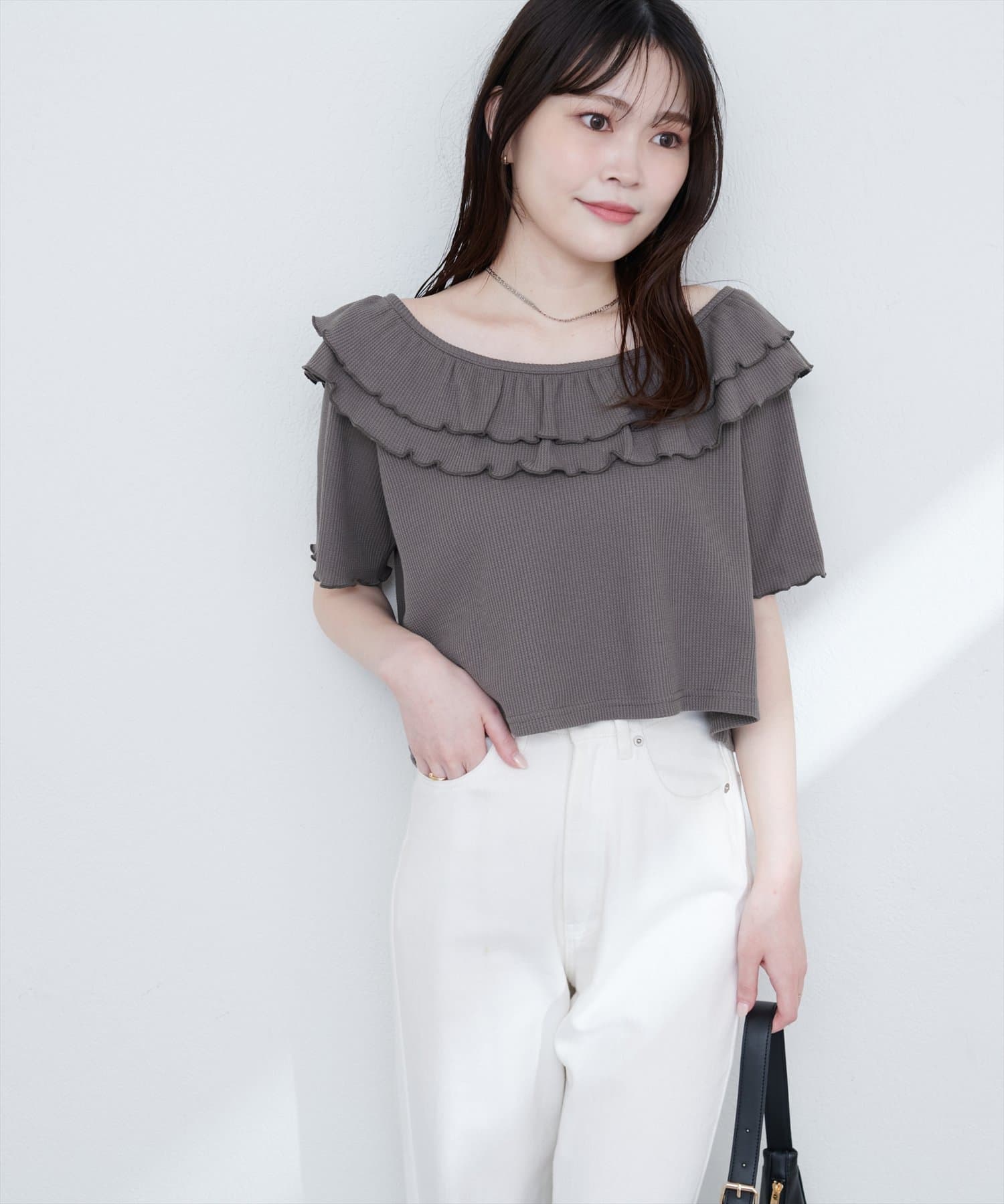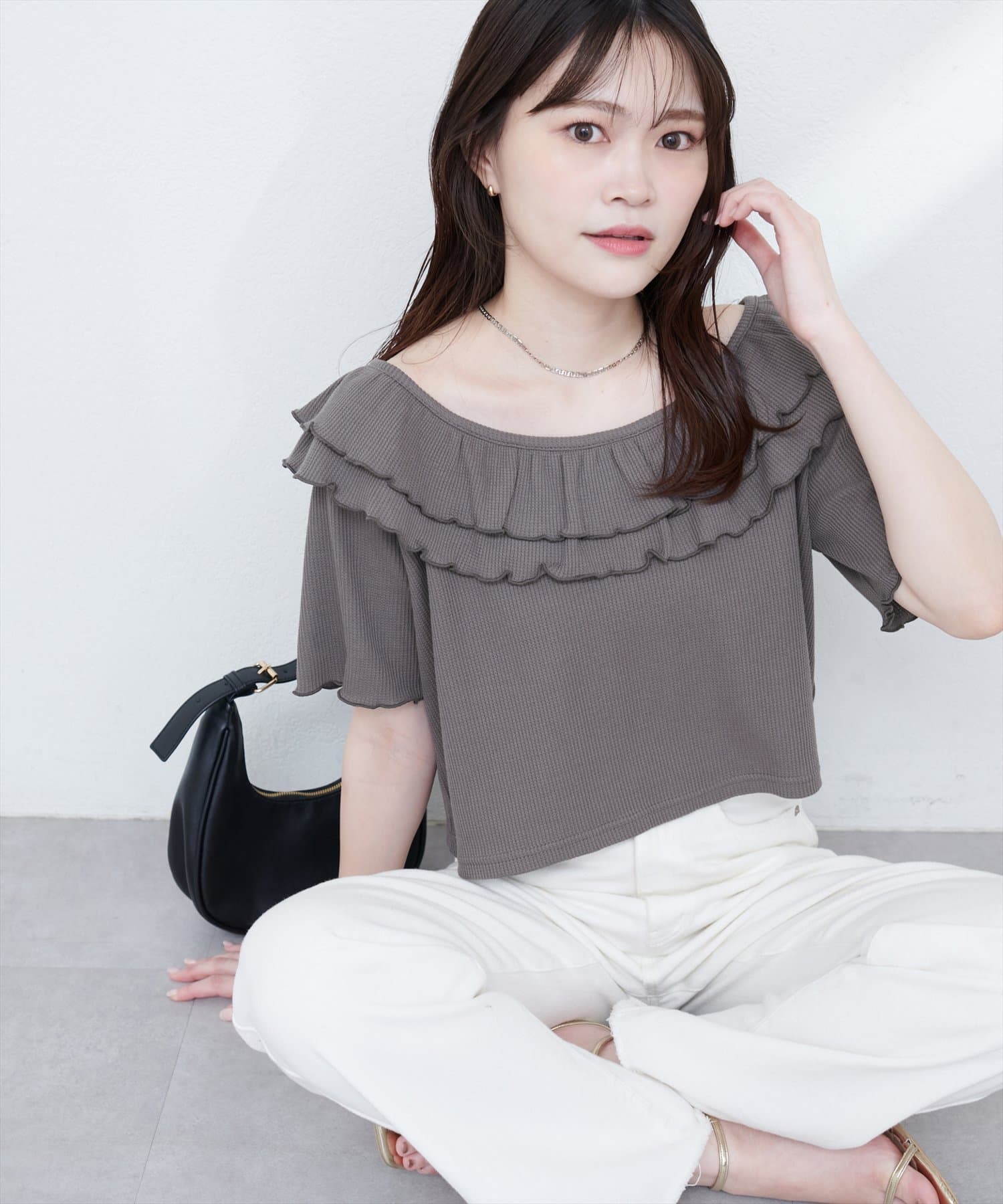 ふんわりフリルが大人可愛く、着回し力抜群のワッフルカットソー 。