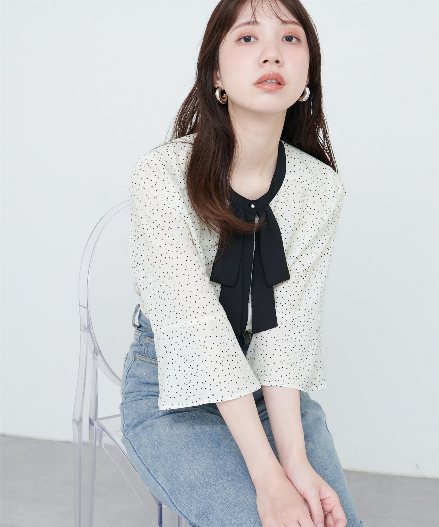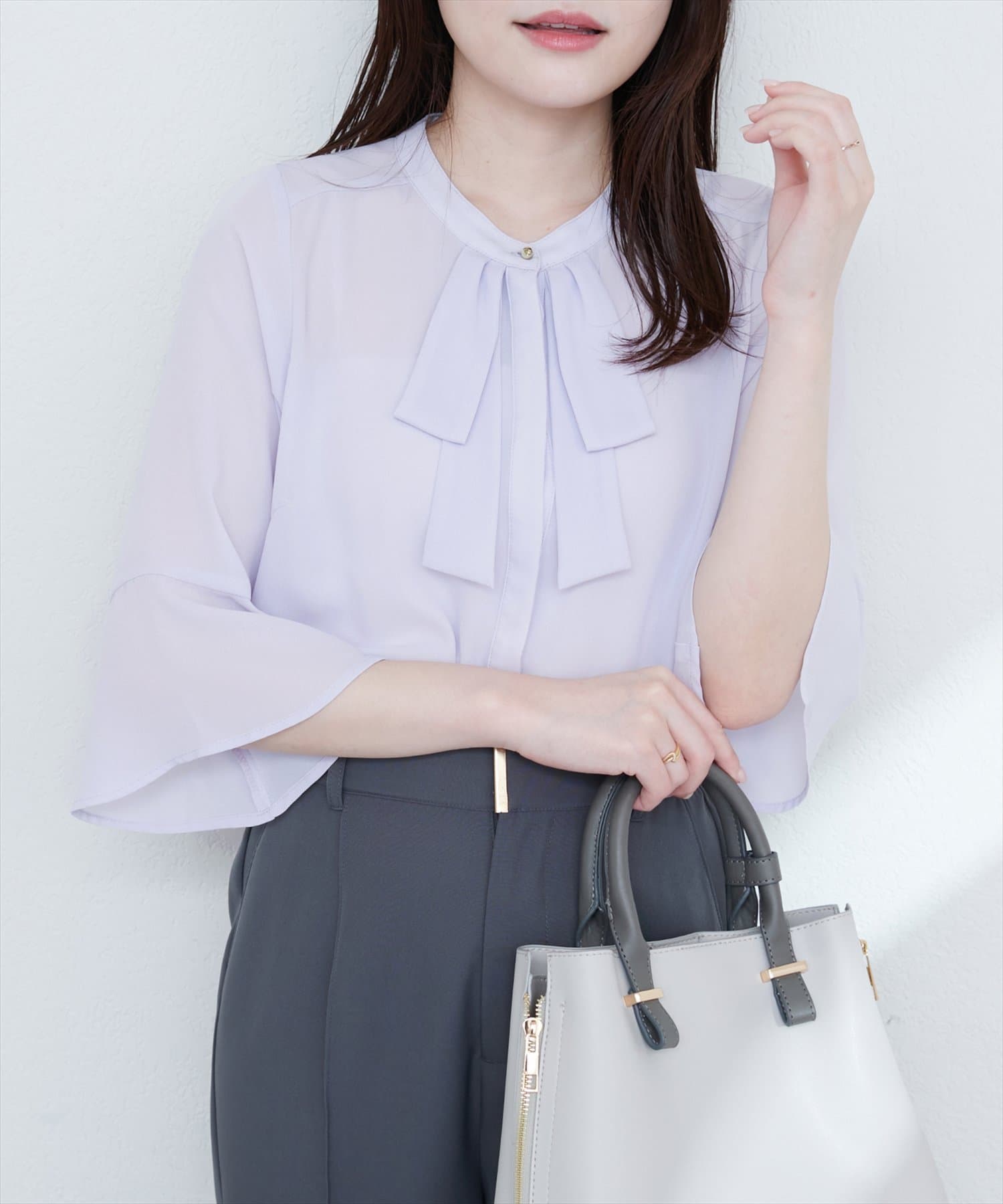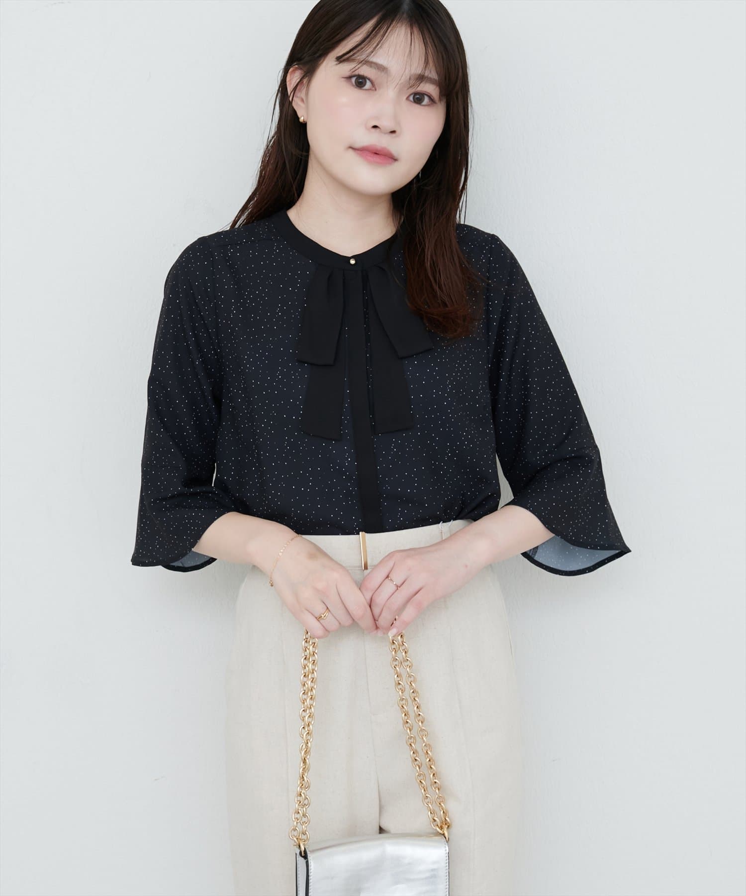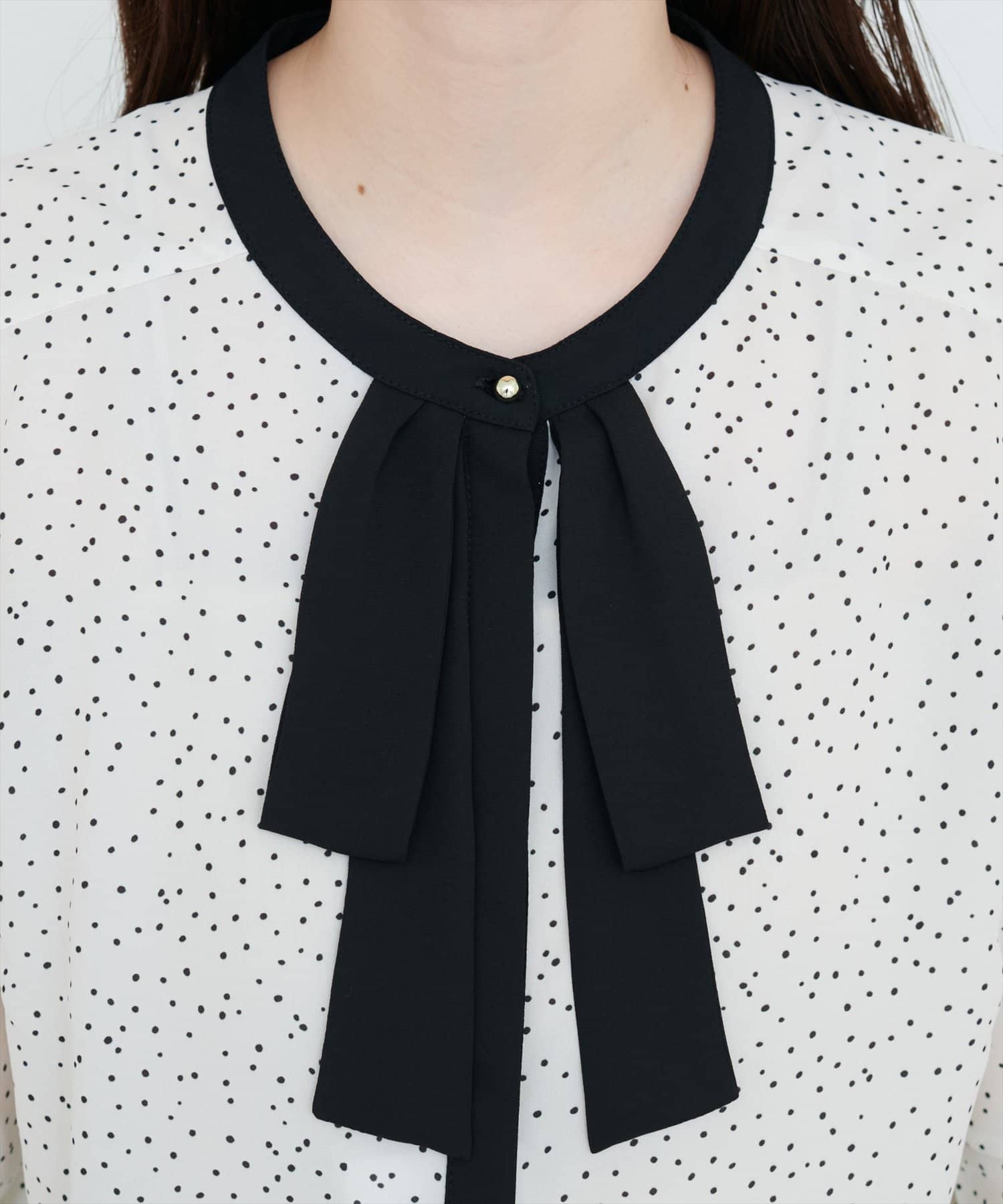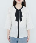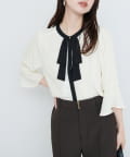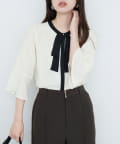 首元のボウタイリボンが、フェミニンさをプラス。