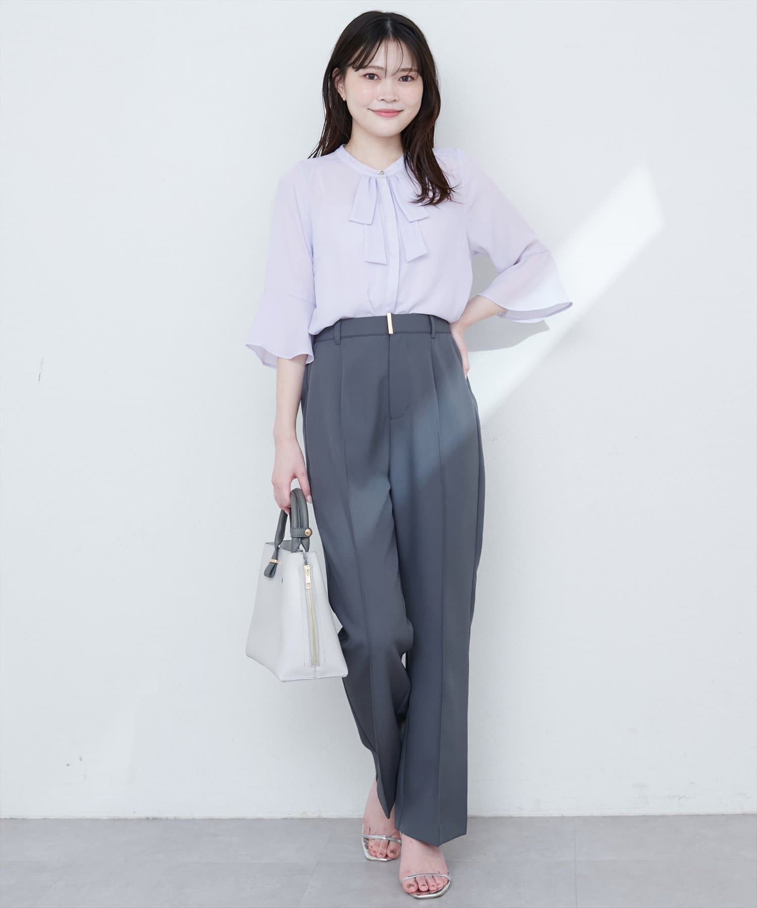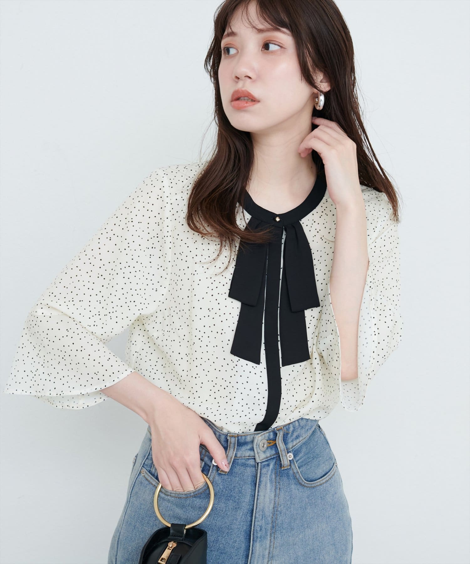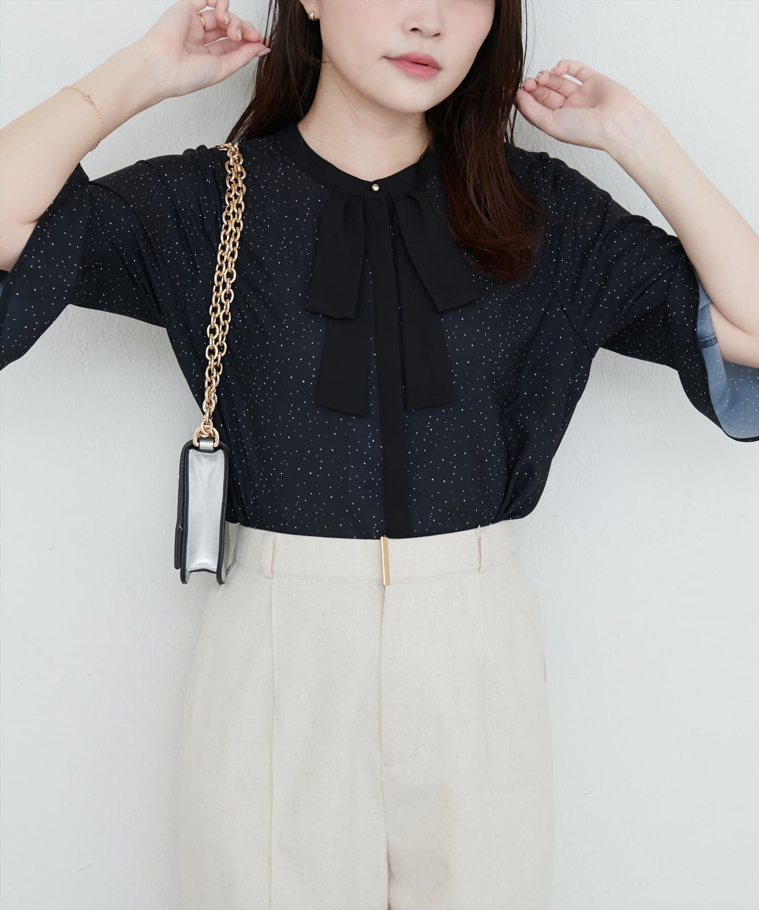 首元のボウタイリボンが、フェミニンさをプラス。