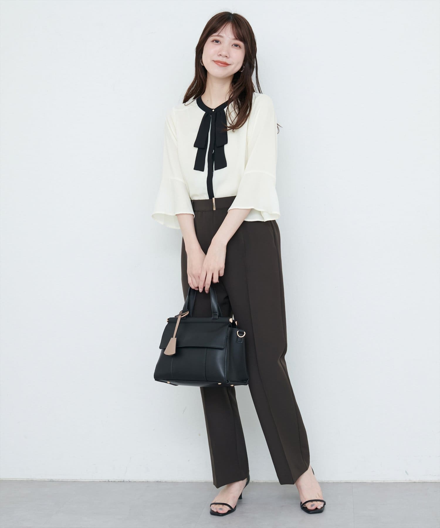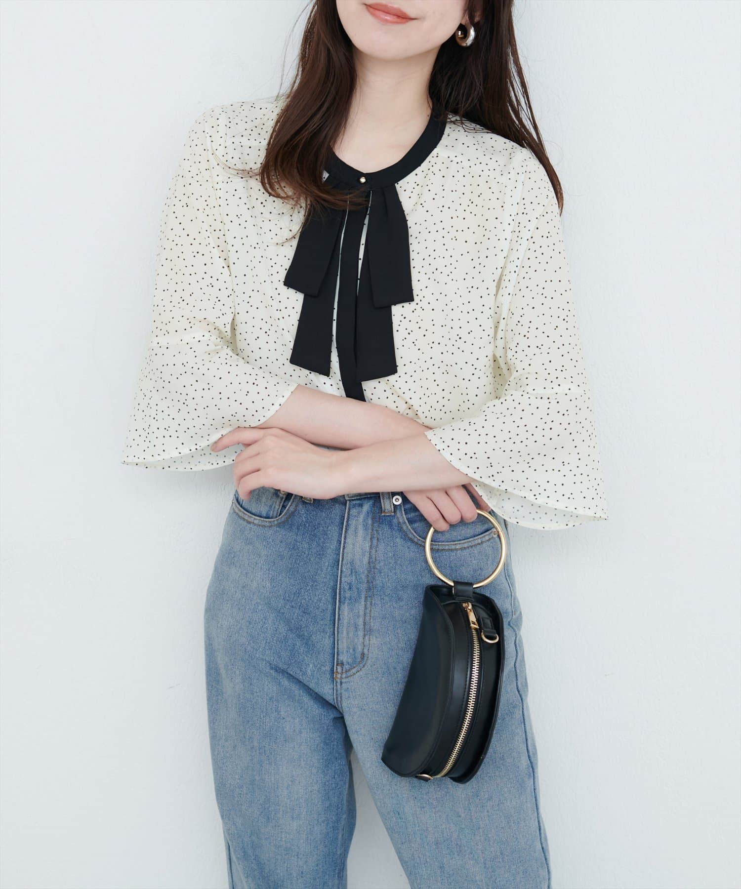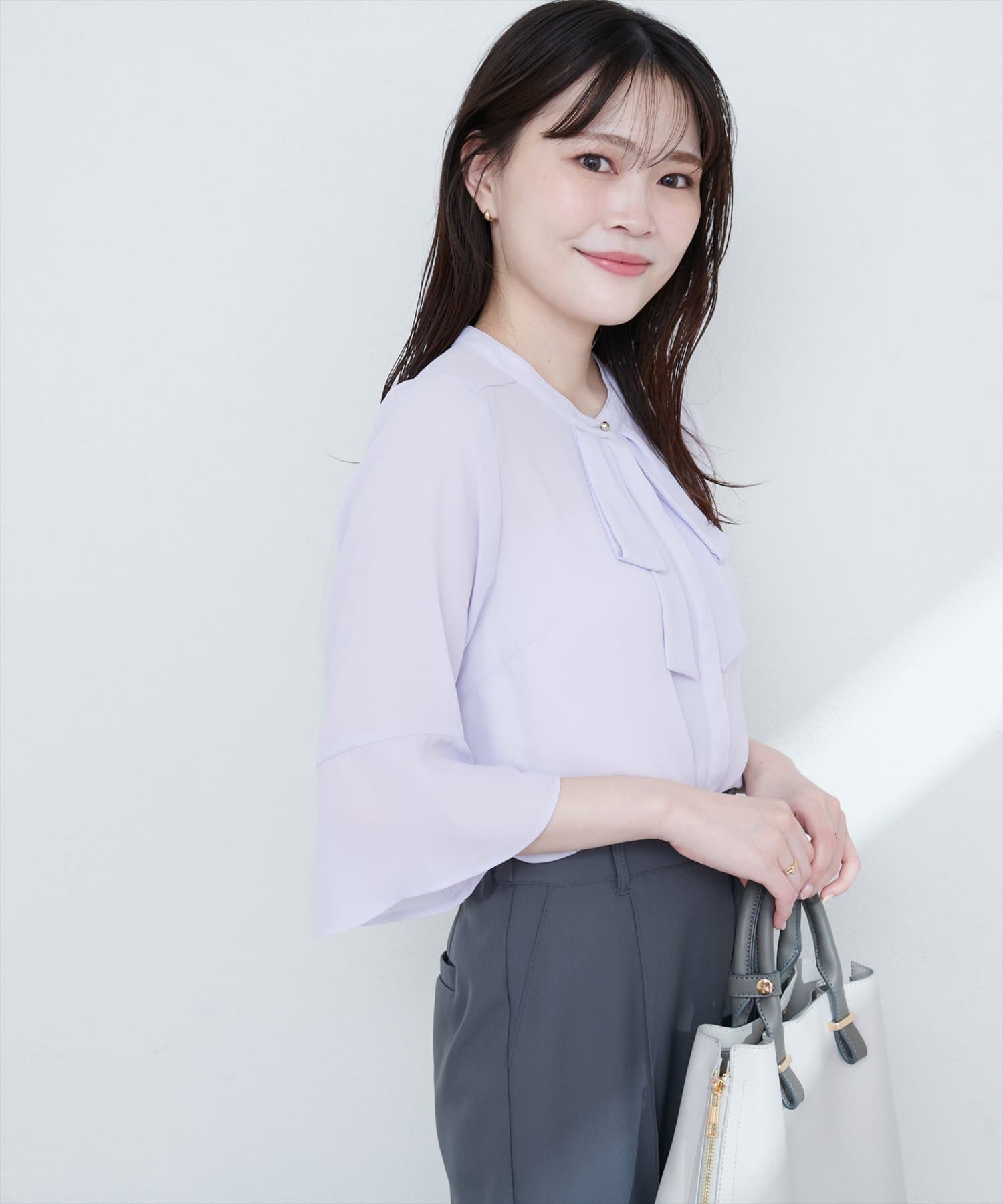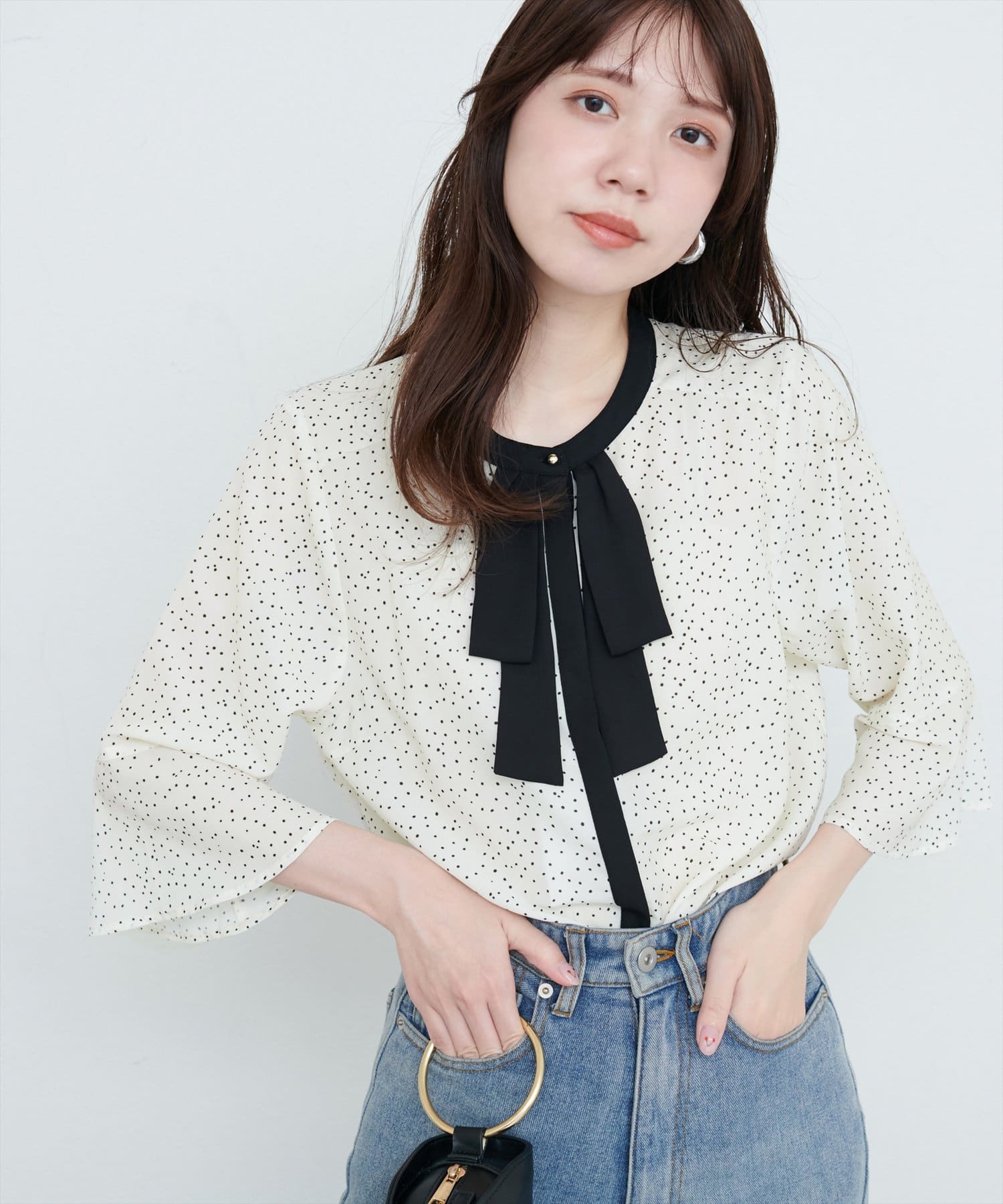 首元のボウタイリボンが、フェミニンさをプラス。