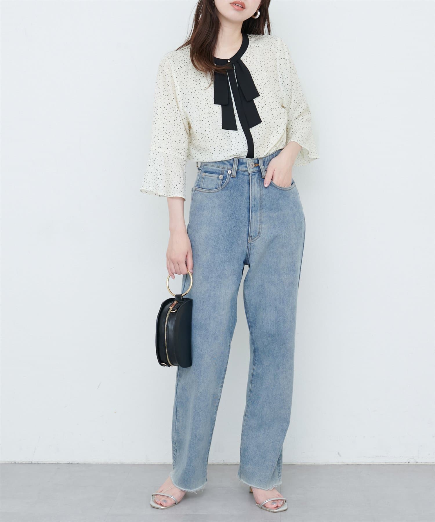 ブラウスにデニムを合わせて、カジュアルダウン。足元はパンプスやサンダルで女性らしさをプラス。