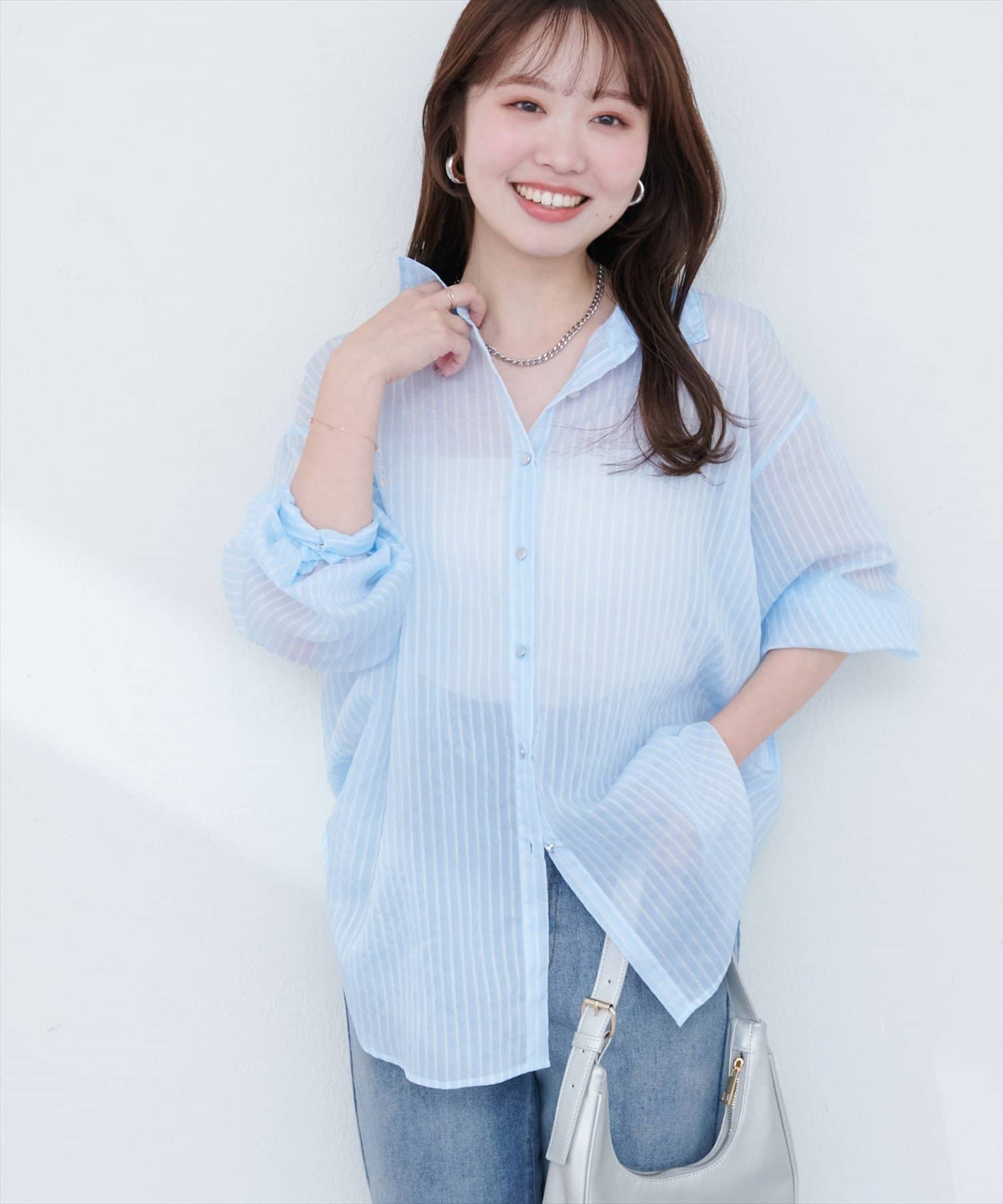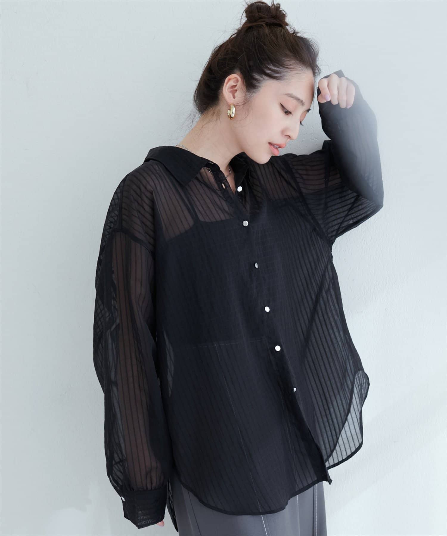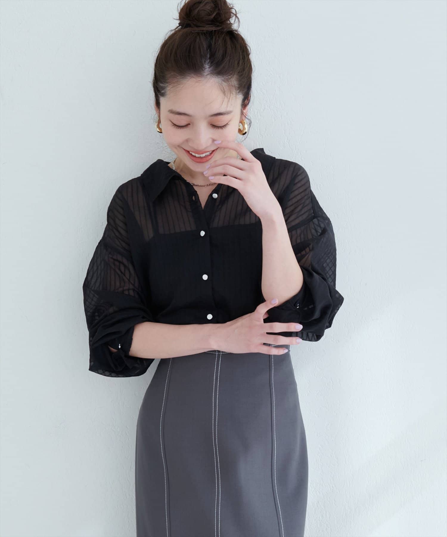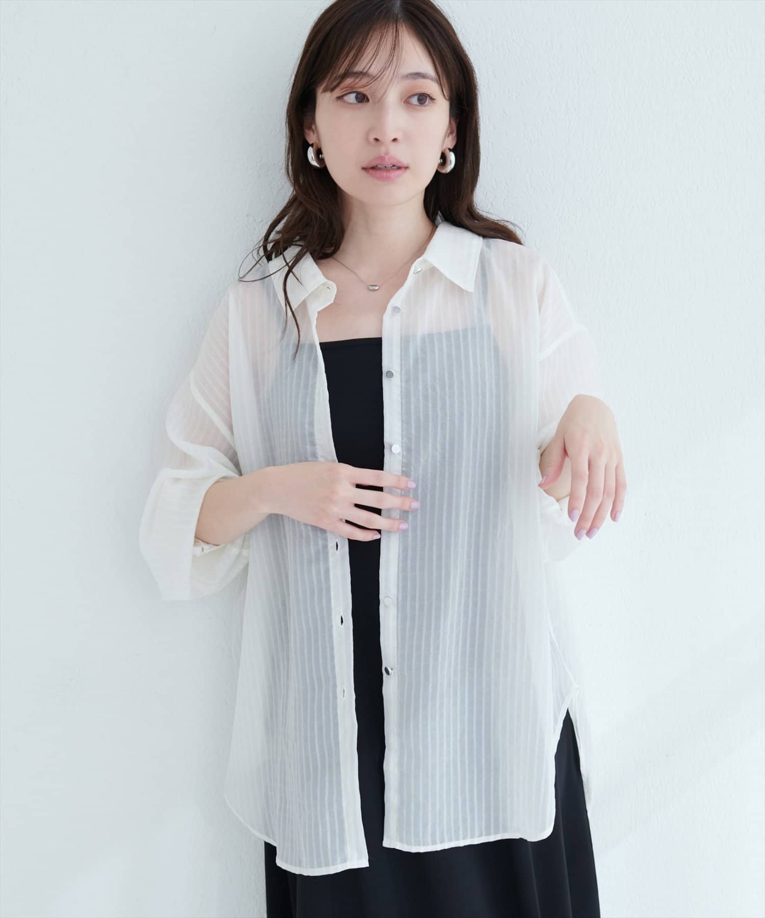 繊細なストライプが、上品な透け感を際立たせ、大人の女性らしい抜け感を演出するエアリーなシアーシャツ。