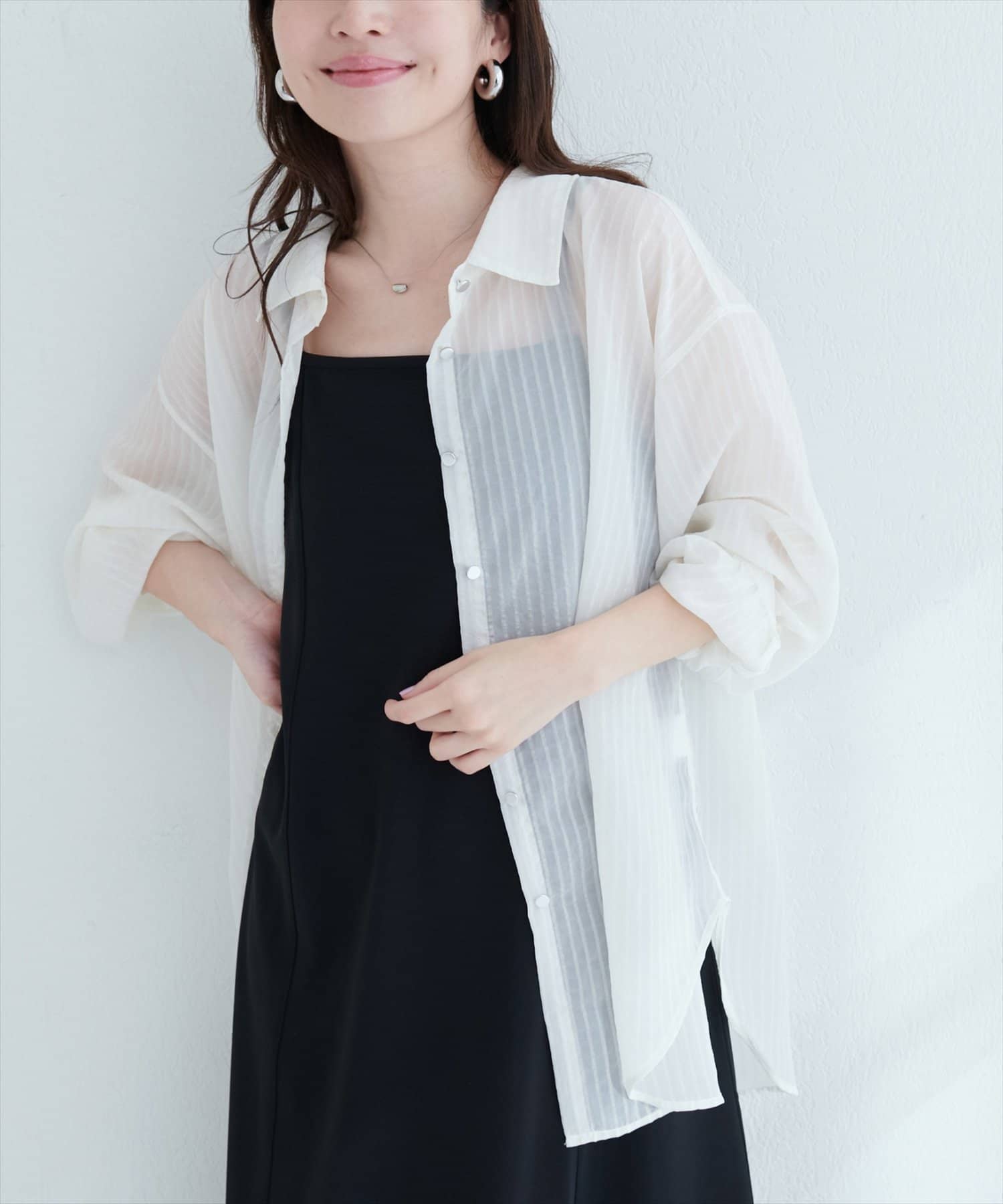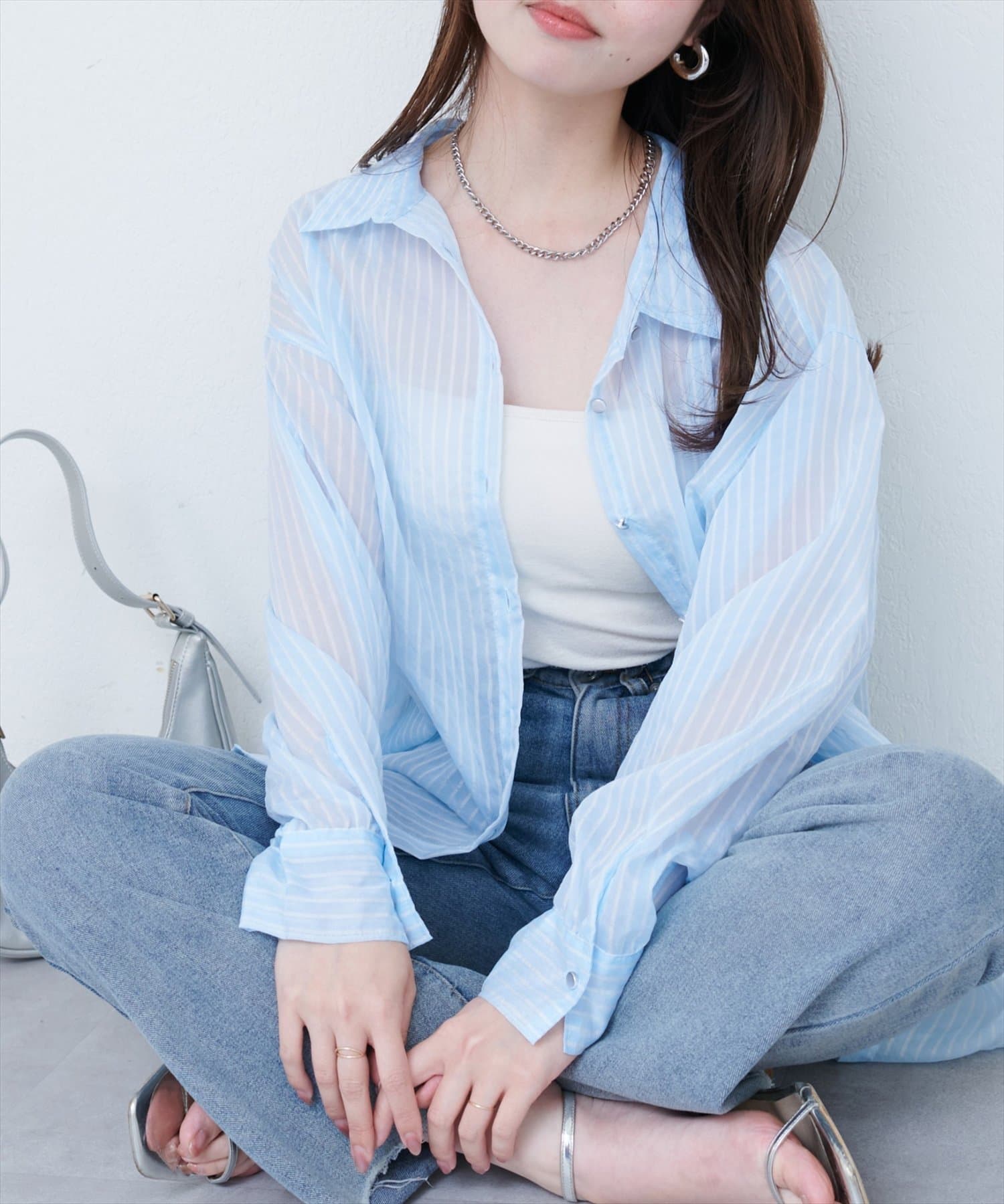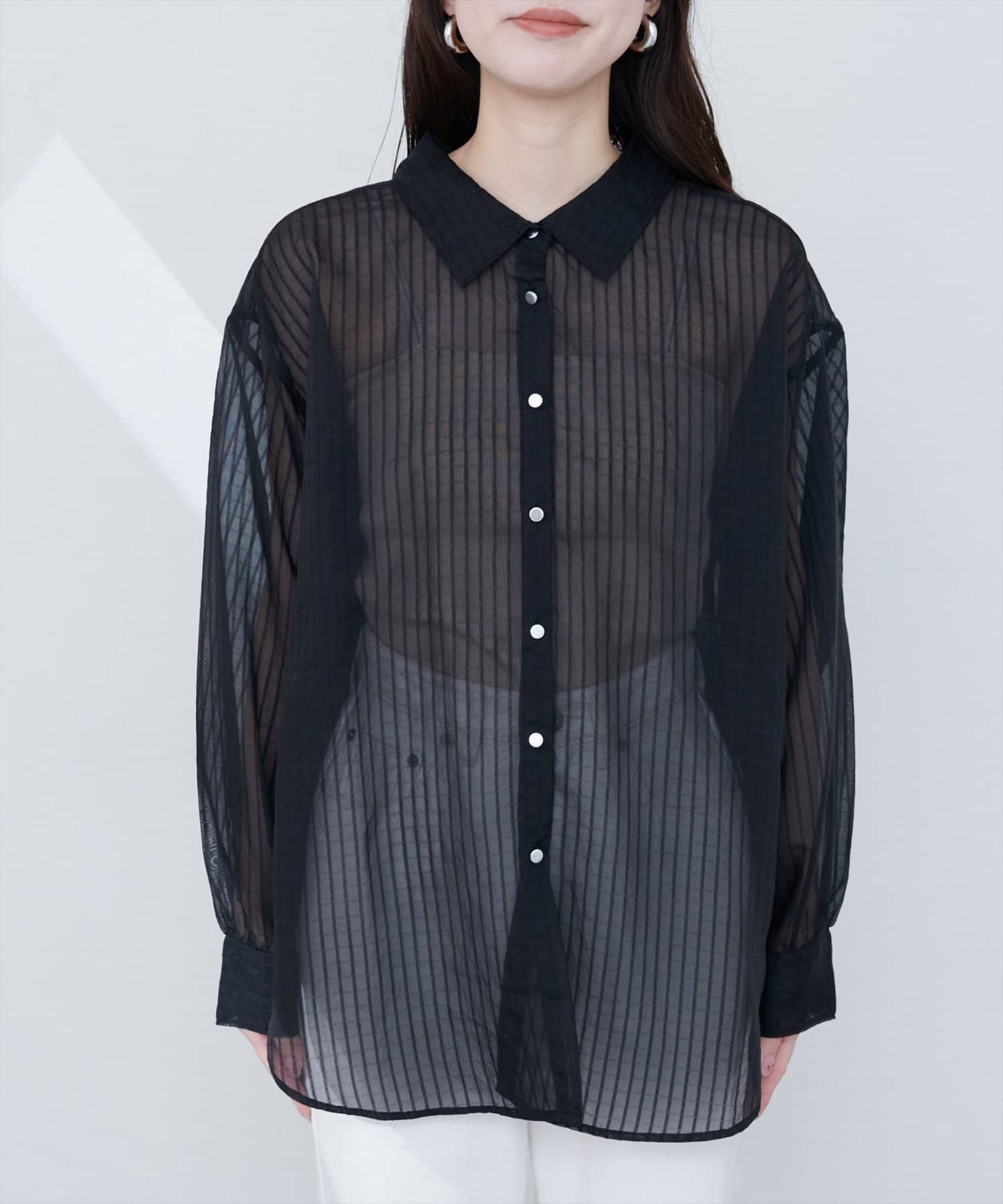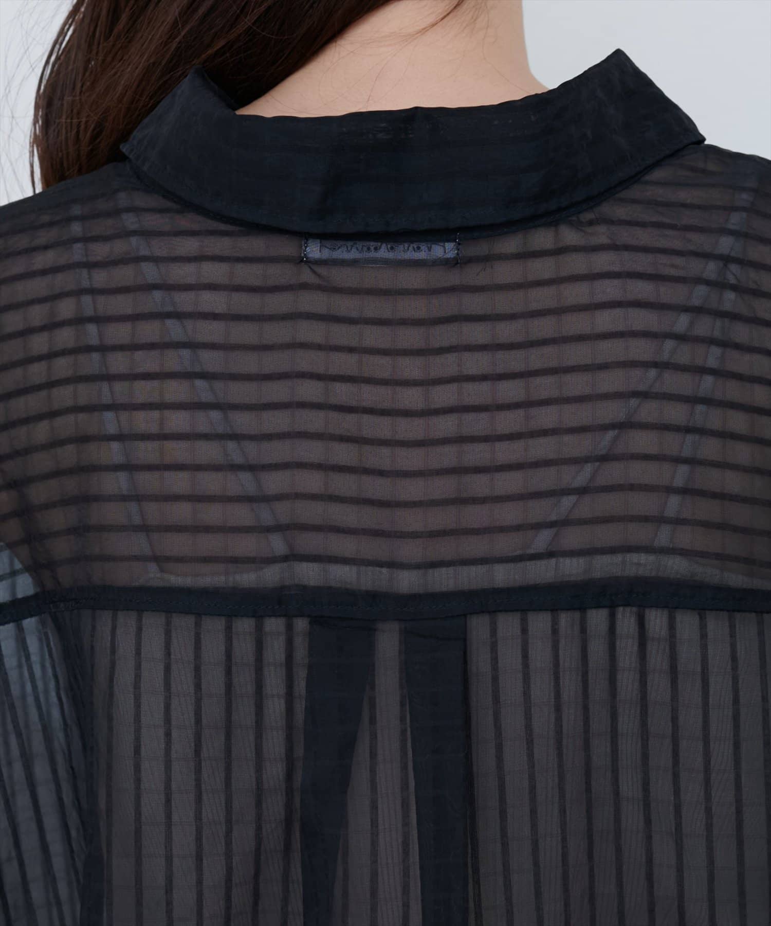 繊細なストライプが、上品な透け感を際立たせ、大人の女性らしい抜け感を演出するエアリーなシアーシャツ。