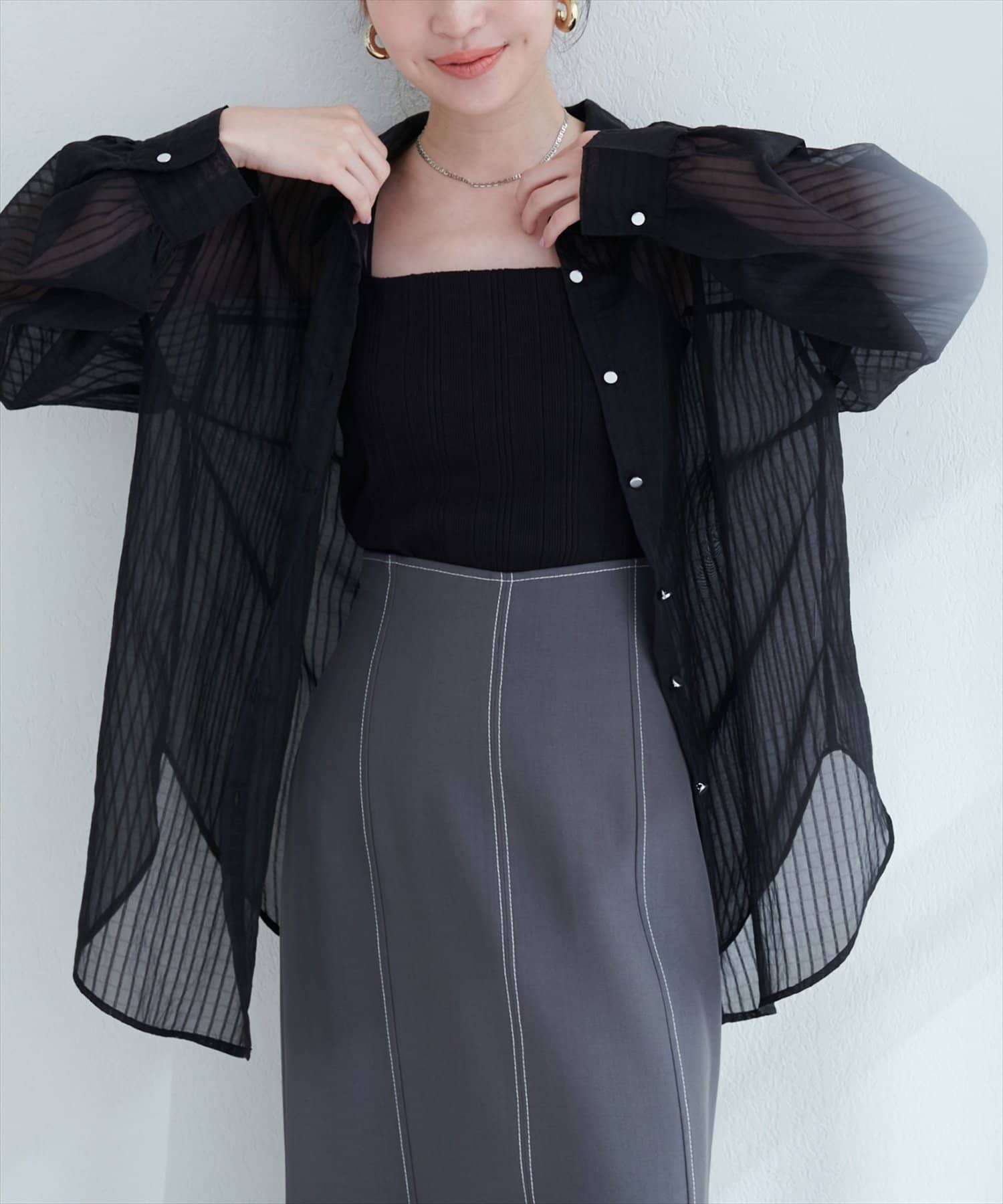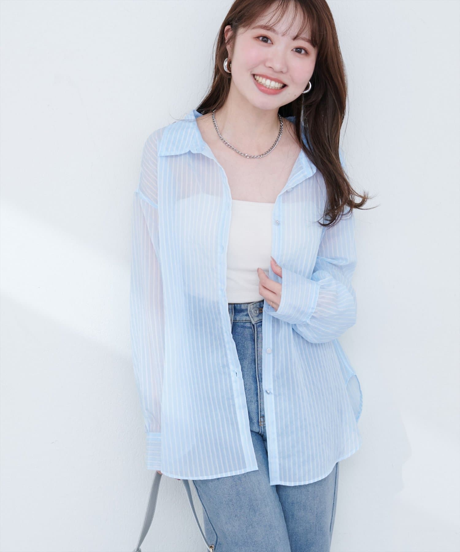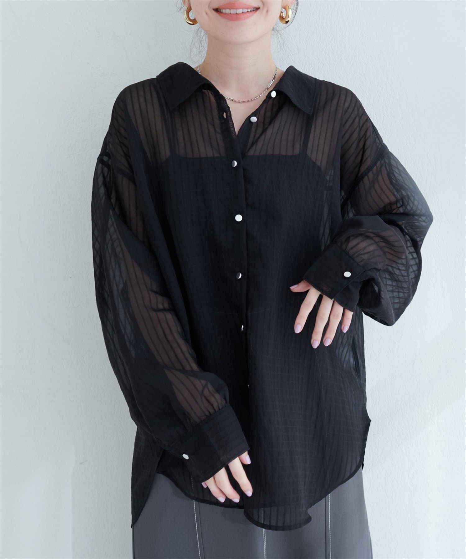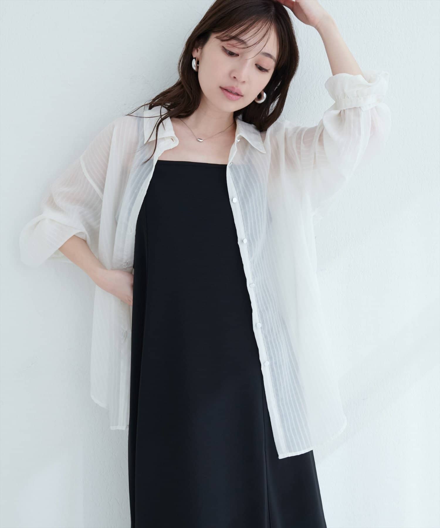 繊細なストライプが、上品な透け感を際立たせ、大人の女性らしい抜け感を演出するエアリーなシアーシャツ。