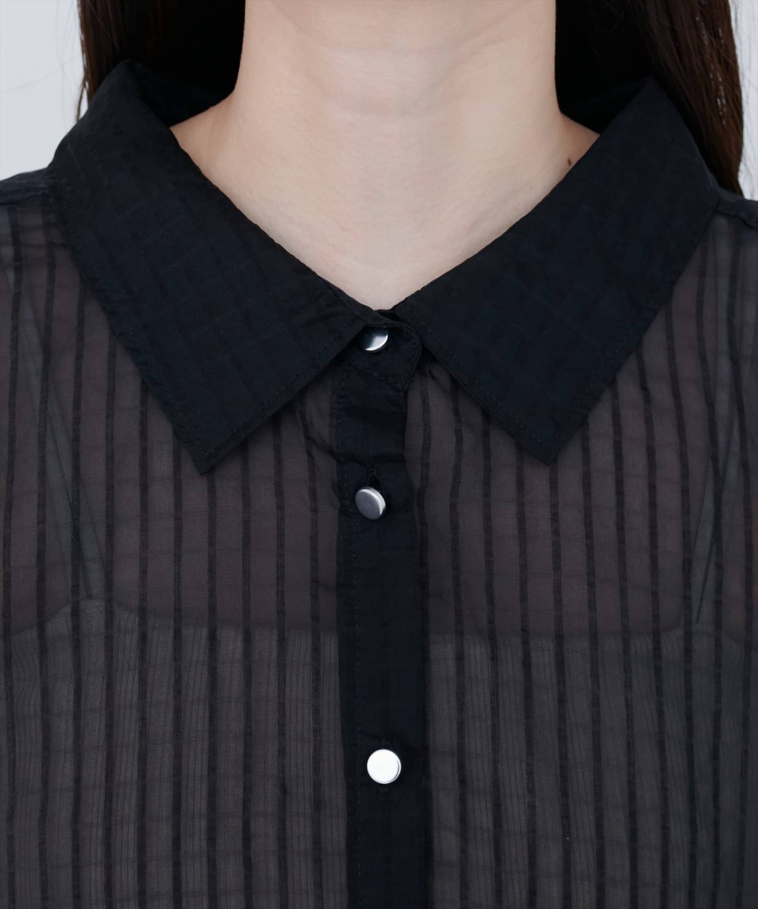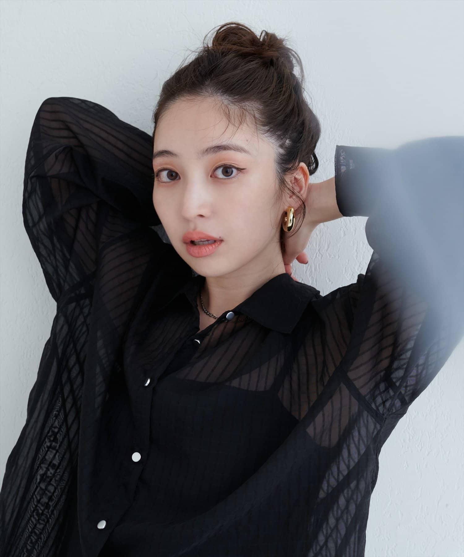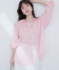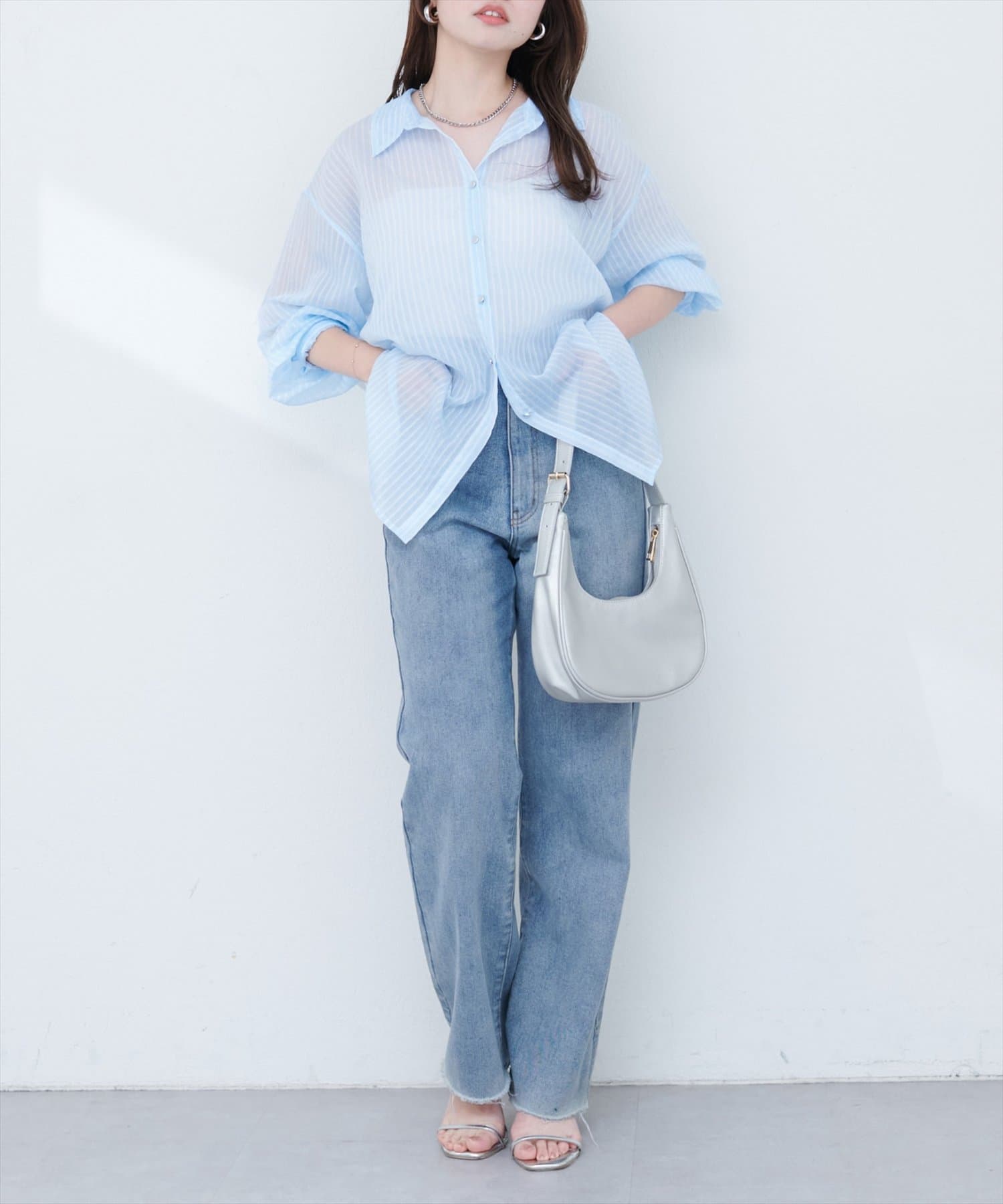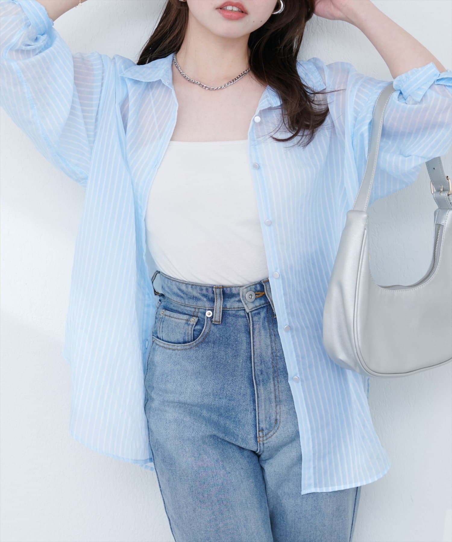 繊細なストライプが、上品な透け感を際立たせ、大人の女性らしい抜け感を演出するエアリーなシアーシャツ。