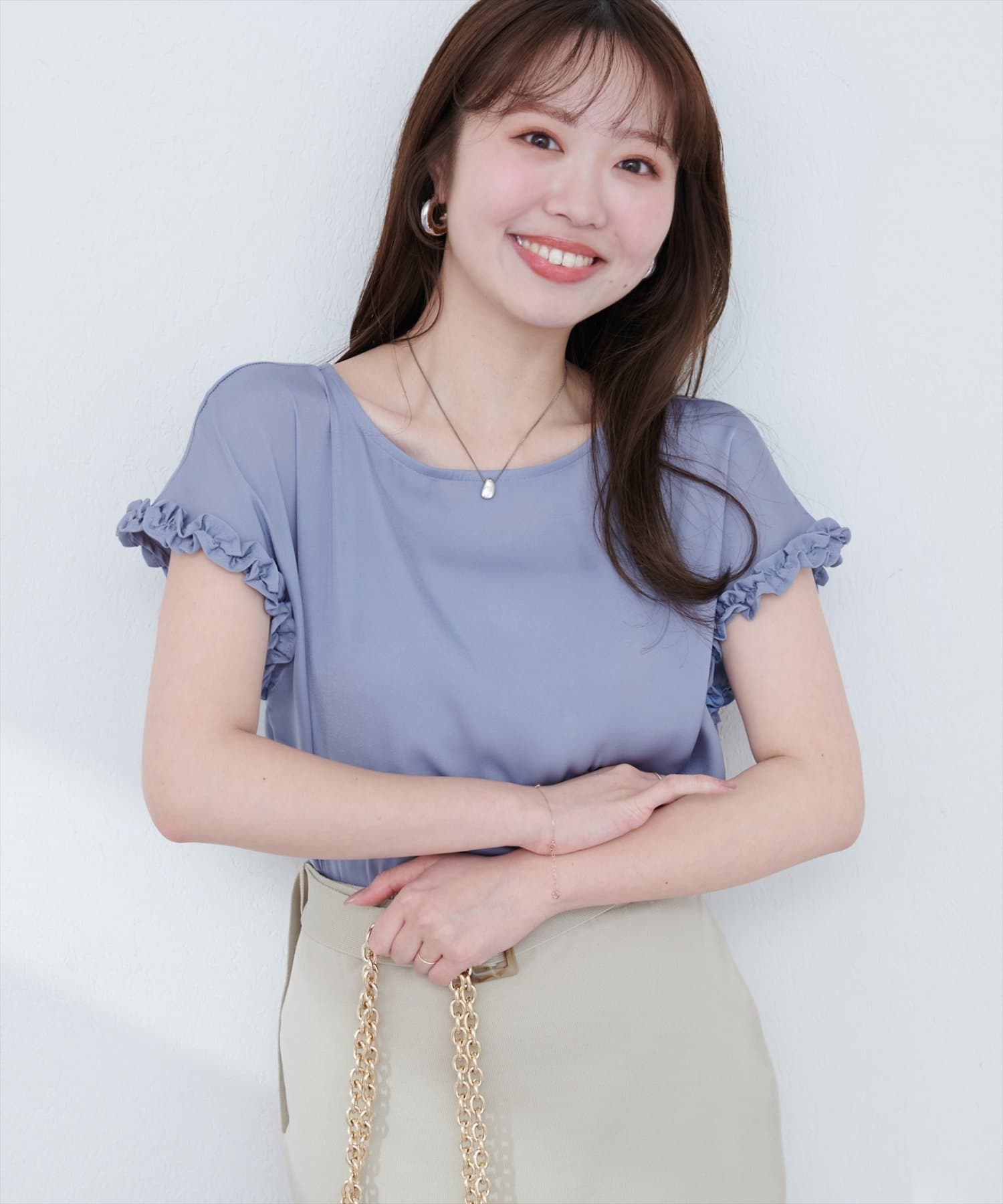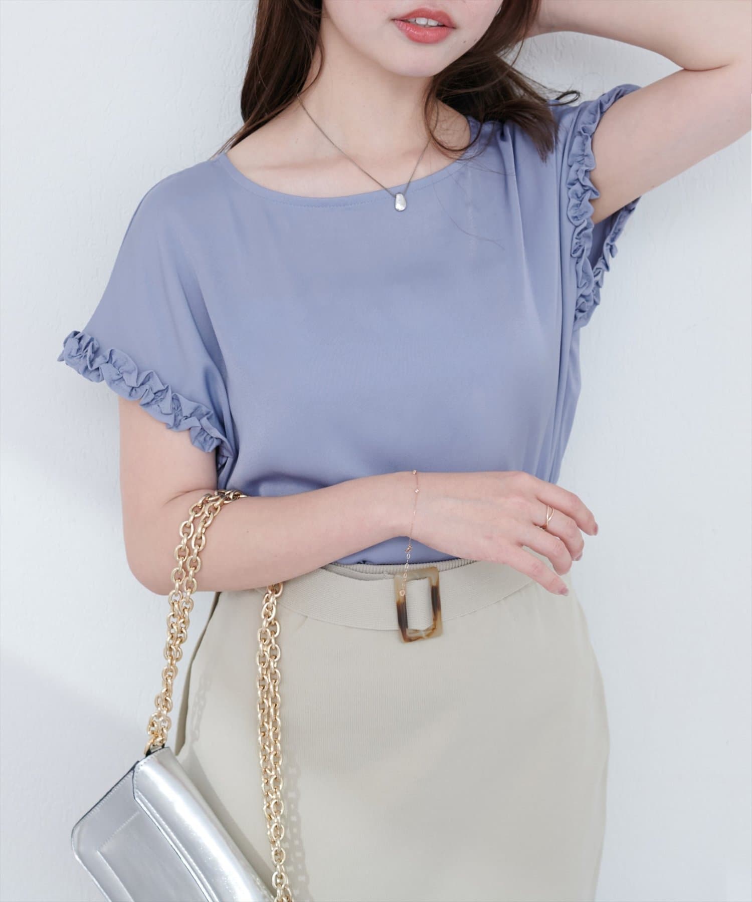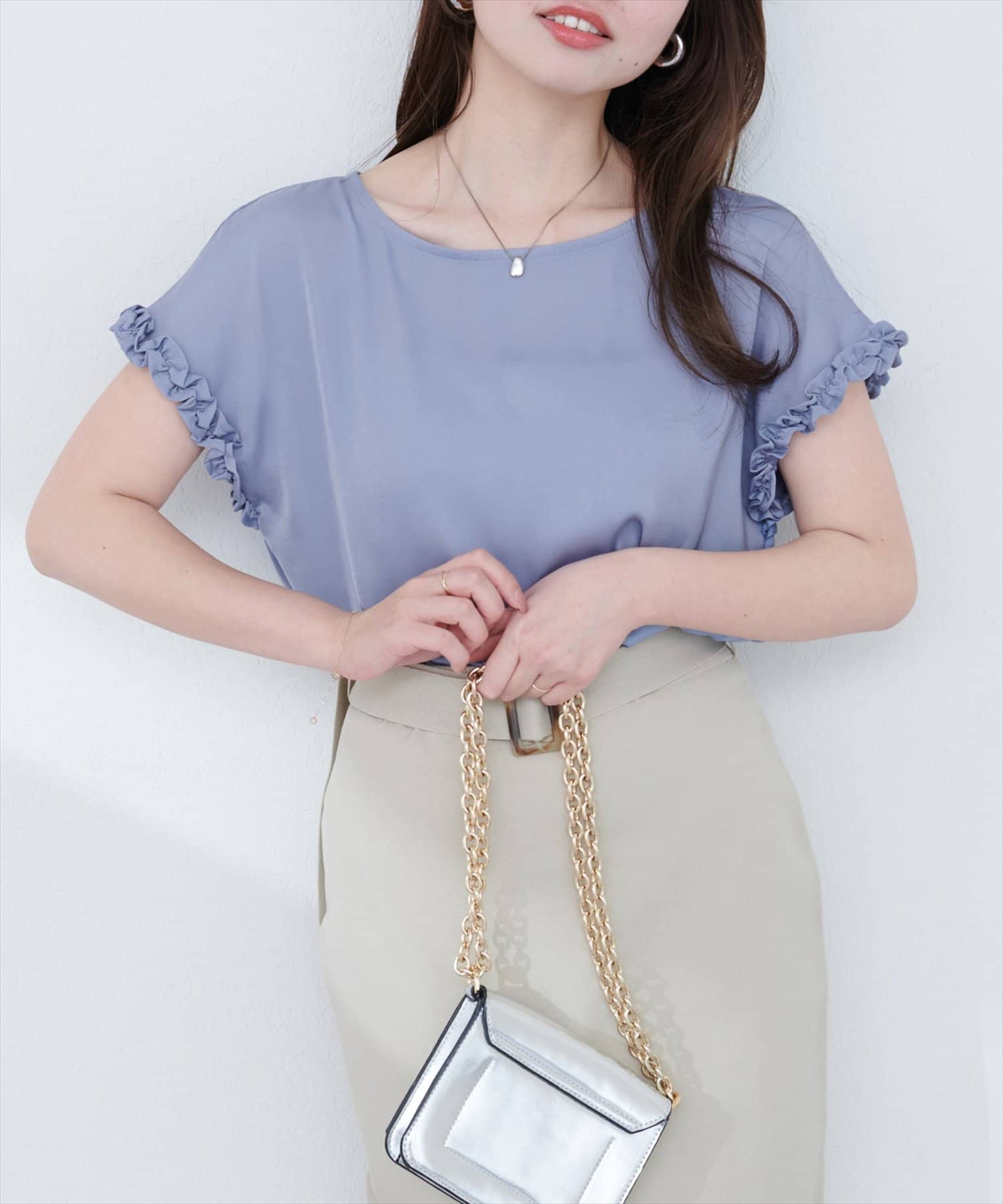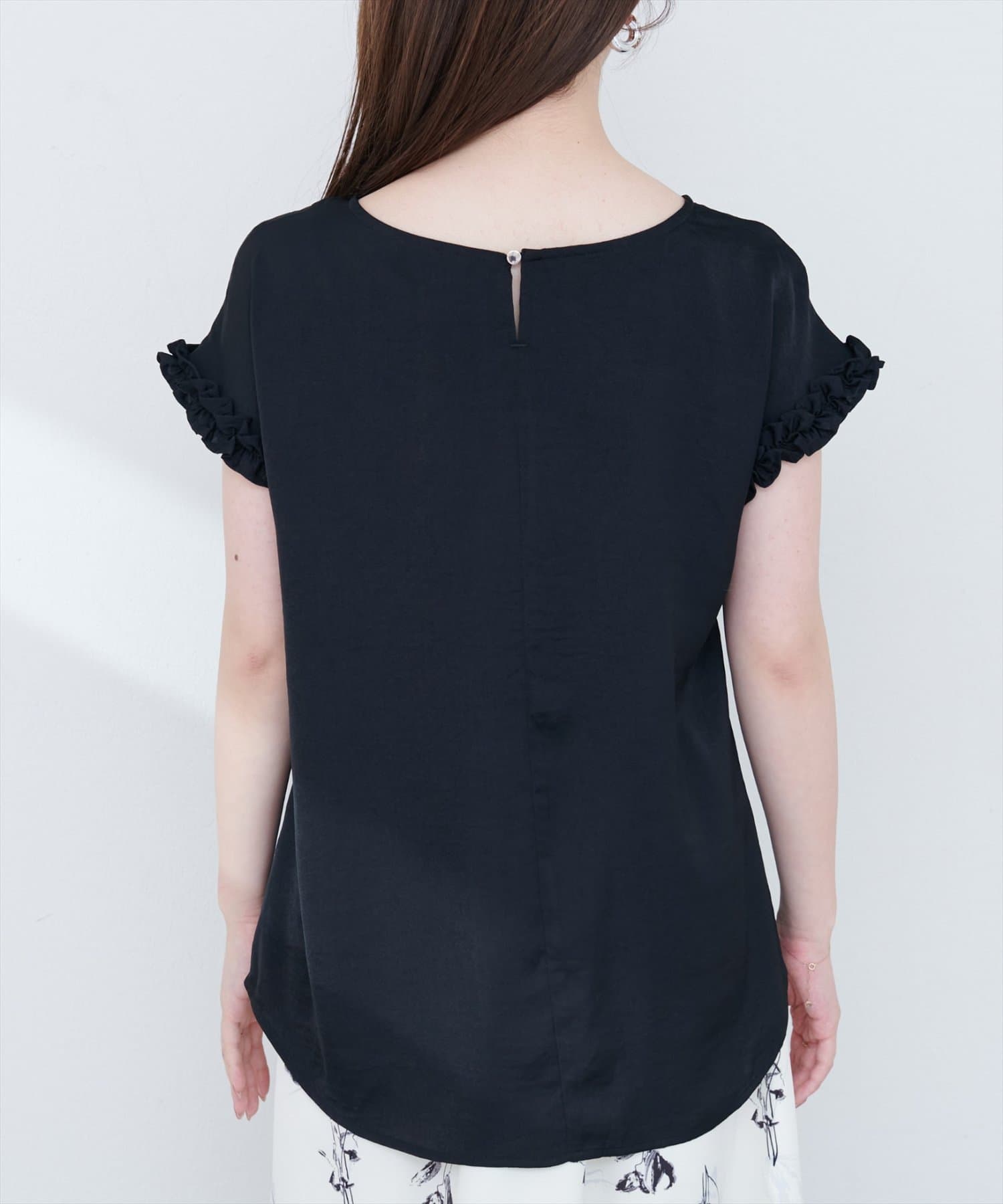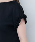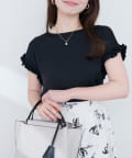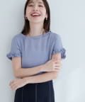 袖にあしらわれたフリルが、上品でフェミニンな雰囲気を演出。