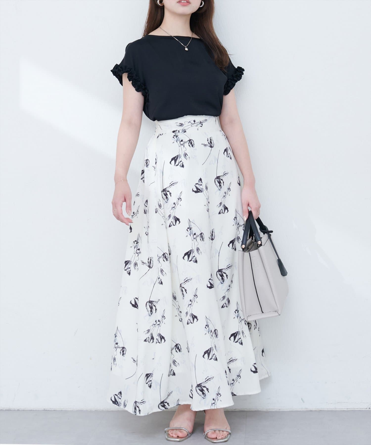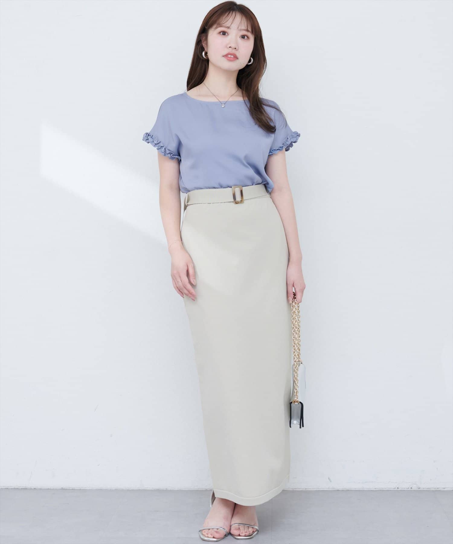 マーメイドシルエットやフレアラインのスカートにウエストインして頂くと、女性らしさが引き立つ上品スタイルに◎
