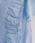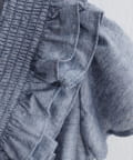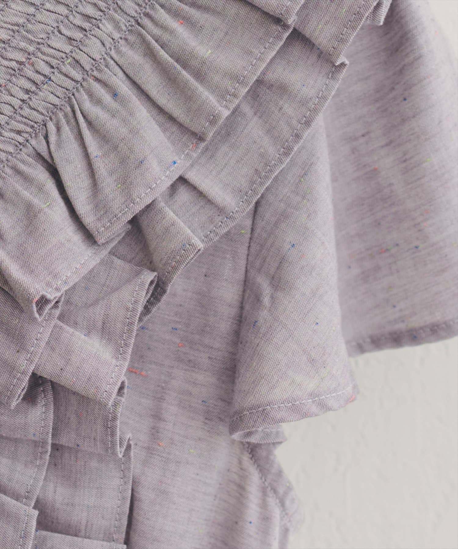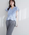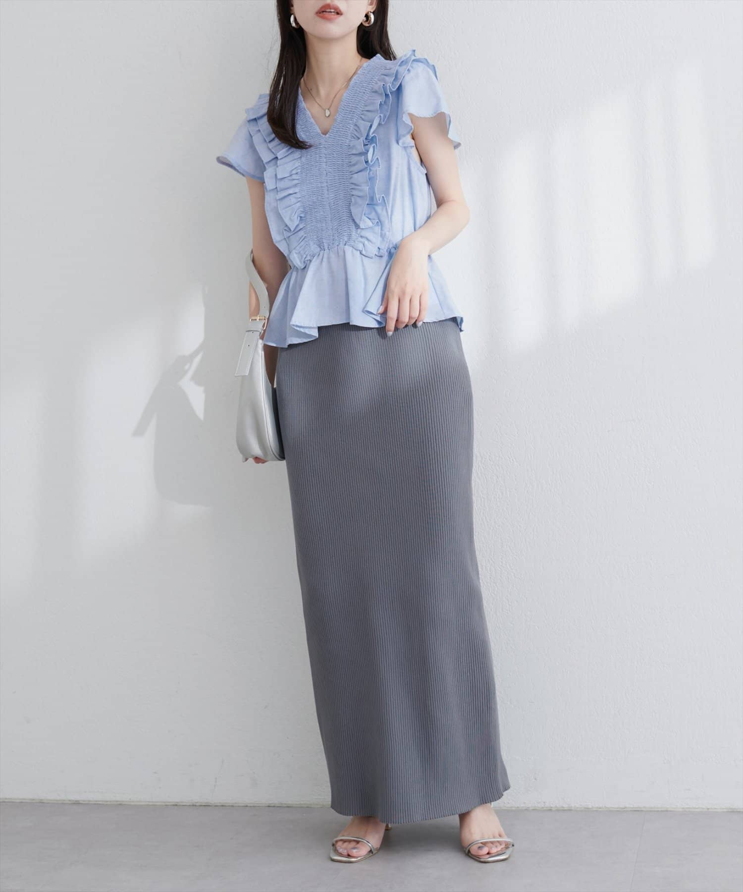 胸元のシャーリングと、裾に向かって広がるペプラムシルエットが、ウエストを細く見せ、スタイルアップ効果◎