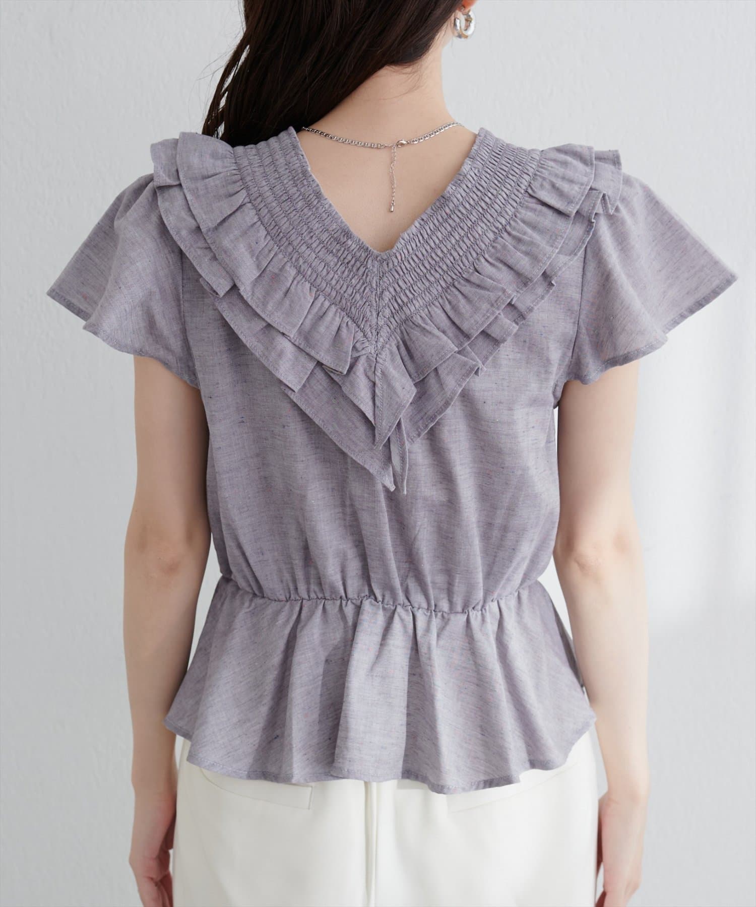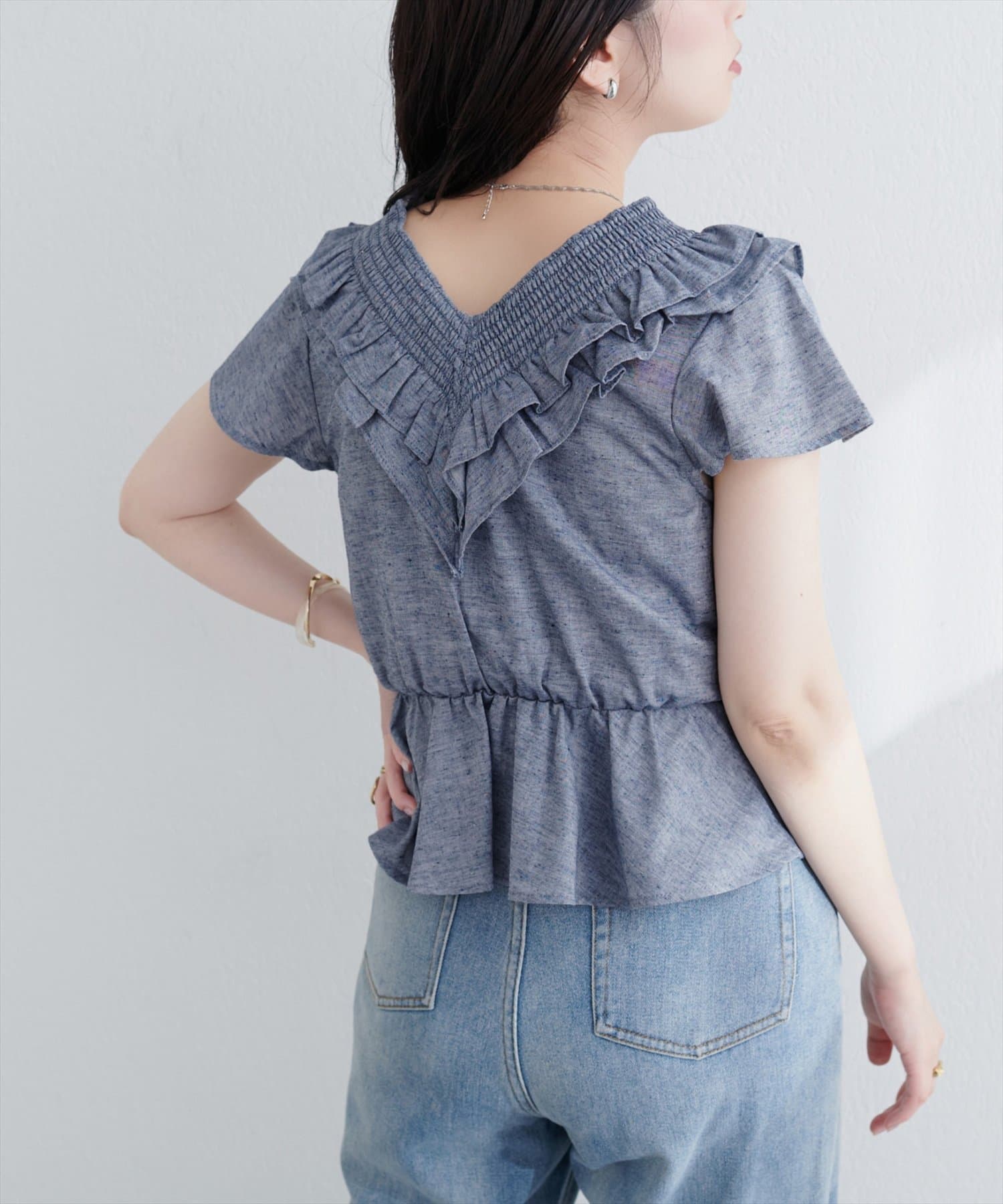 Vネックで顔回りをすっきりみせ、胸元のシャーリングとペプラムデザインが、女性らしいシルエットを演出します。