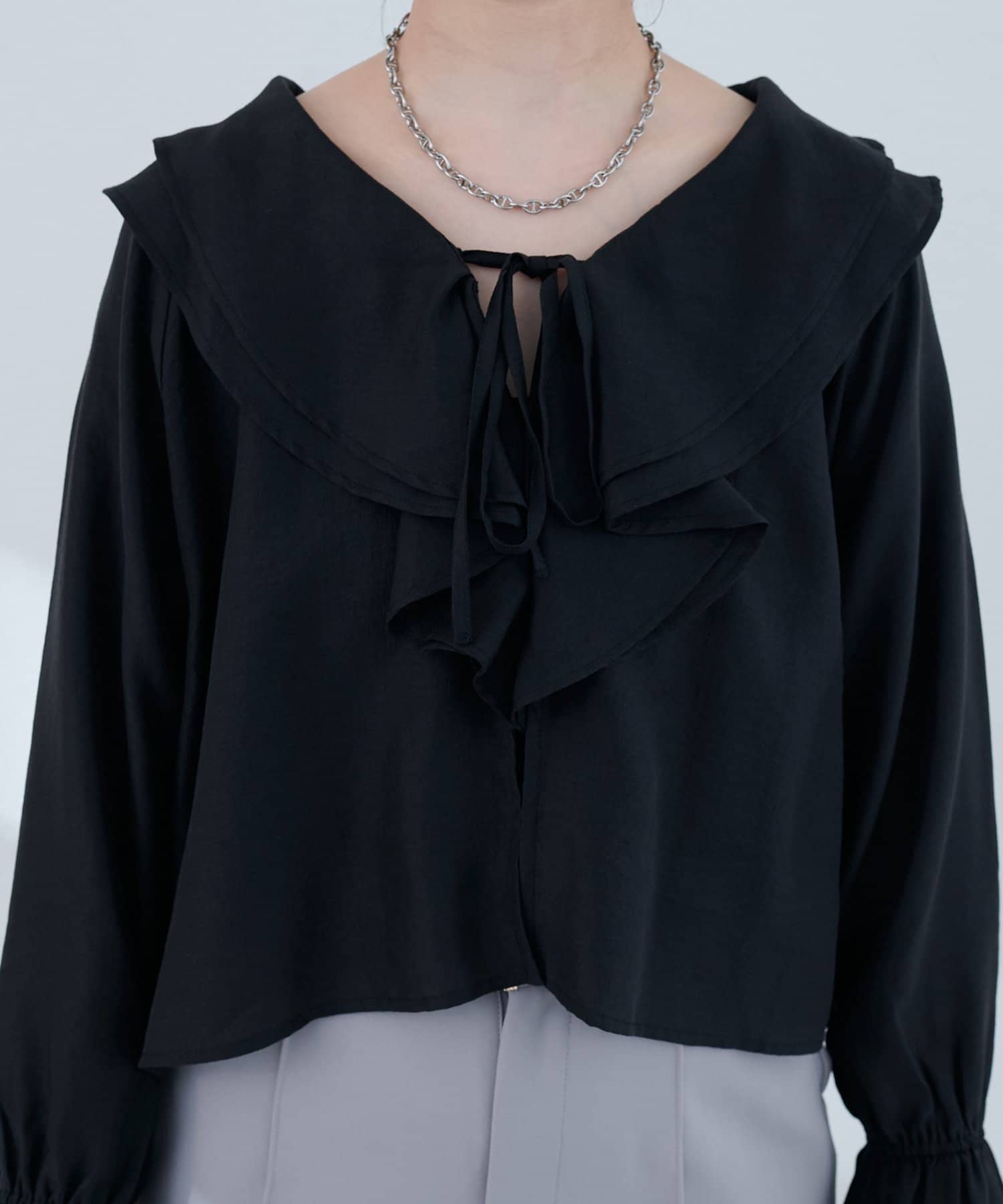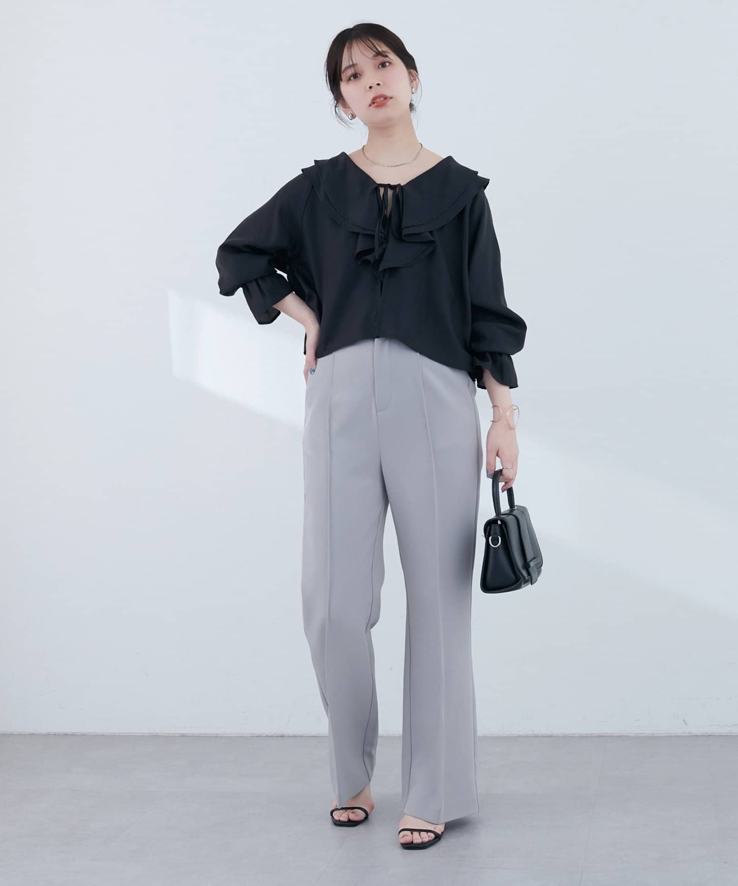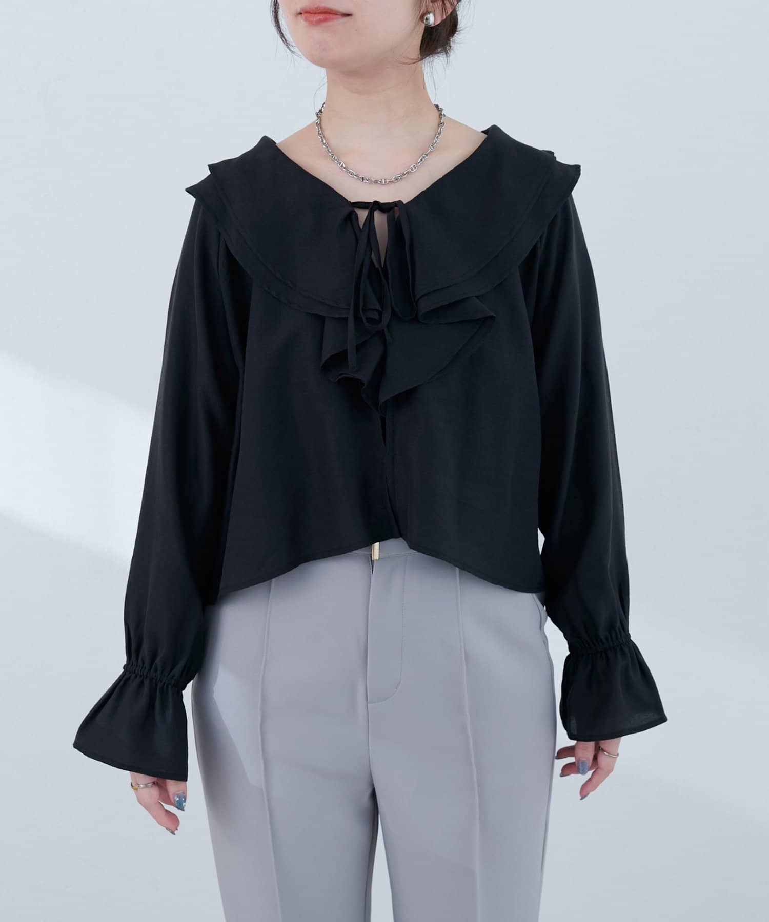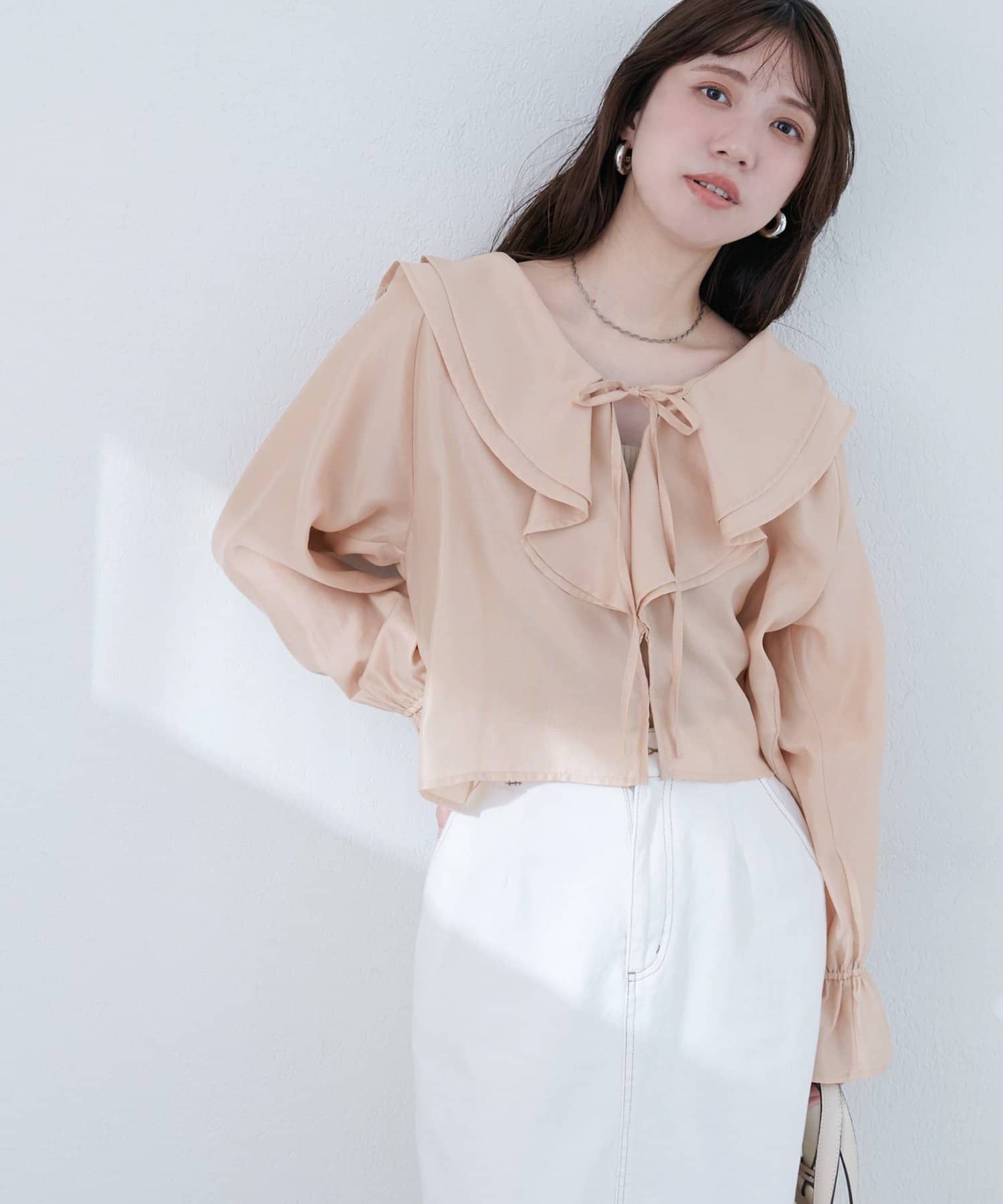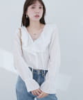 首元から胸元にかけてあしらわれたフリルが、顔周りを明るく見せ、女性らしさを引き立てます。