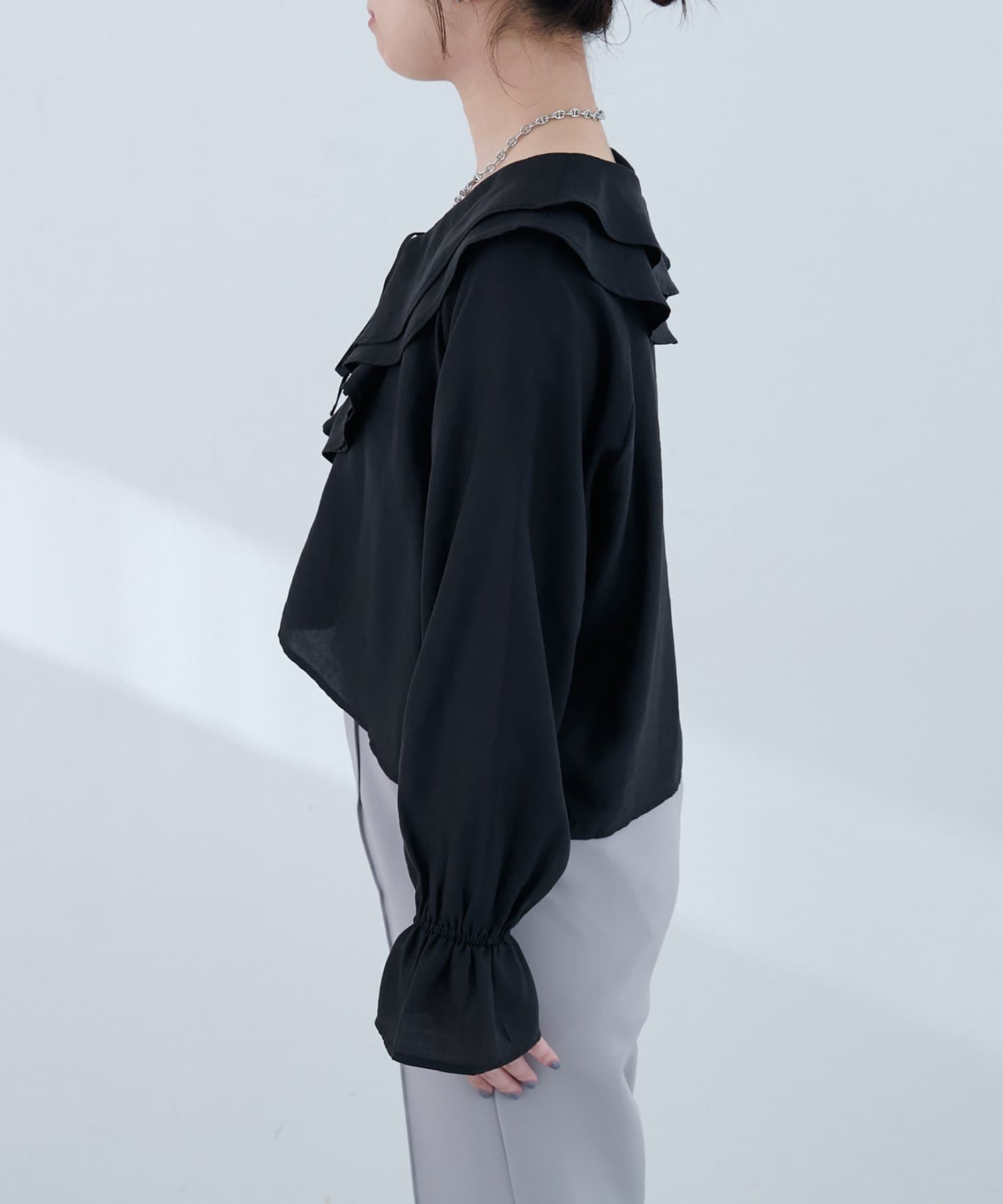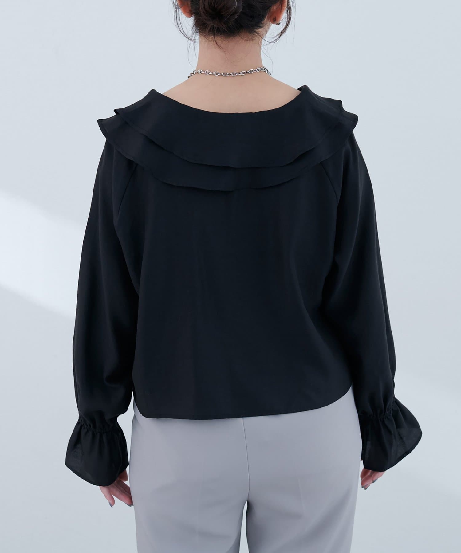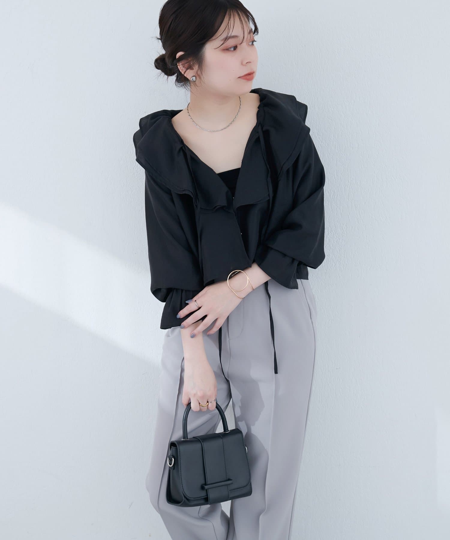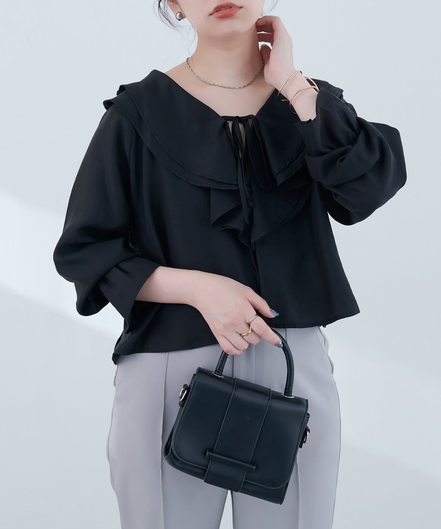 首元から胸元にかけてあしらわれたフリルが、顔周りを明るく見せ、女性らしさを引き立てます。