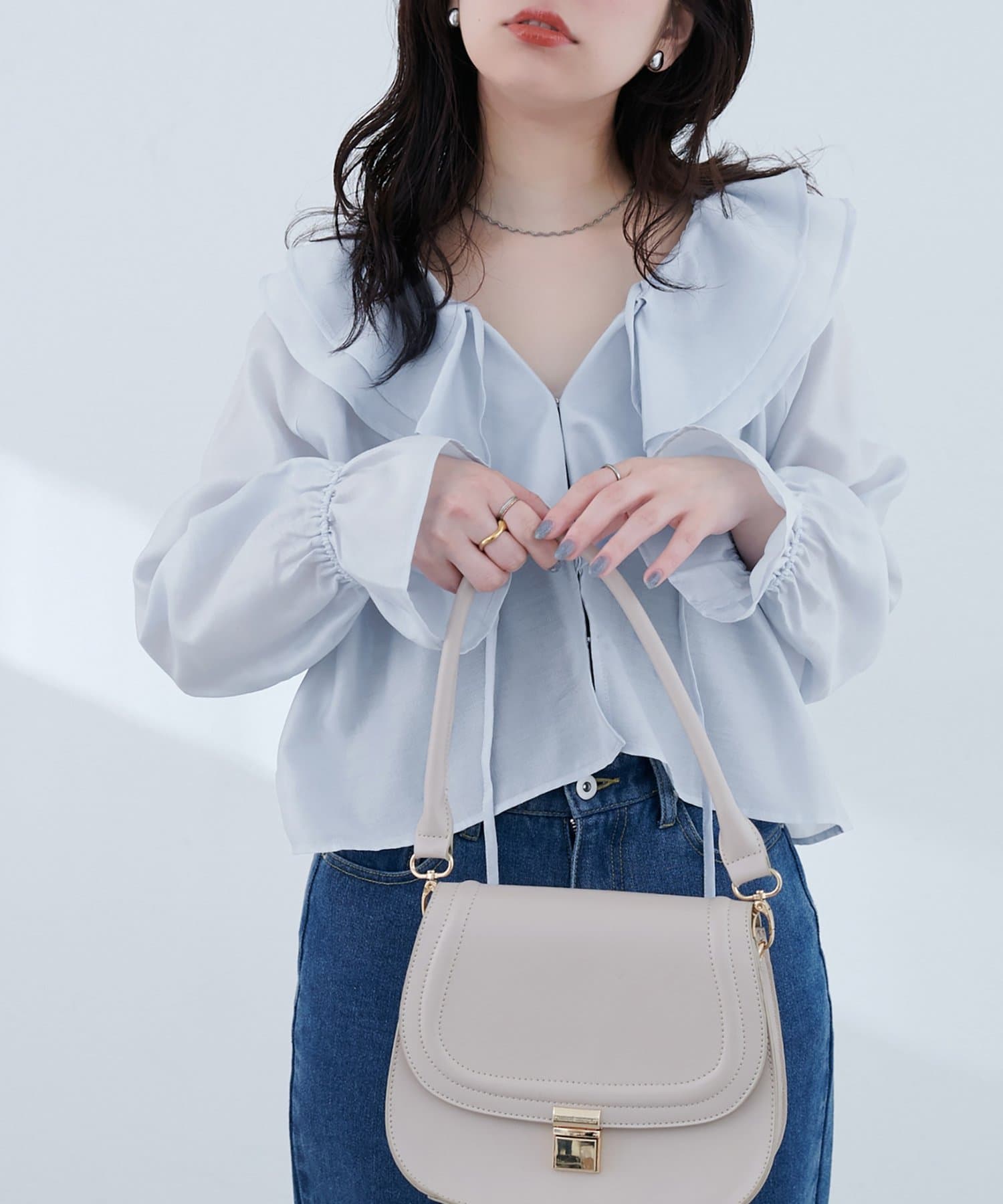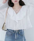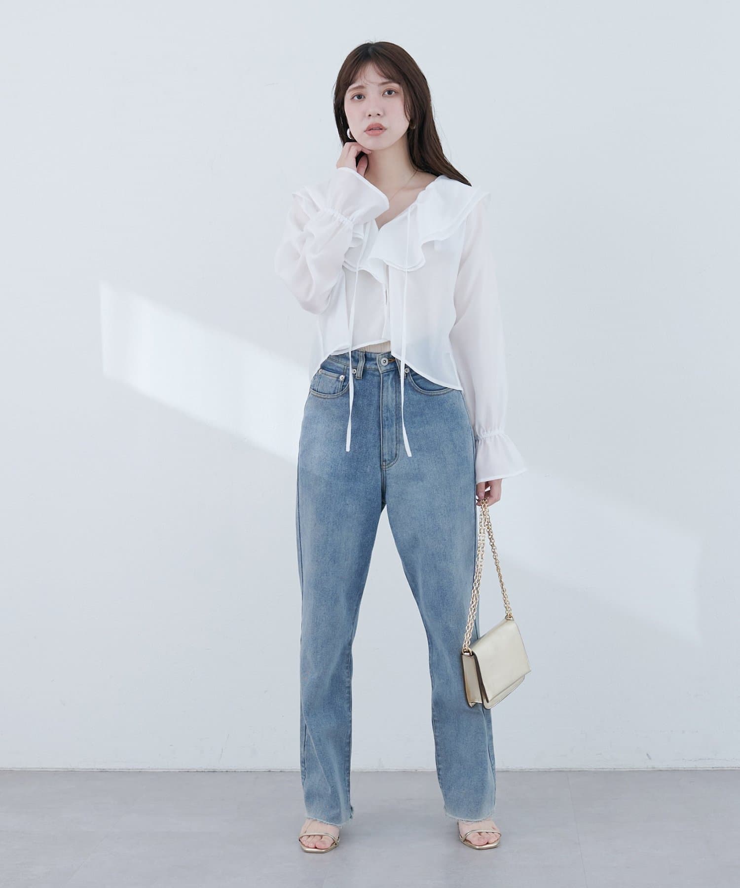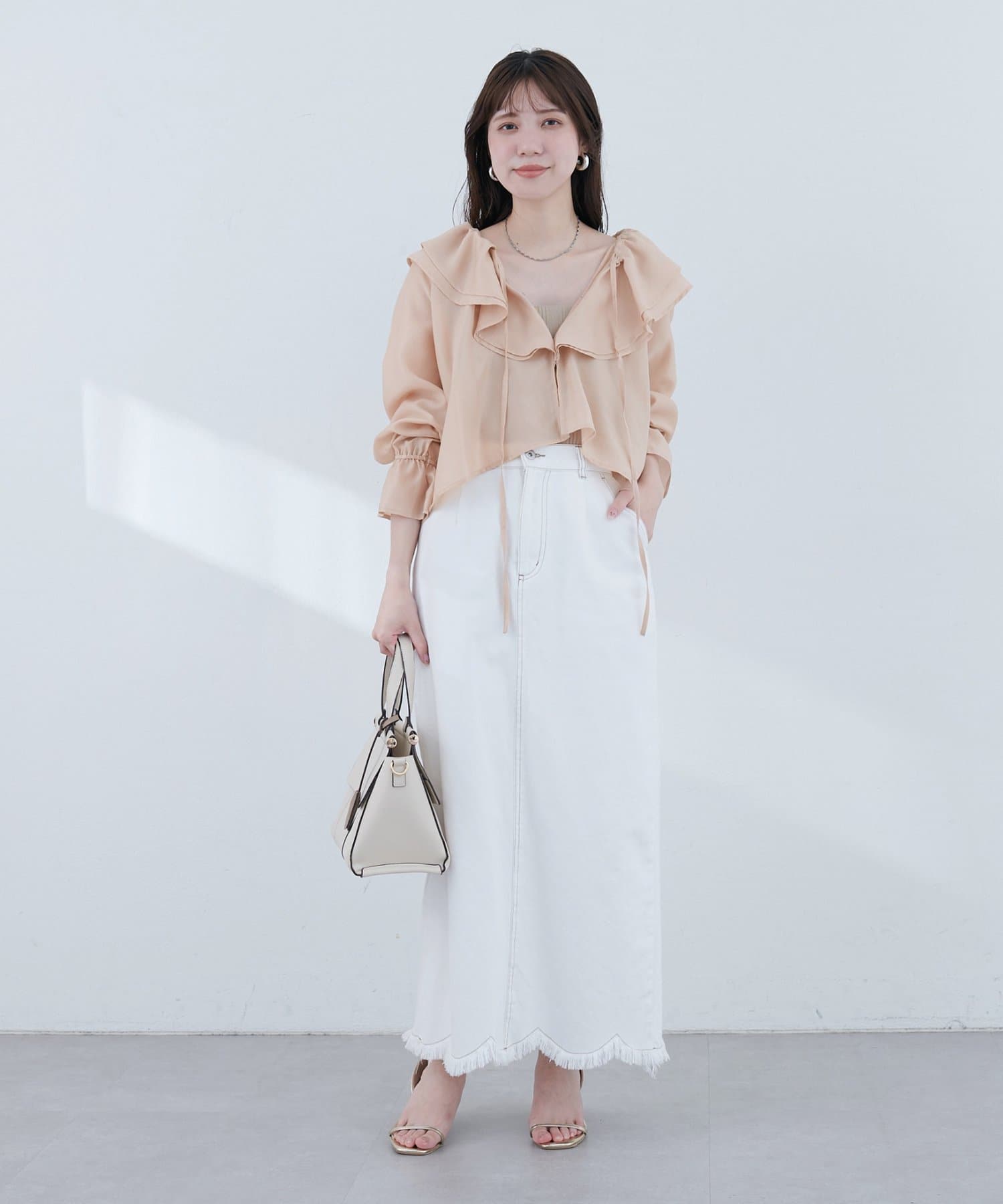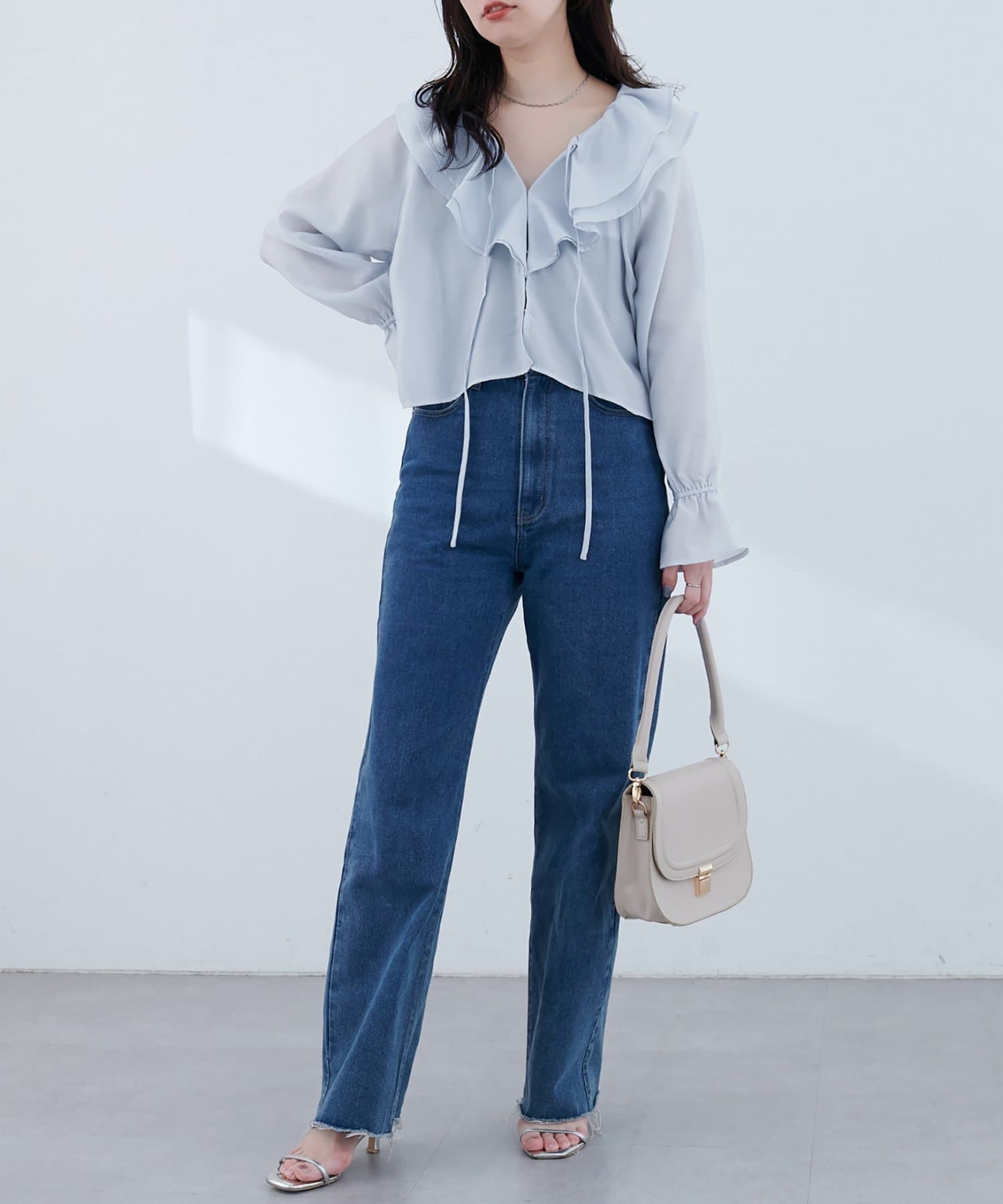 首元から胸元にかけてあしらわれたフリルが、顔周りを明るく見せ、女性らしさを引き立てます。