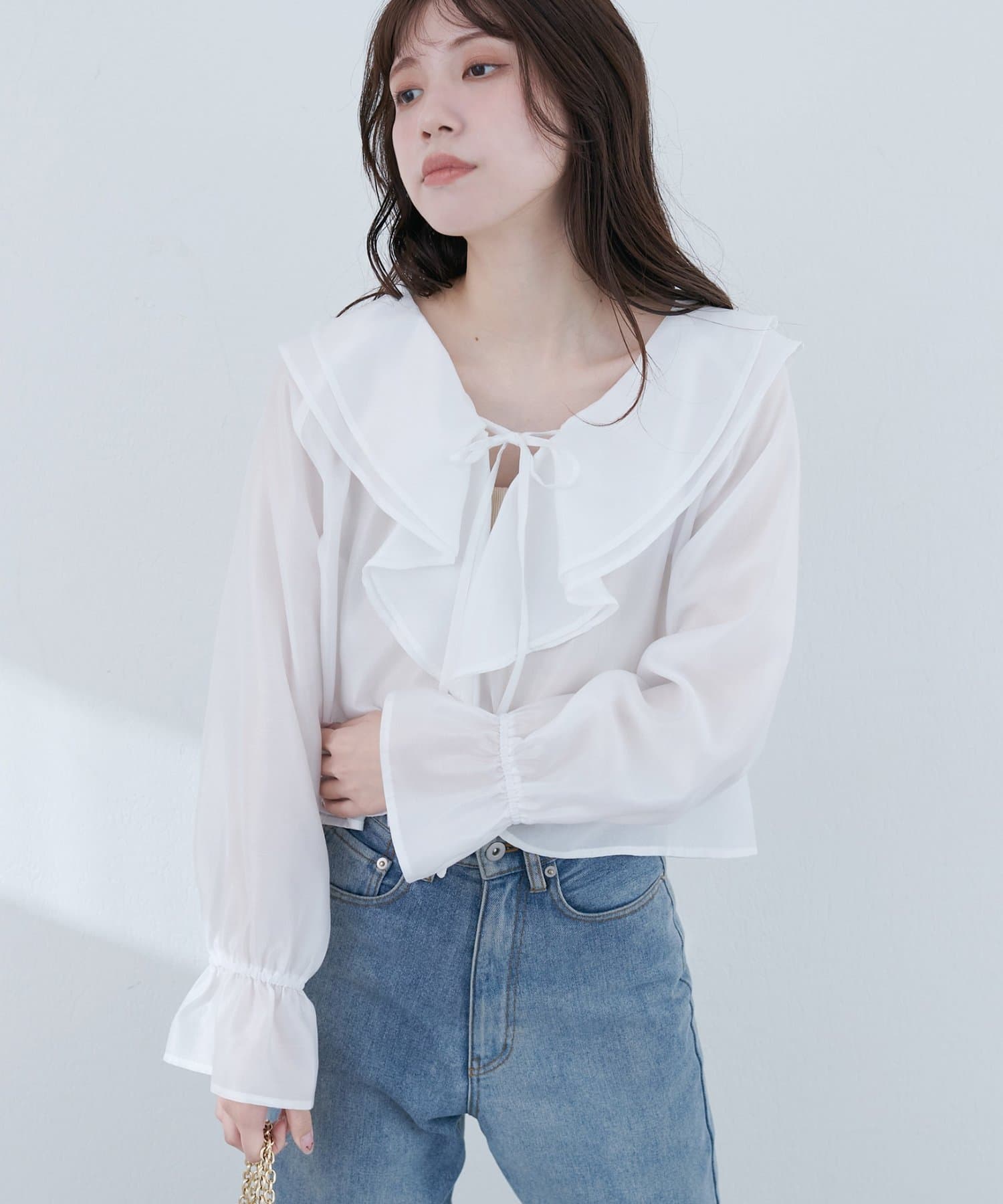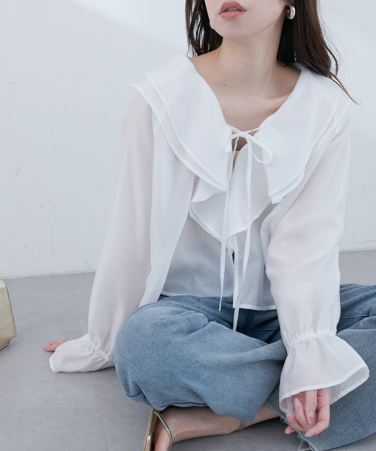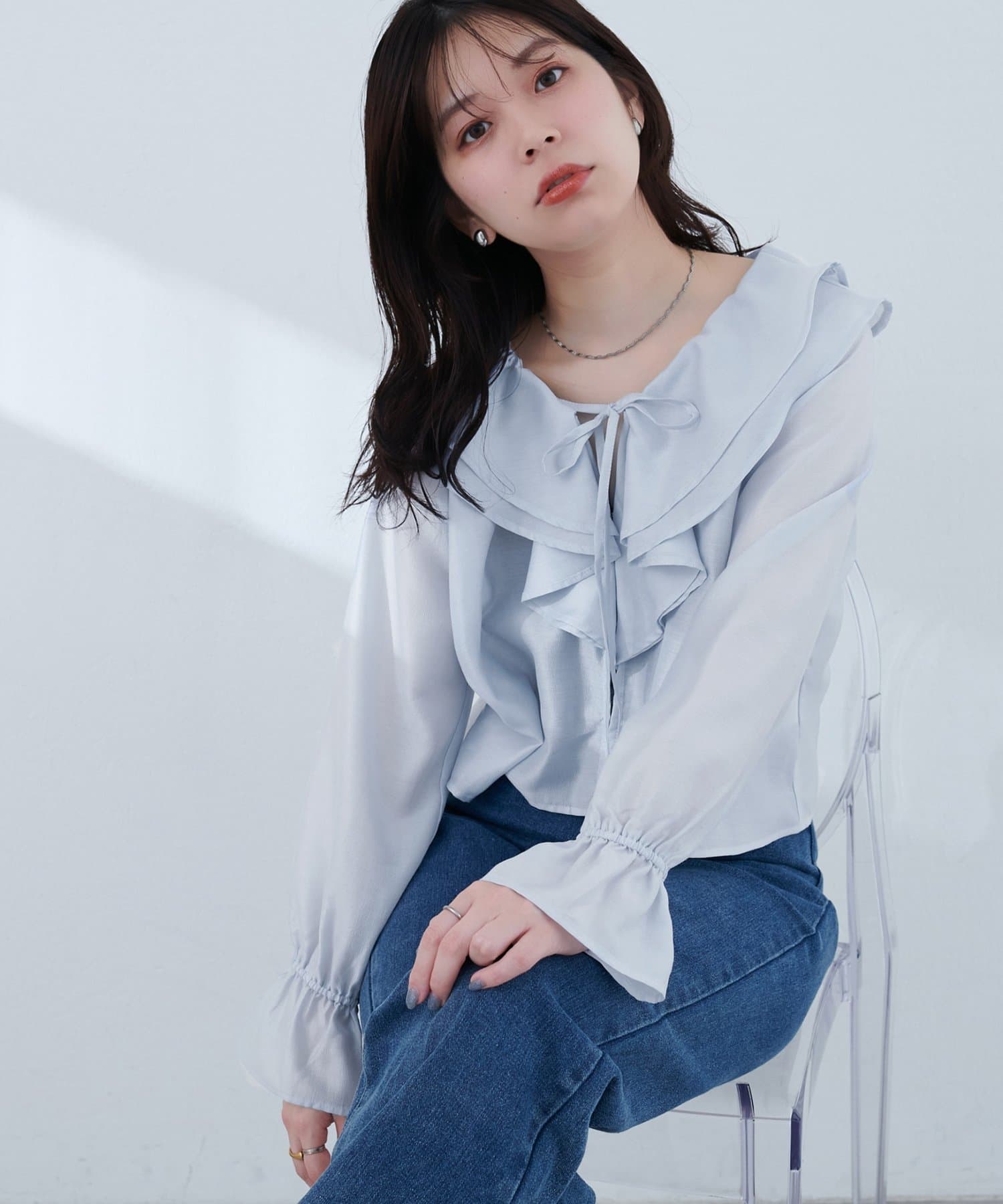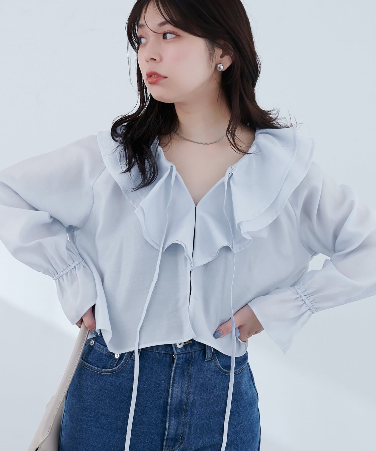 ふんわり軽やかなシアー素材が、涼しげで女性らしい印象を演出するブラウス。