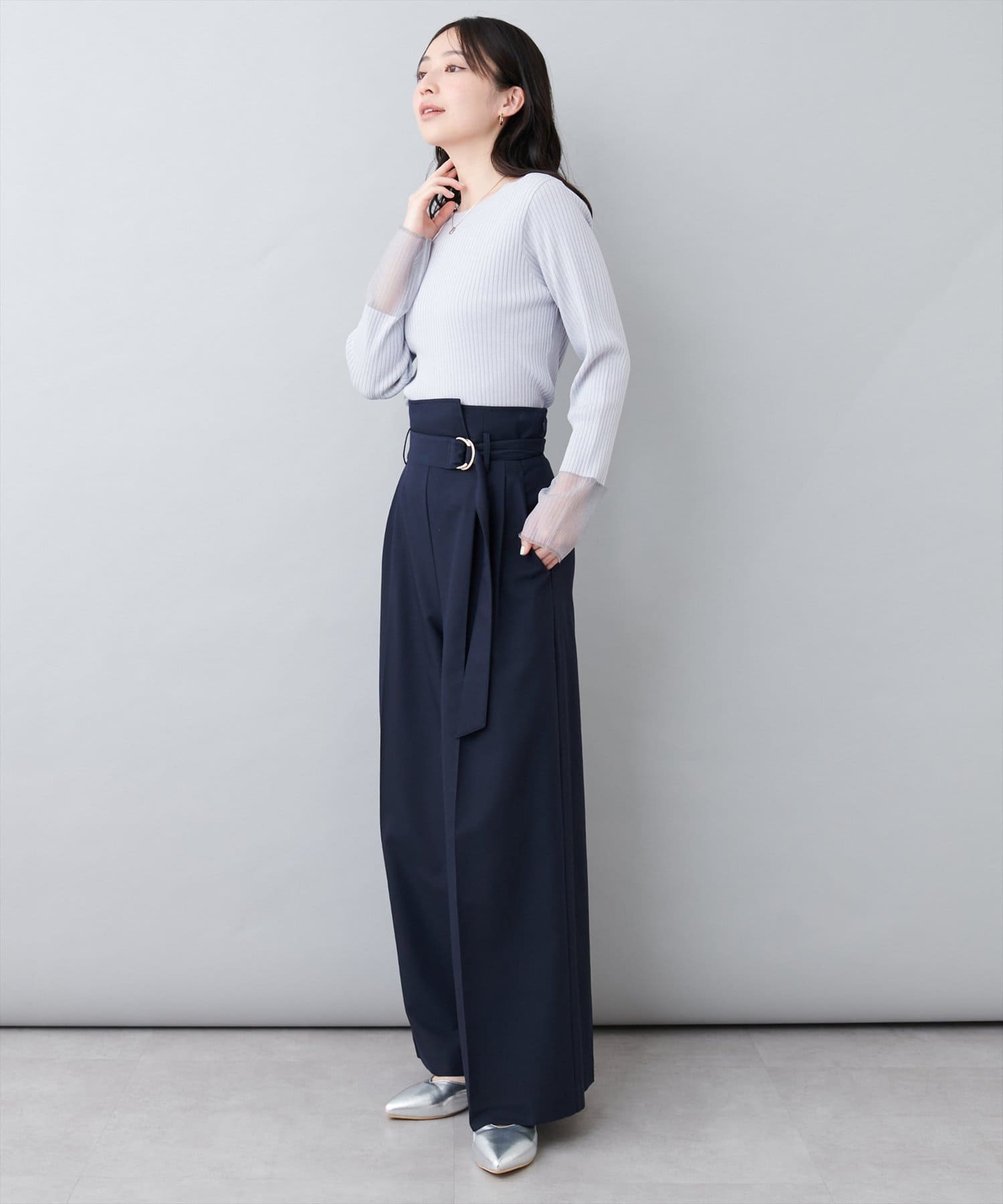 スリットスカートや、ハイウエストのボトムスにウエストアウトですっきり合わせて頂くと、