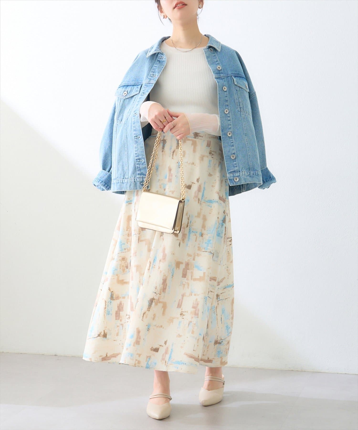 スリットスカートや、ハイウエストのボトムスにウエストアウトですっきり合わせて頂くと、