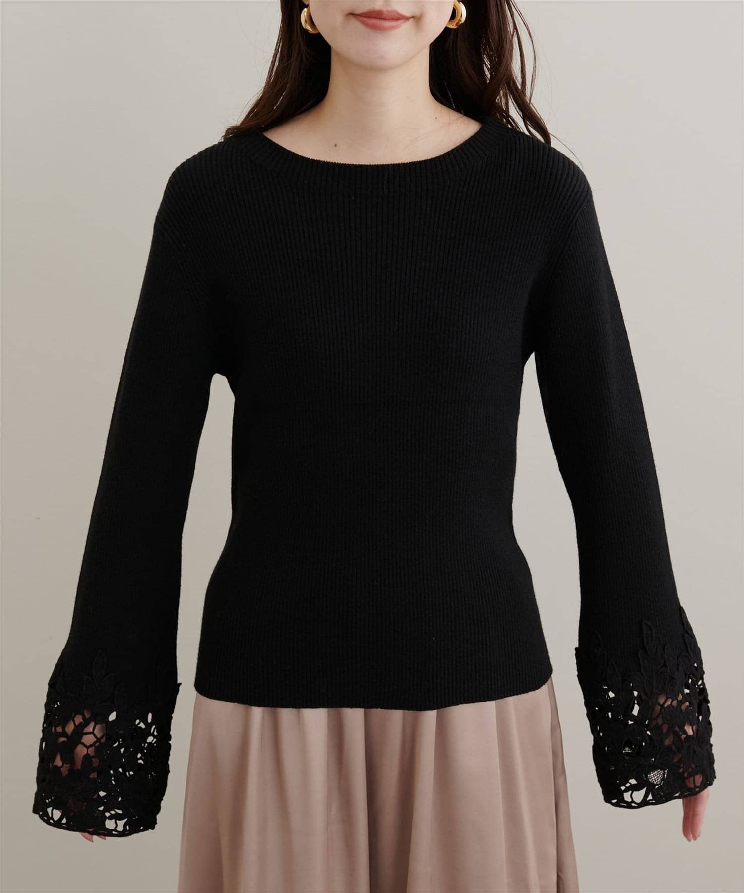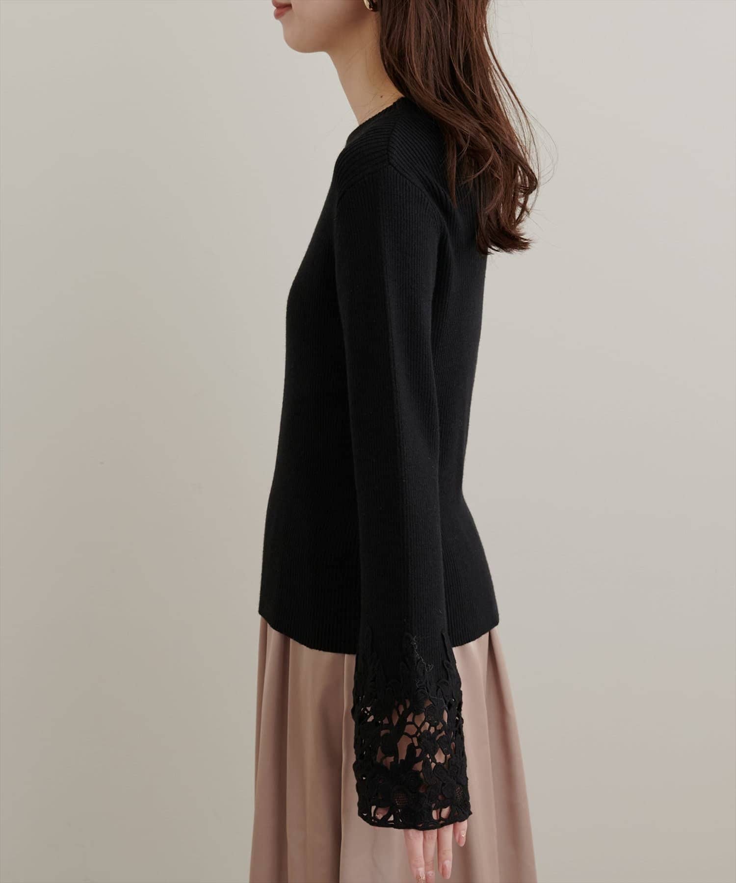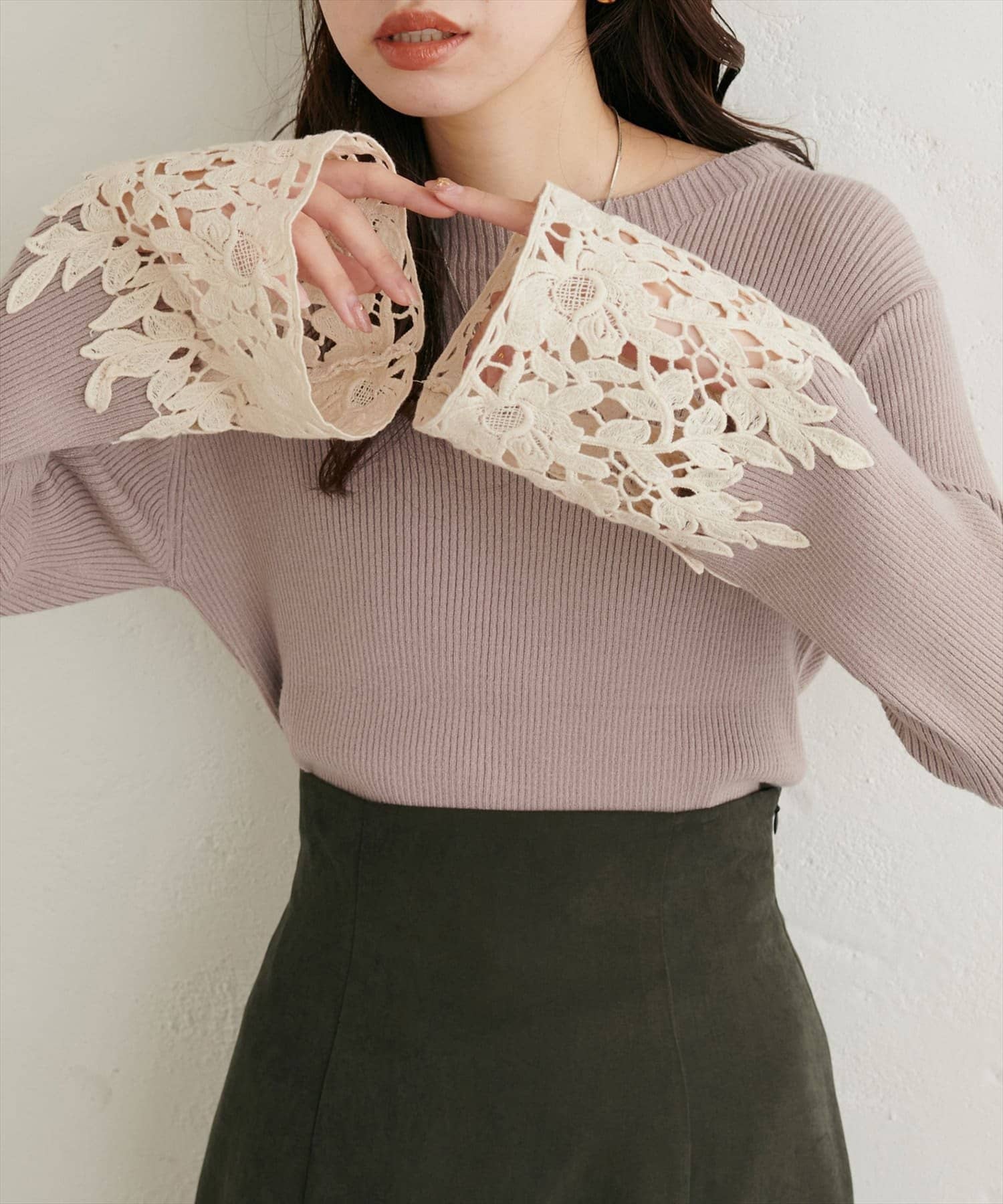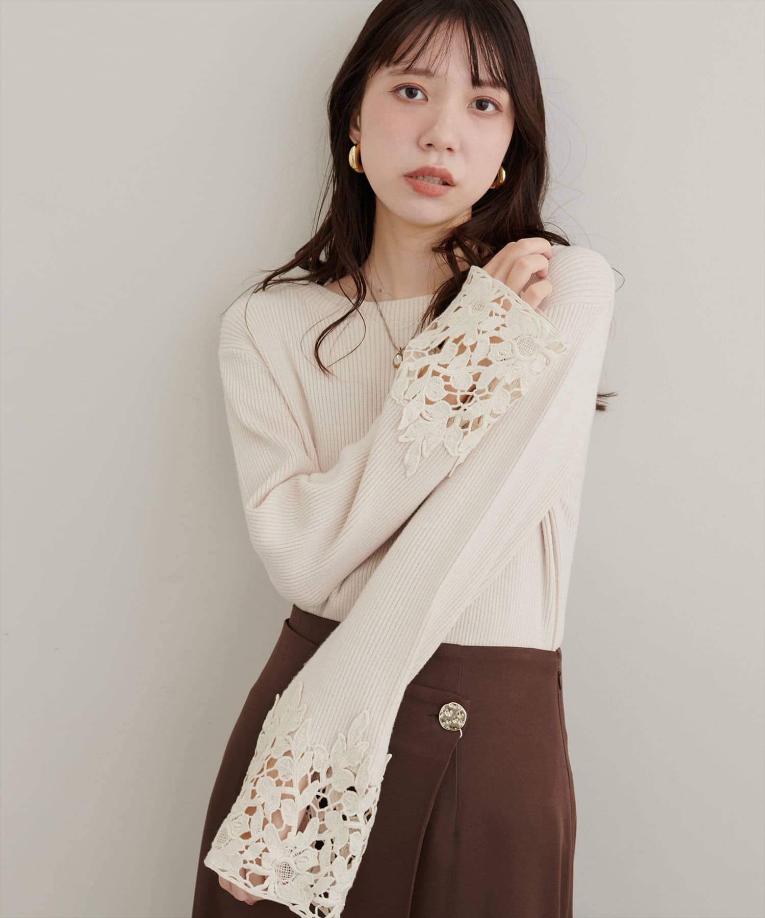 シンプルなリブニットに袖口の刺繍レースが華やかなニット。