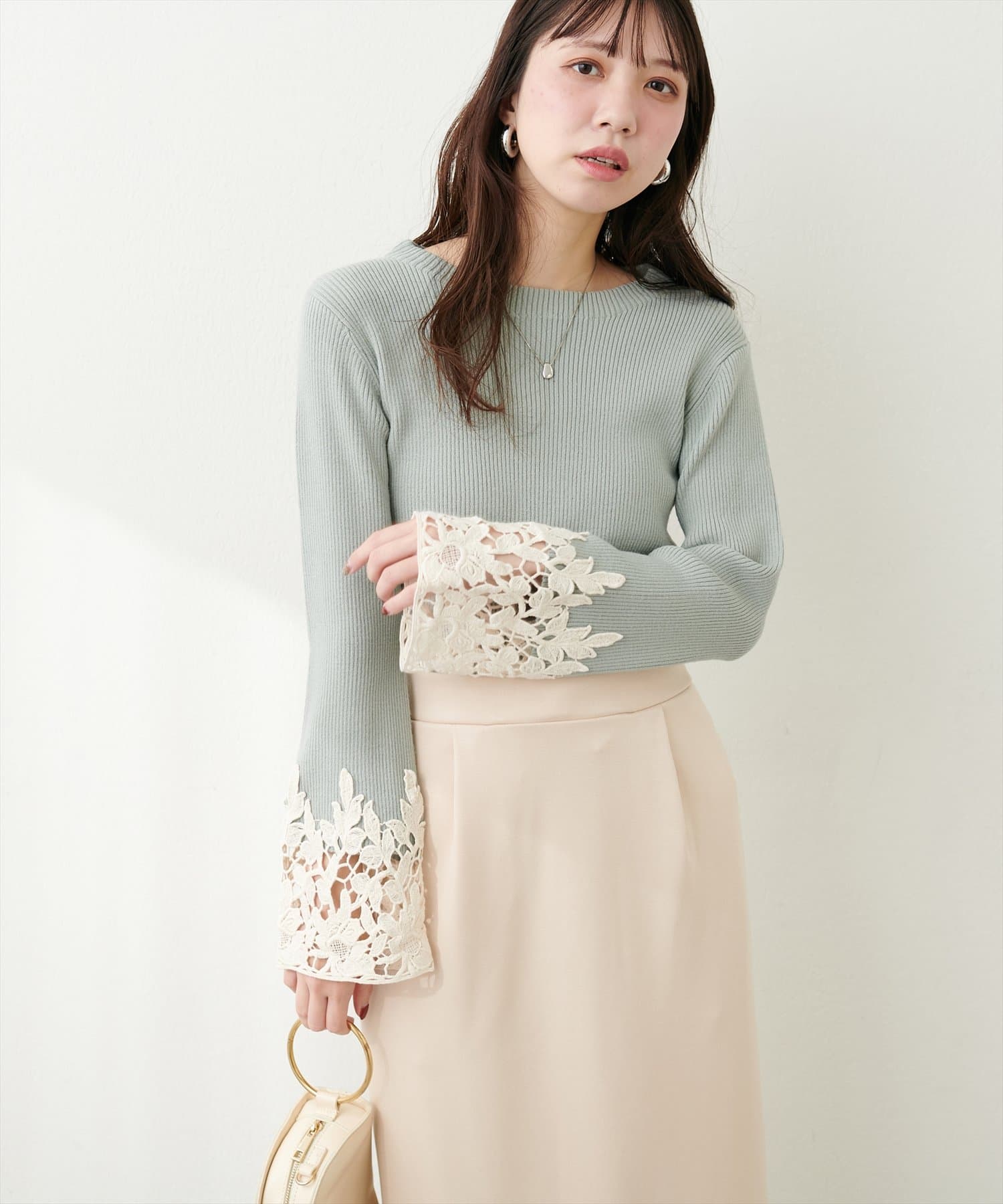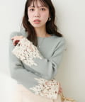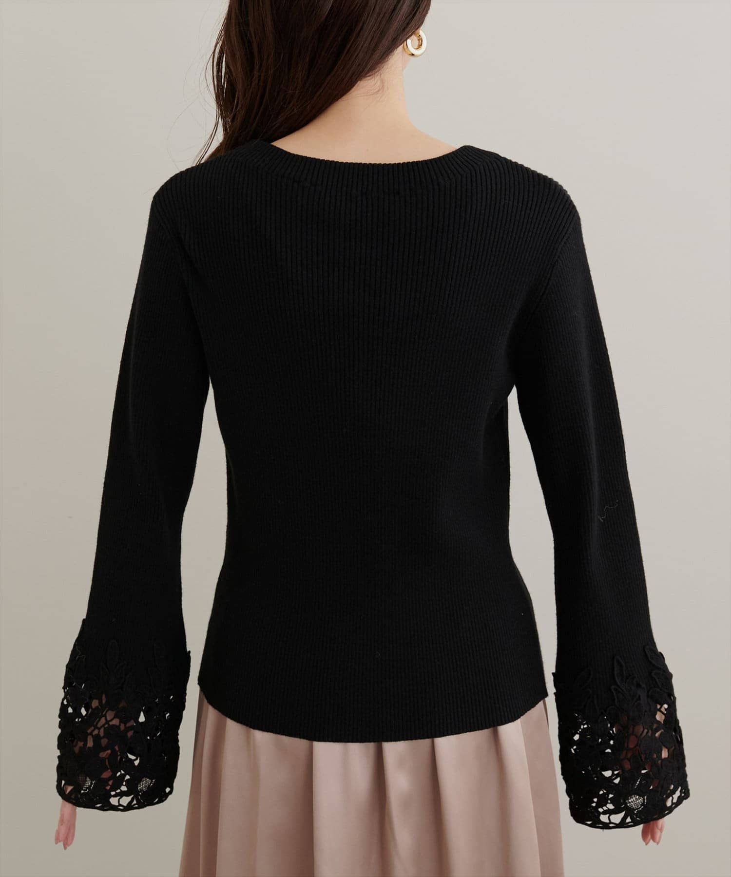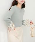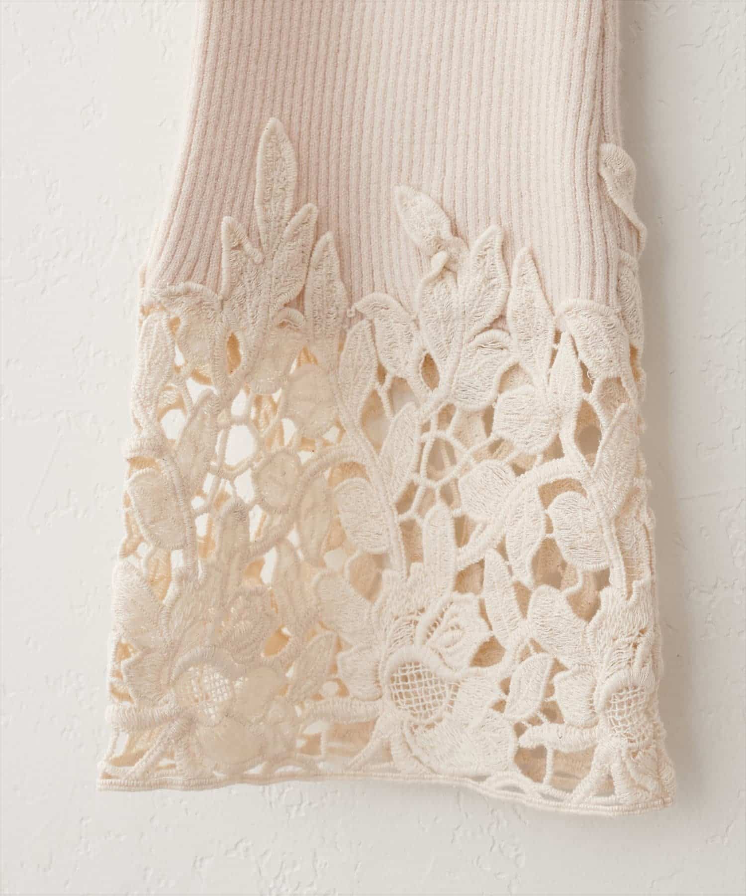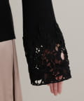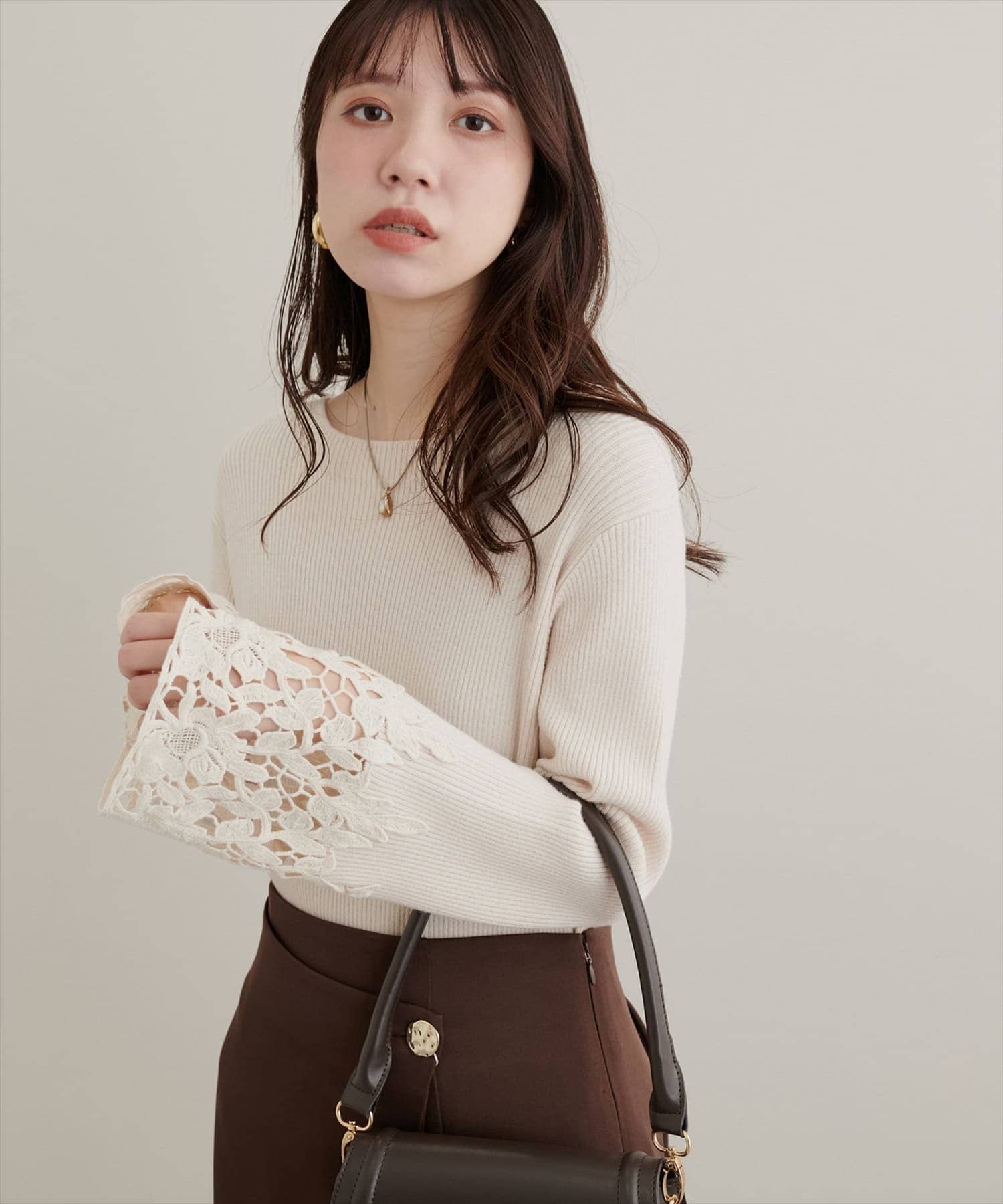 シンプルなリブニットに袖口の刺繍レースが華やかなニット。