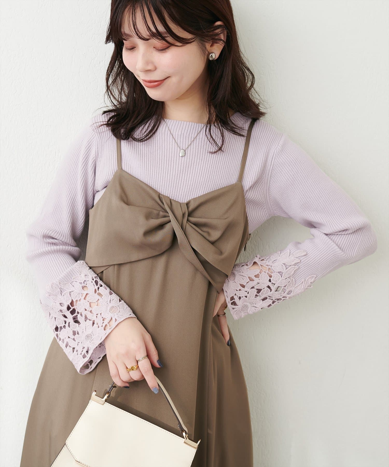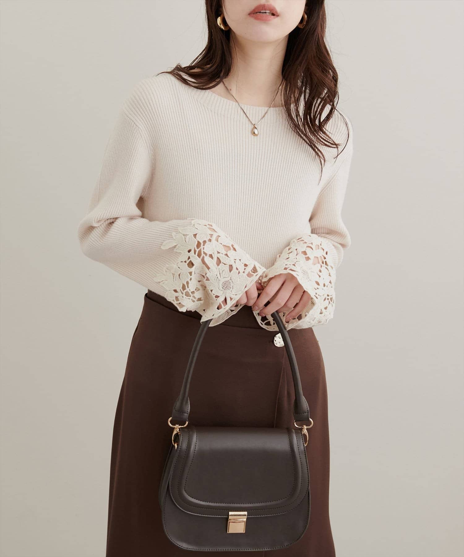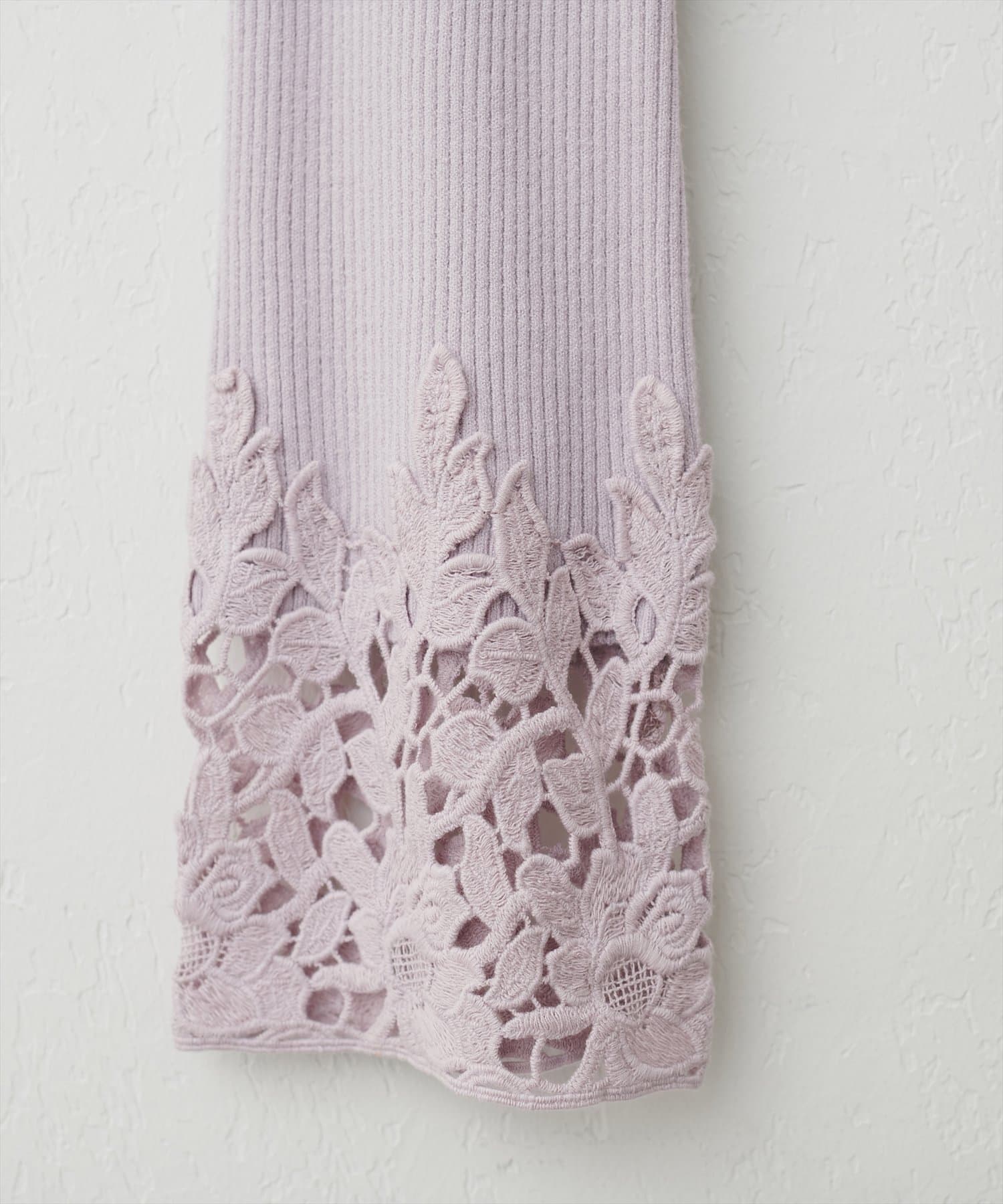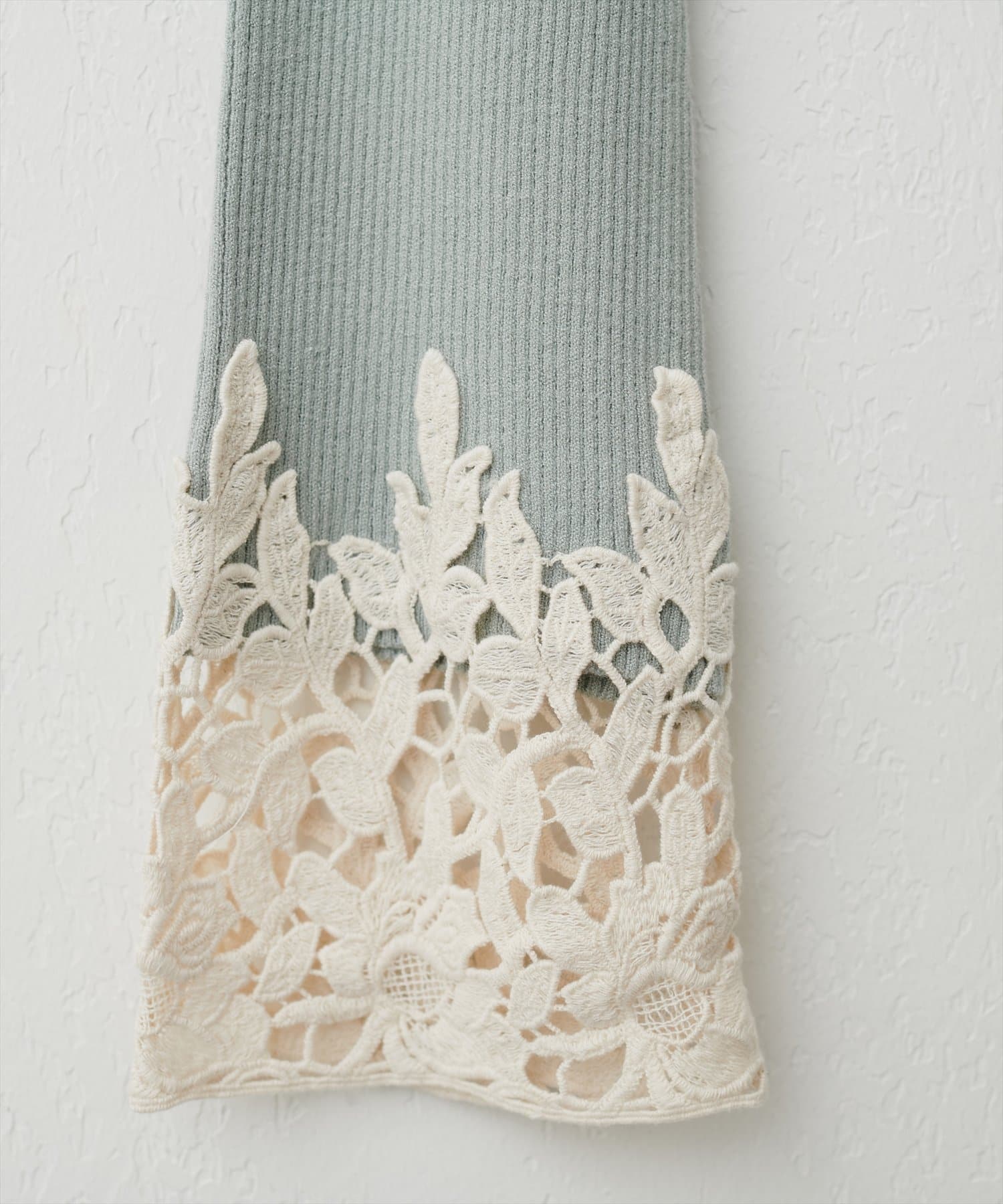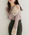 シンプルなリブニットに袖口の刺繍レースが華やかなニット。