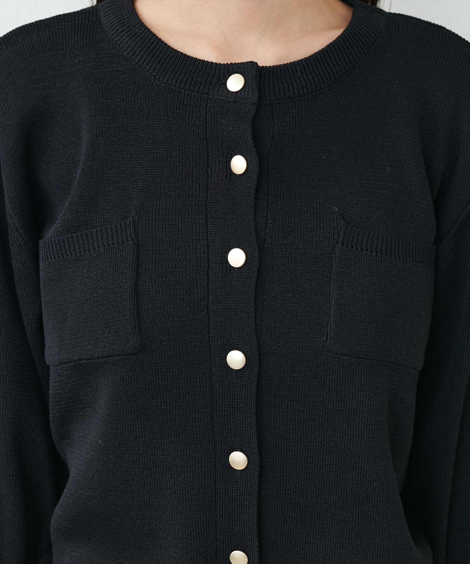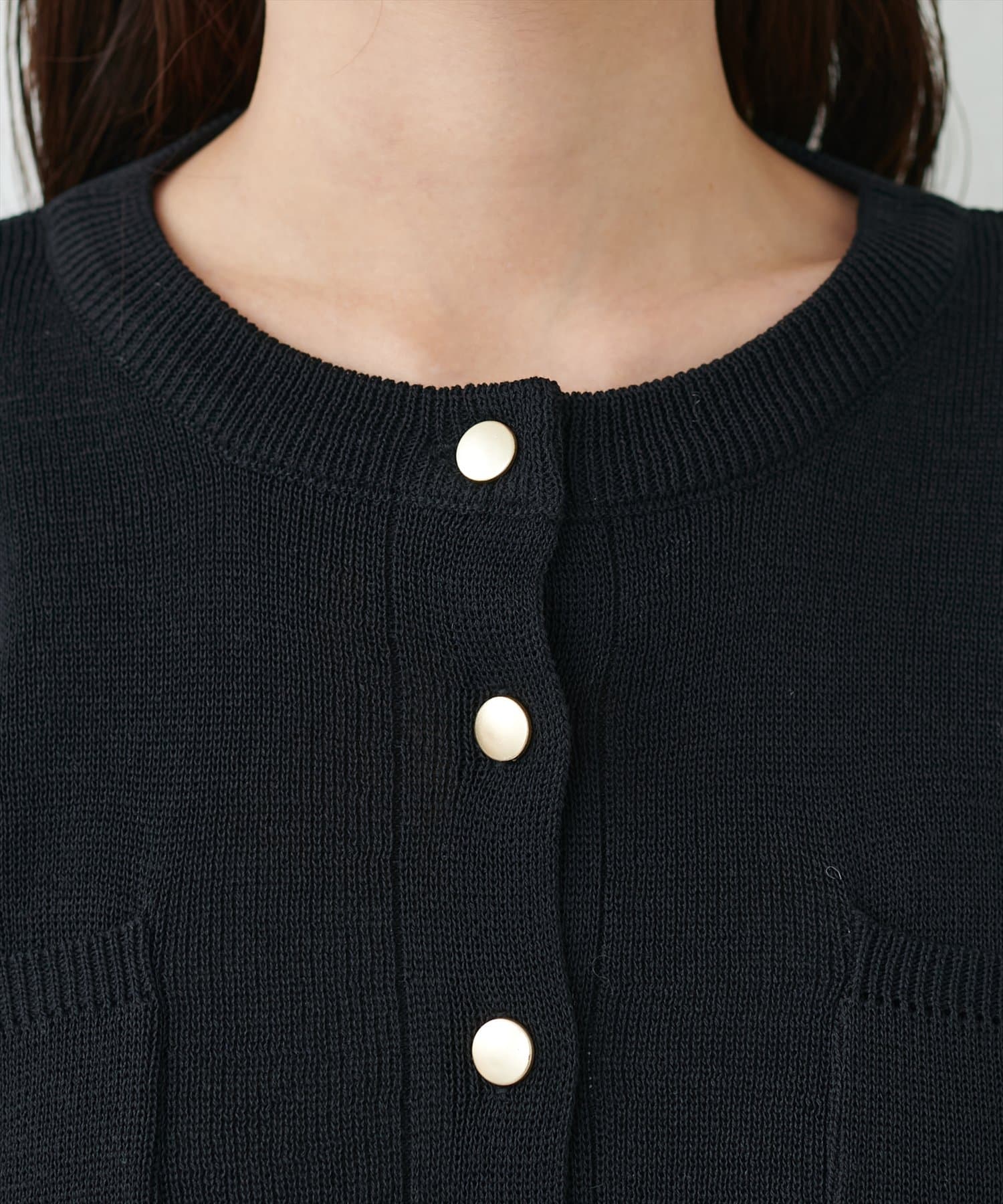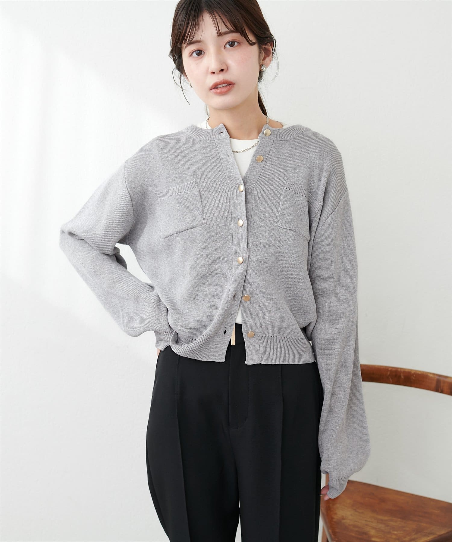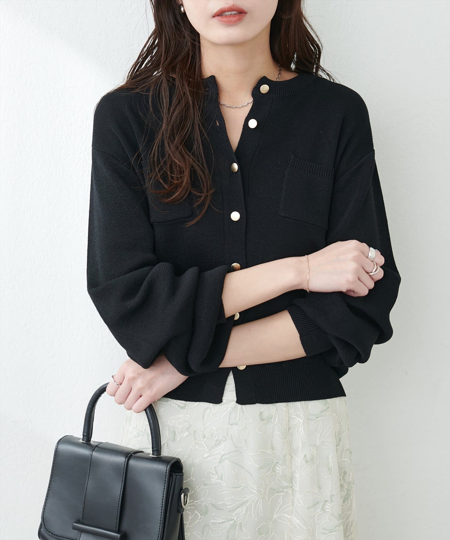 ベーシックで使いやすいデザインにマットな質感の金ボタンをあしらったカーディガン。