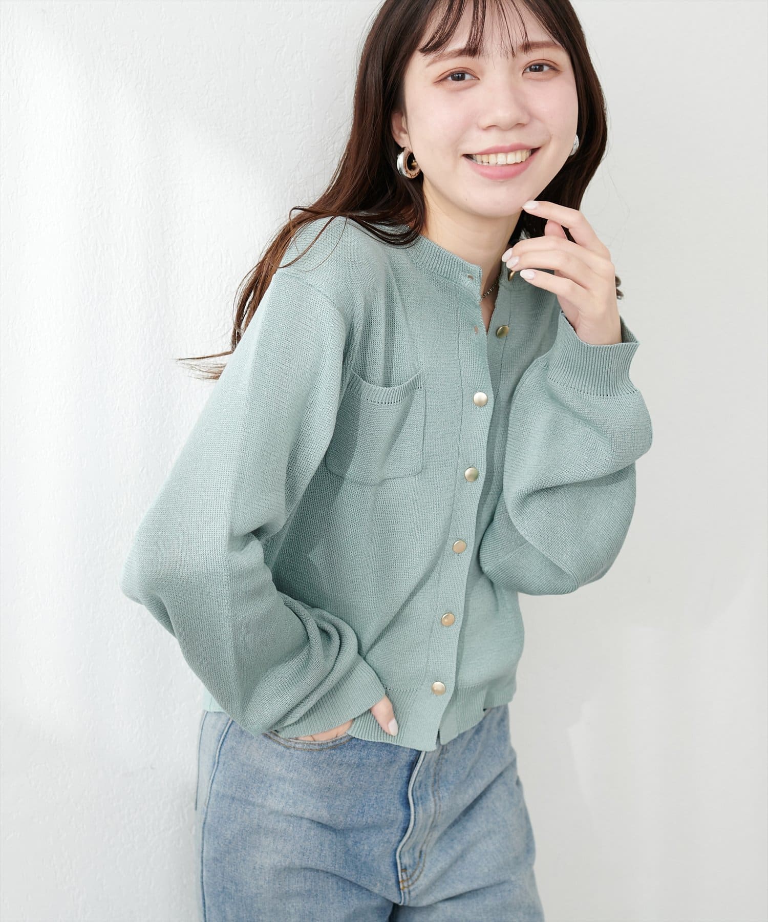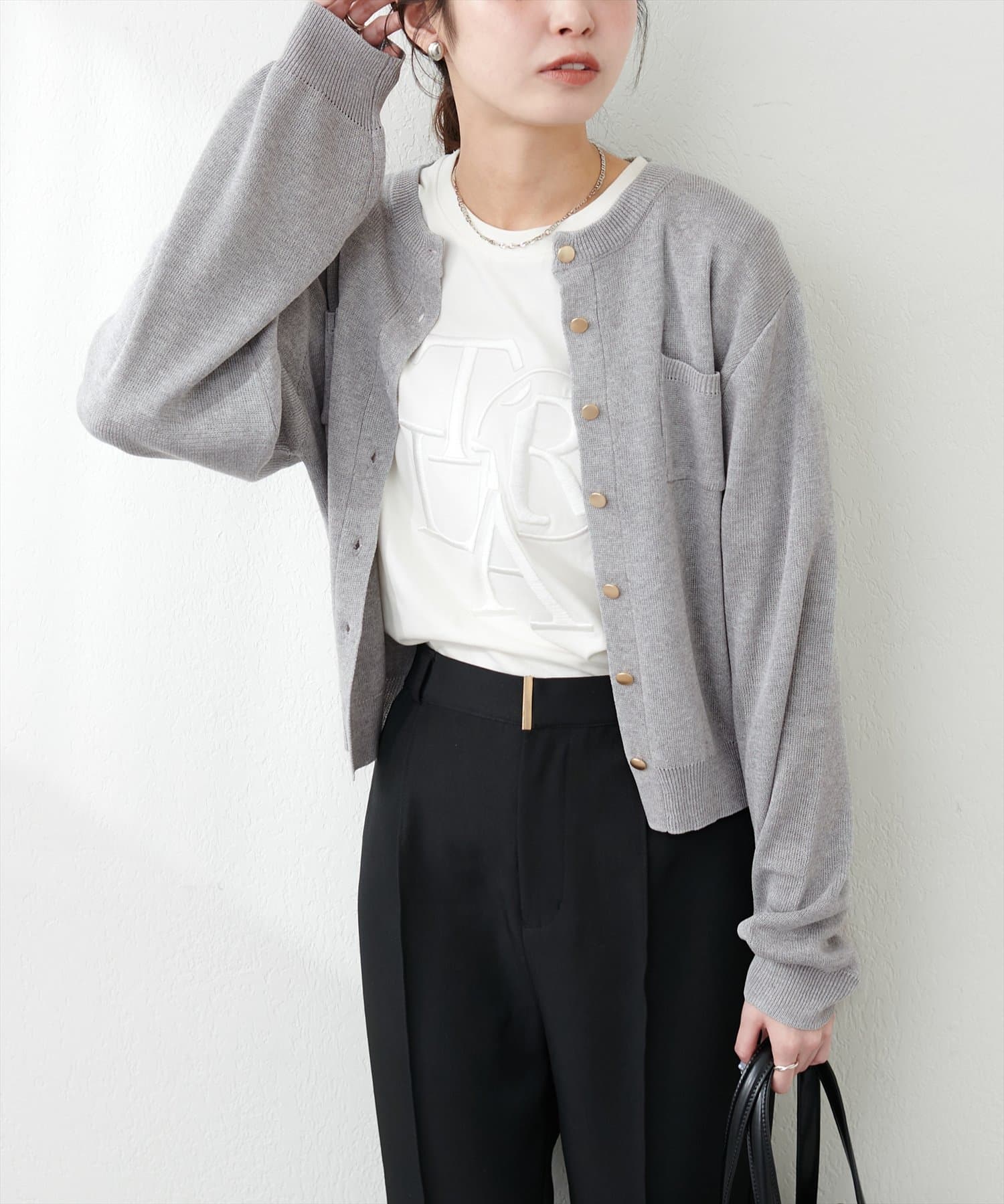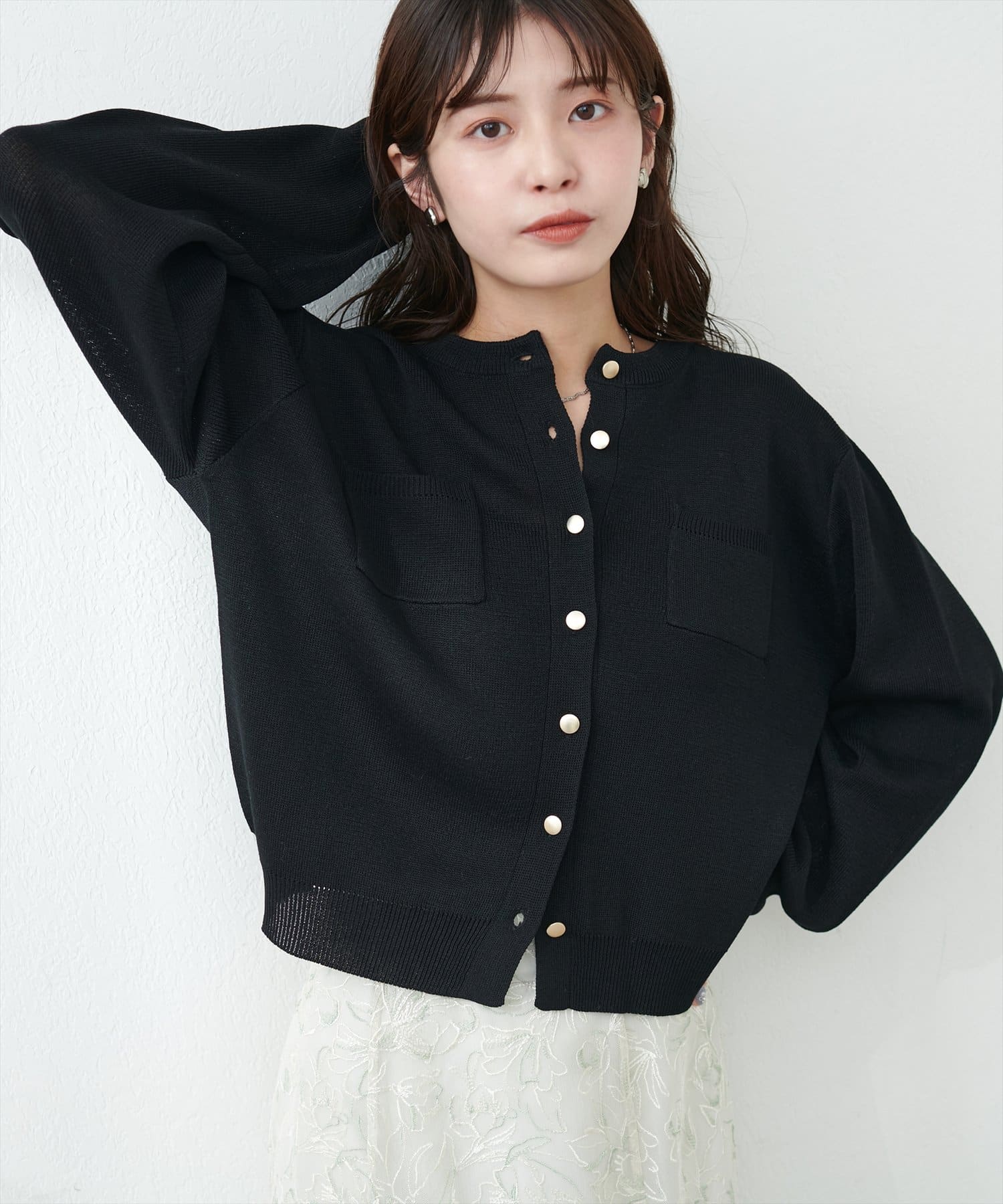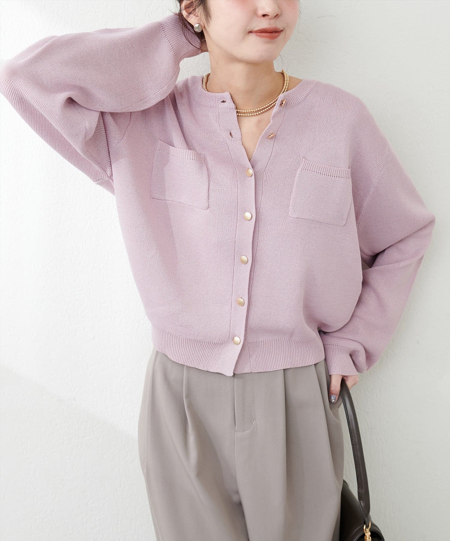 ベーシックで使いやすいデザインにマットな質感の金ボタンをあしらったカーディガン。