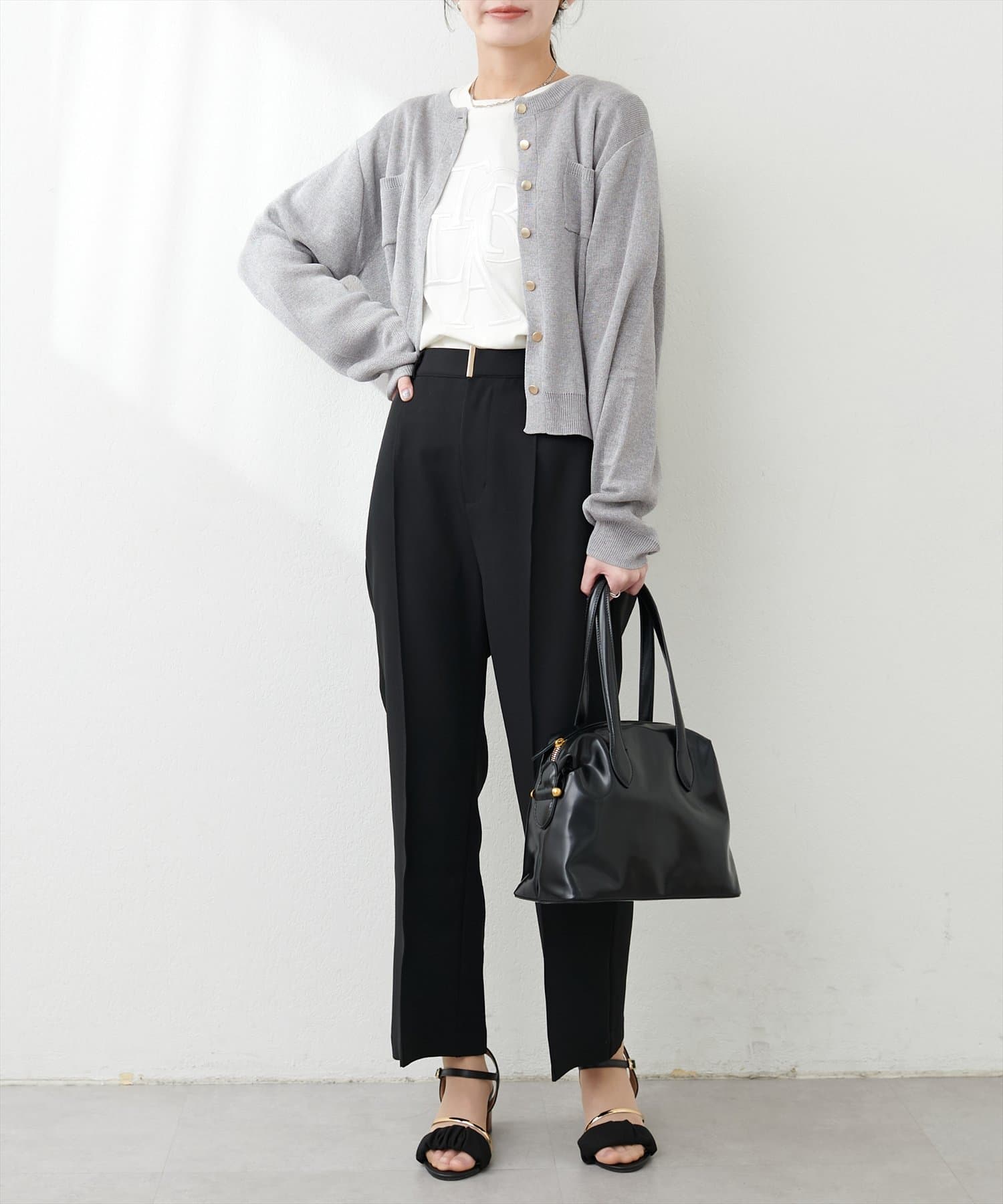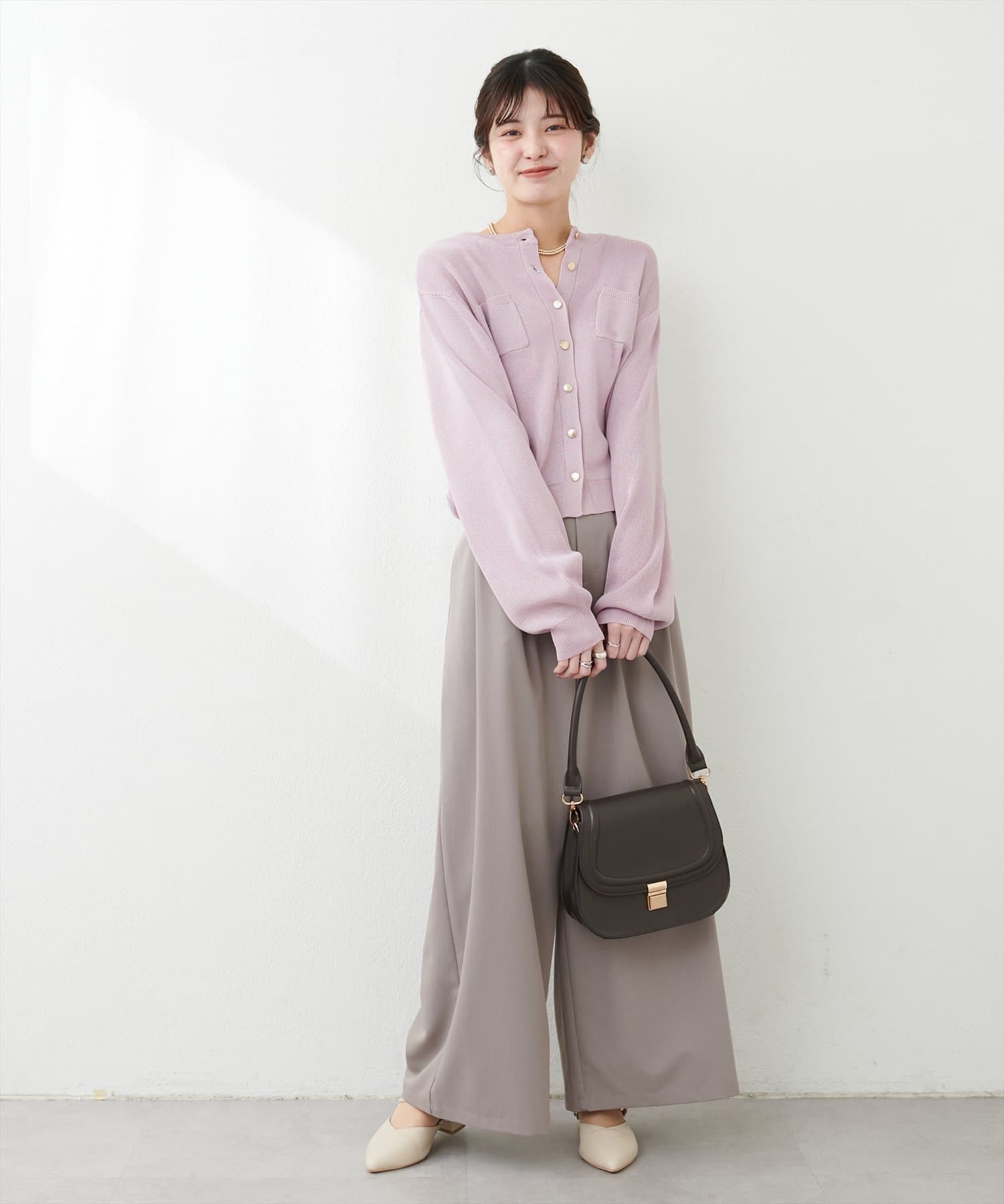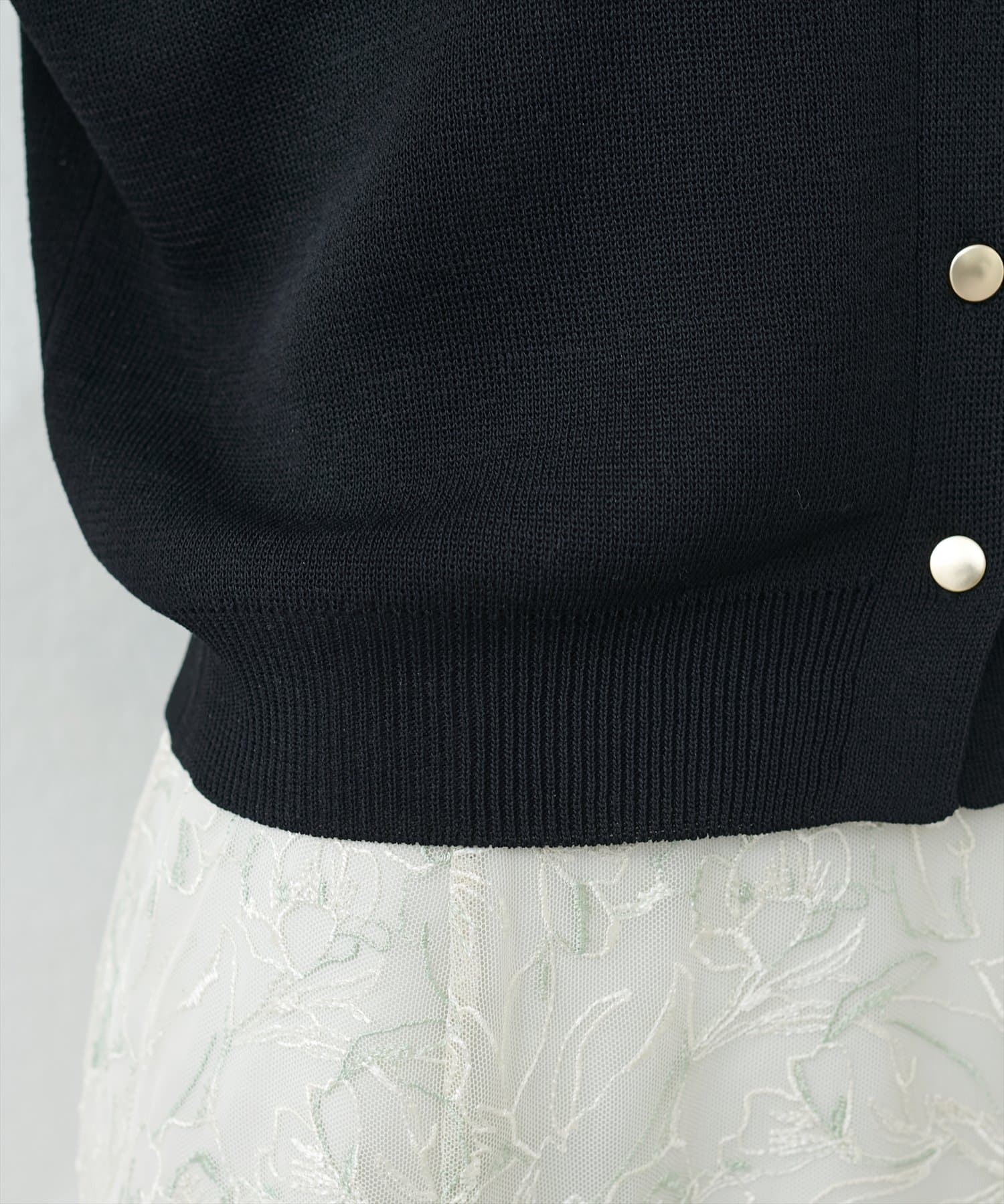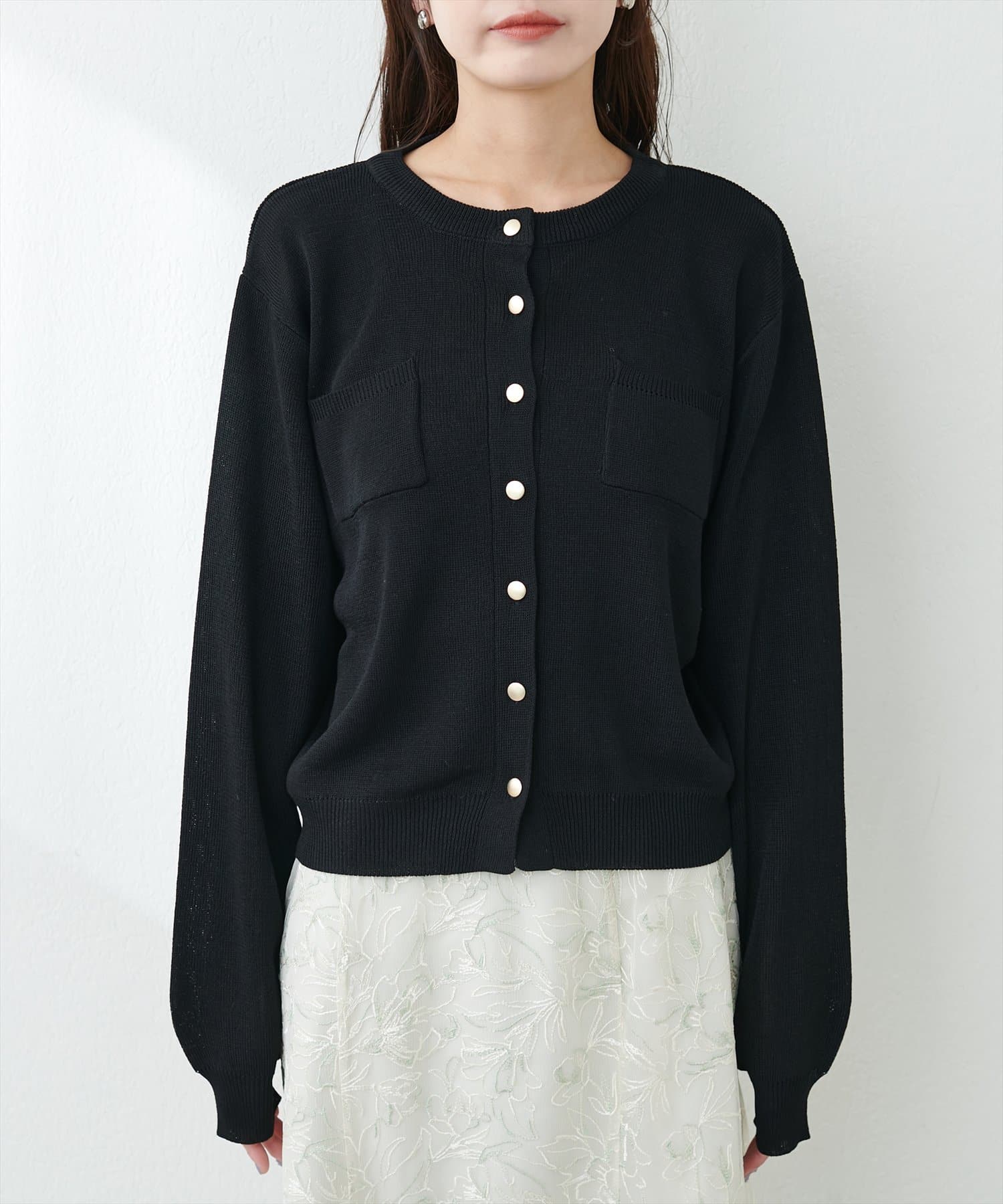 ベーシックで使いやすいデザインにマットな質感の金ボタンをあしらったカーディガン。