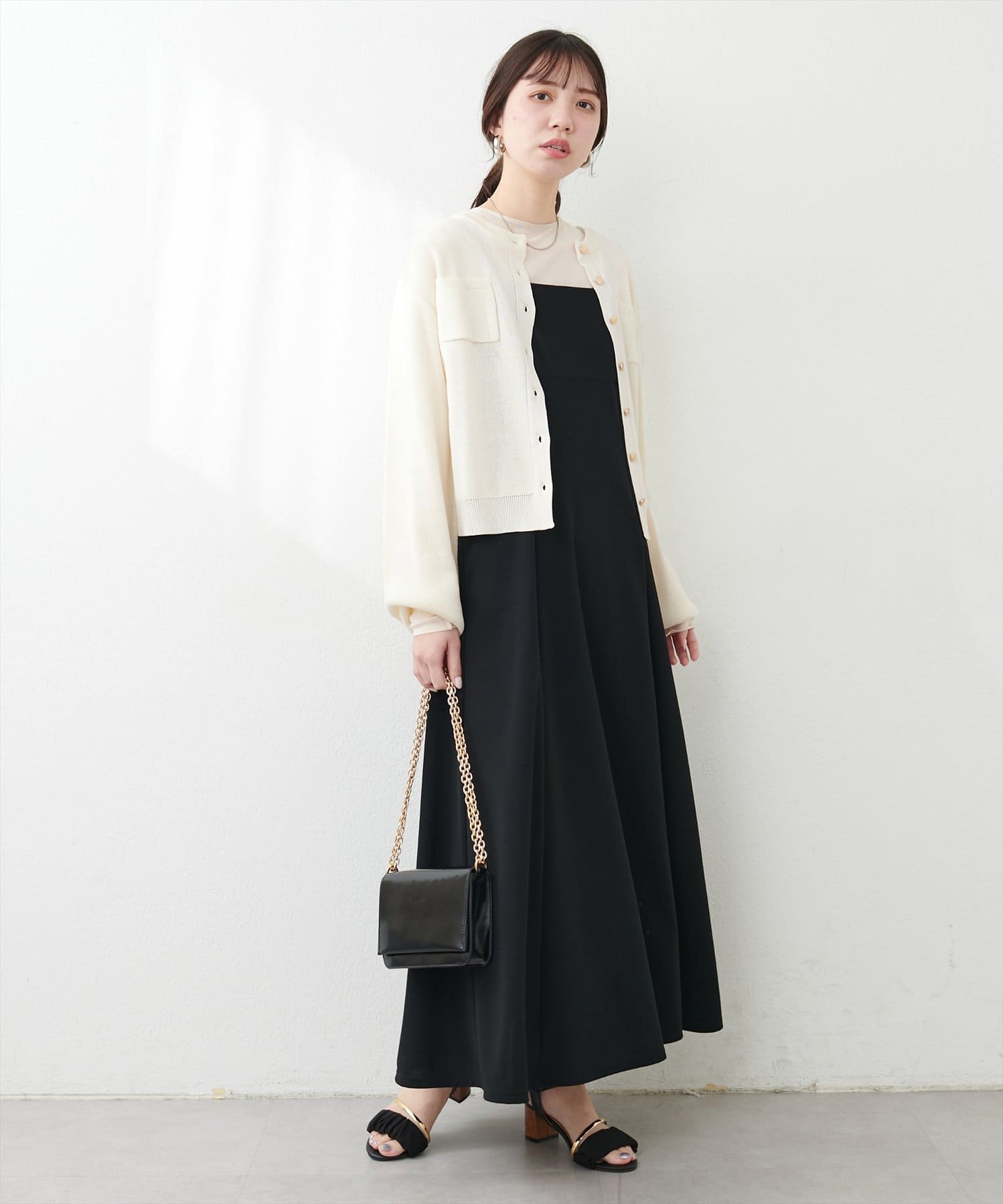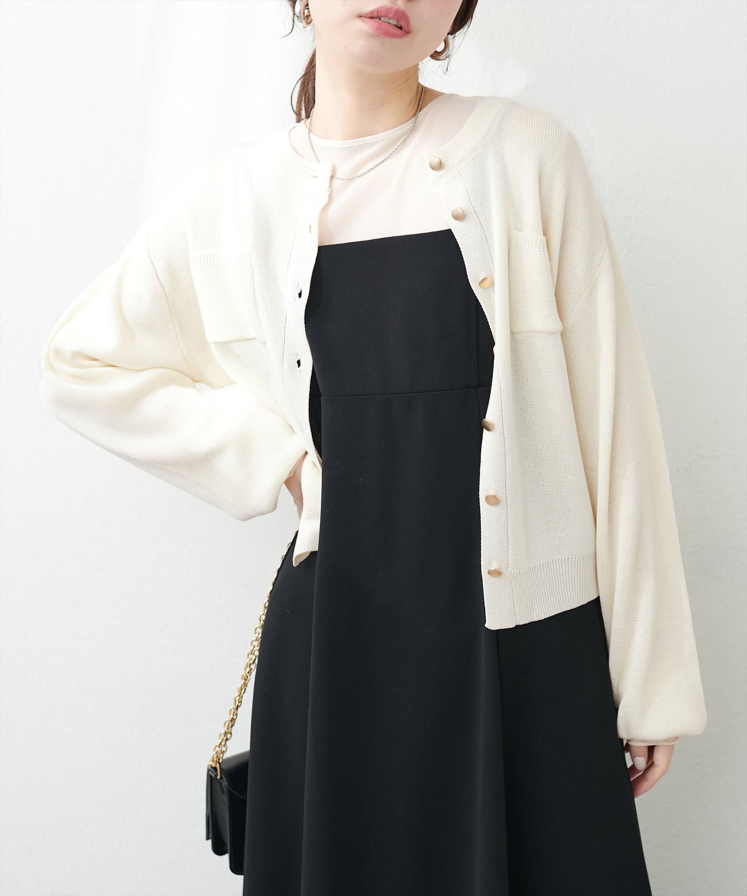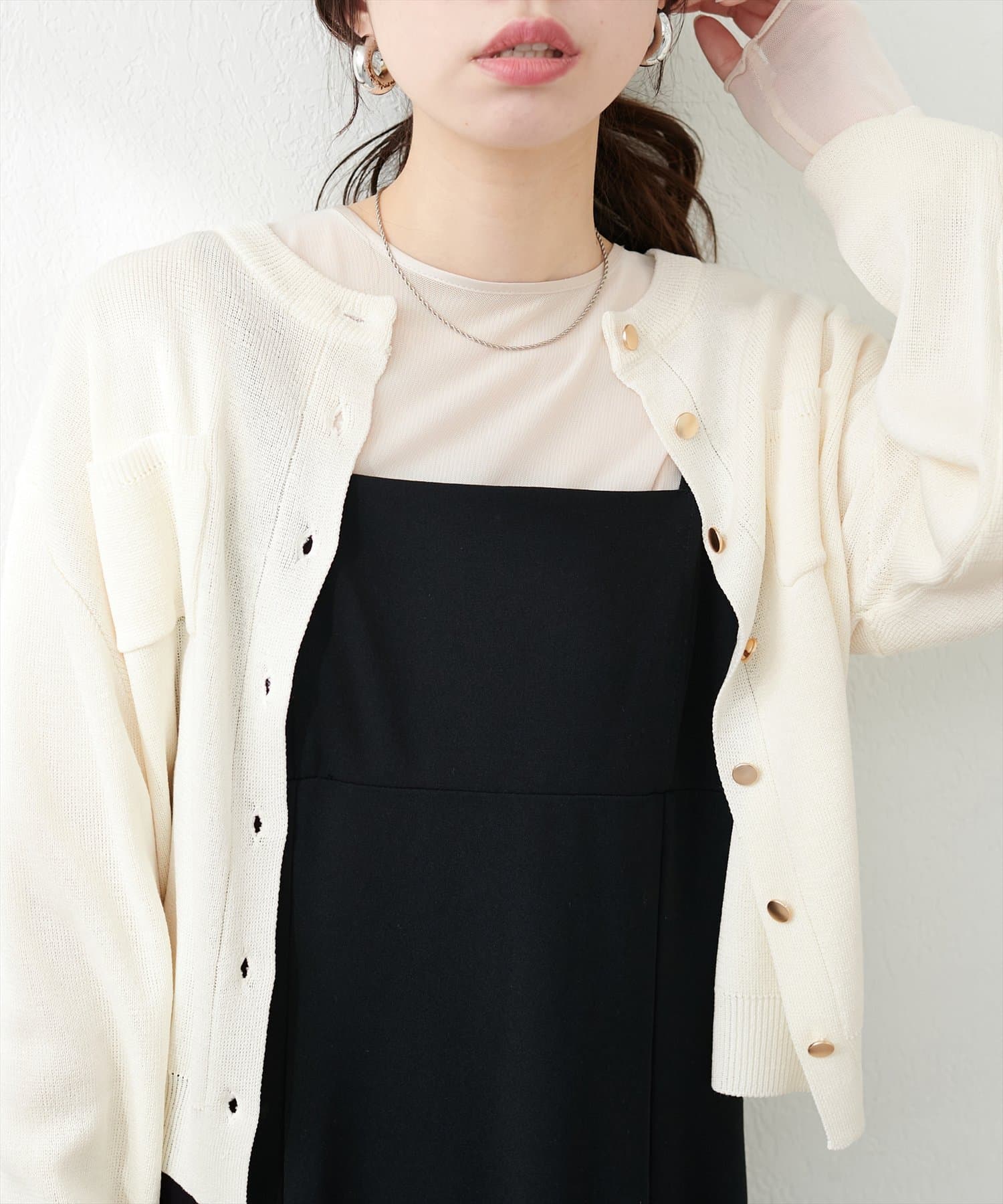 釦を開けて、お好みのキャミソールやタンクトップをインナーに羽織って頂いたり、キャミワンピースと合わせても◎
