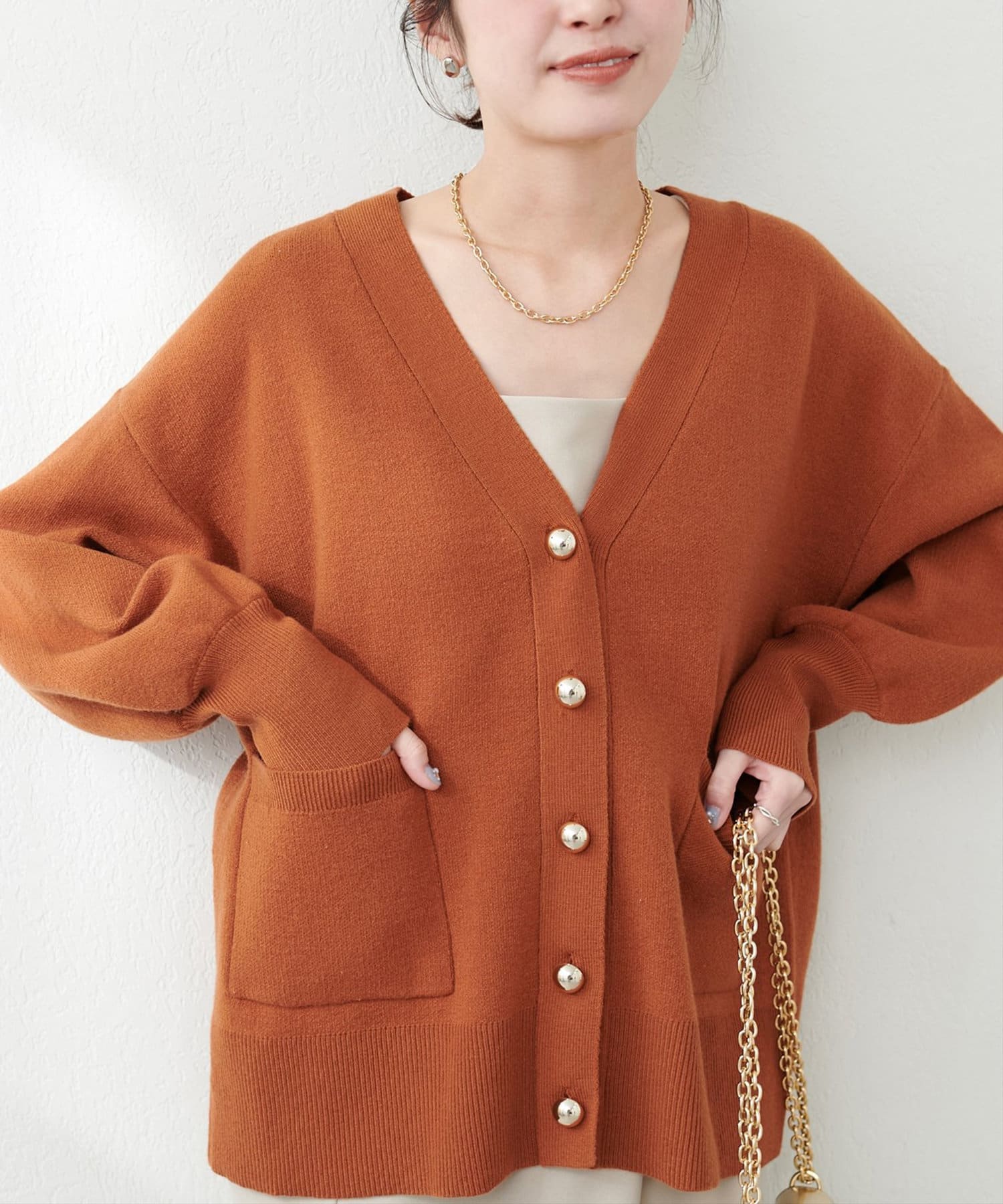 ぷっくりとした金ボタンが特徴のミドル丈カーディガン。
