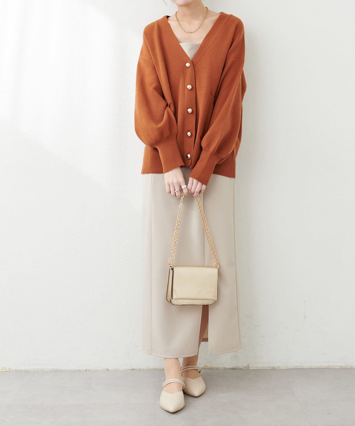 大きくVに開いたカーディガンでどんなトップスやボトムスにも合わせやすく、大活躍なカーディガンです。